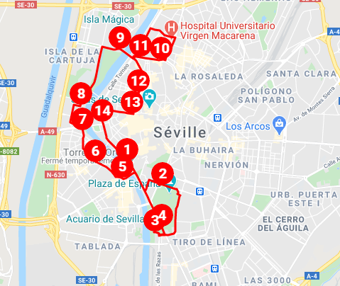 Le souci à Séville ou pas …. ce sont les rues qui sont piétonnes certaines ou très étroites pour les autres …. donc je ne trouve pas aussi intéressant de prendre le bus que dans certaines autres villes….même si c’est un promène touriste, je trrouve chouette de faire un tour en début de séjour et ensuite d’approfondir les jours suivants…. mais là, je ne le conseillerai pas.
