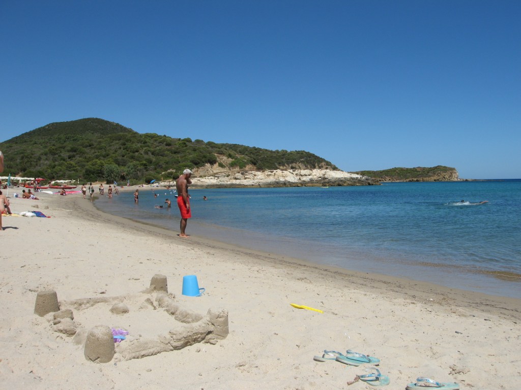 C’est la plage de la petite ville de Pula, nous y sommes allés 2-3 fois mais il y avais pas mal de monde. PAR CE QUE L’ON SE DIT TOUT il y a deux choses a prendre impérativement pour aller à la plage en Sardaigne, soit une glacière et un parasol. Sur le parasol on attachera une ficelle reliée à la glacière car le vent souffle toujours en Sardaigne, ce qui permet aussi d’avoir moins chaud. Autrement les températures de l’air au mois d’août sont de 32 ° et de l’eau 25° donc boissons fraîches et parasol sont indispensables.