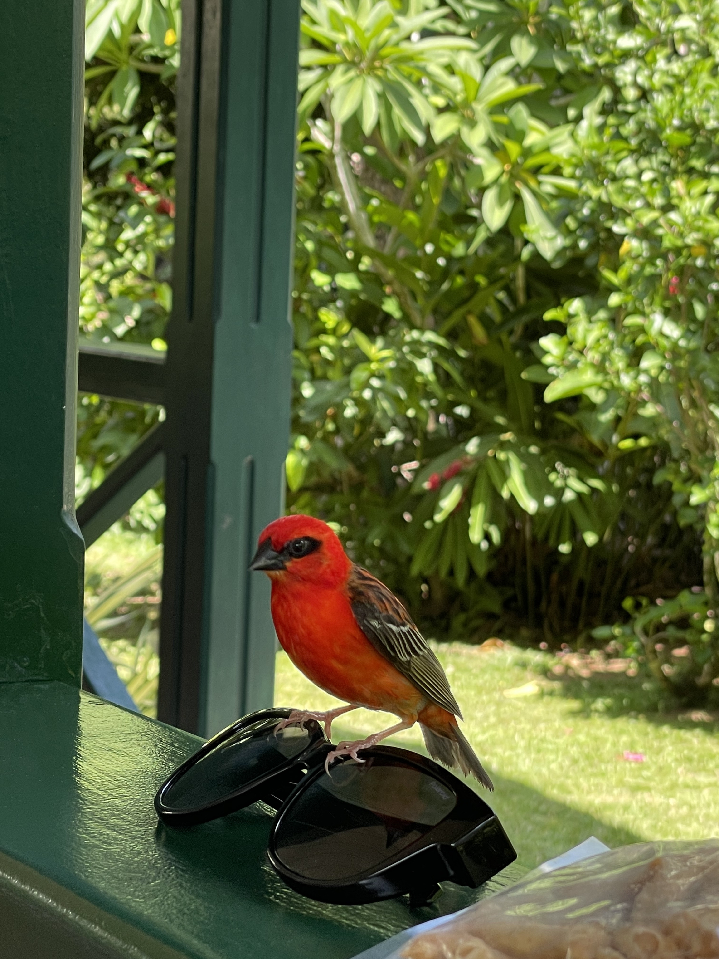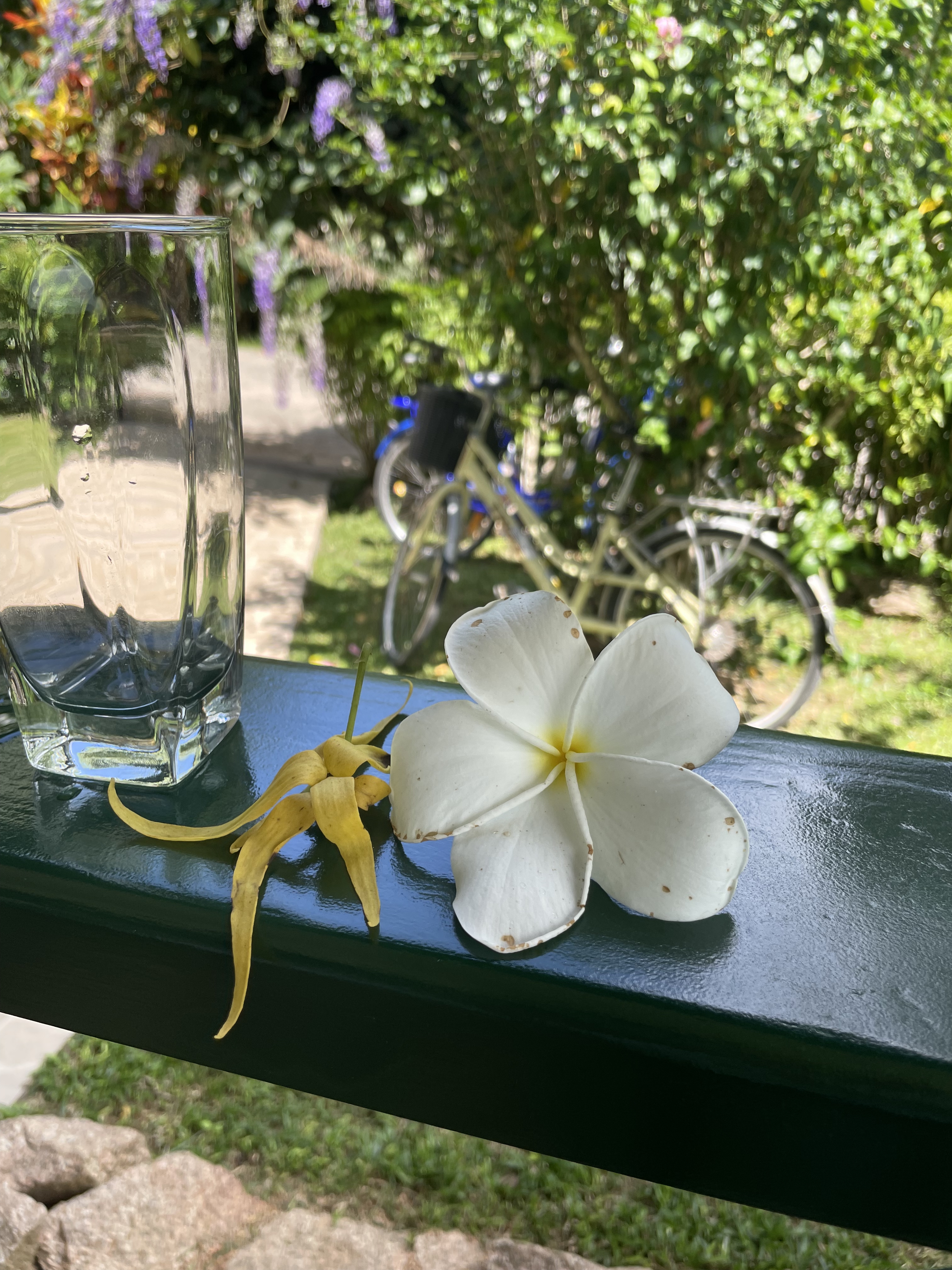 Petite fleurs de frangipanier et de ylang ylang … et visite de Titi qui vient 2 fois par jour mendier du pain.