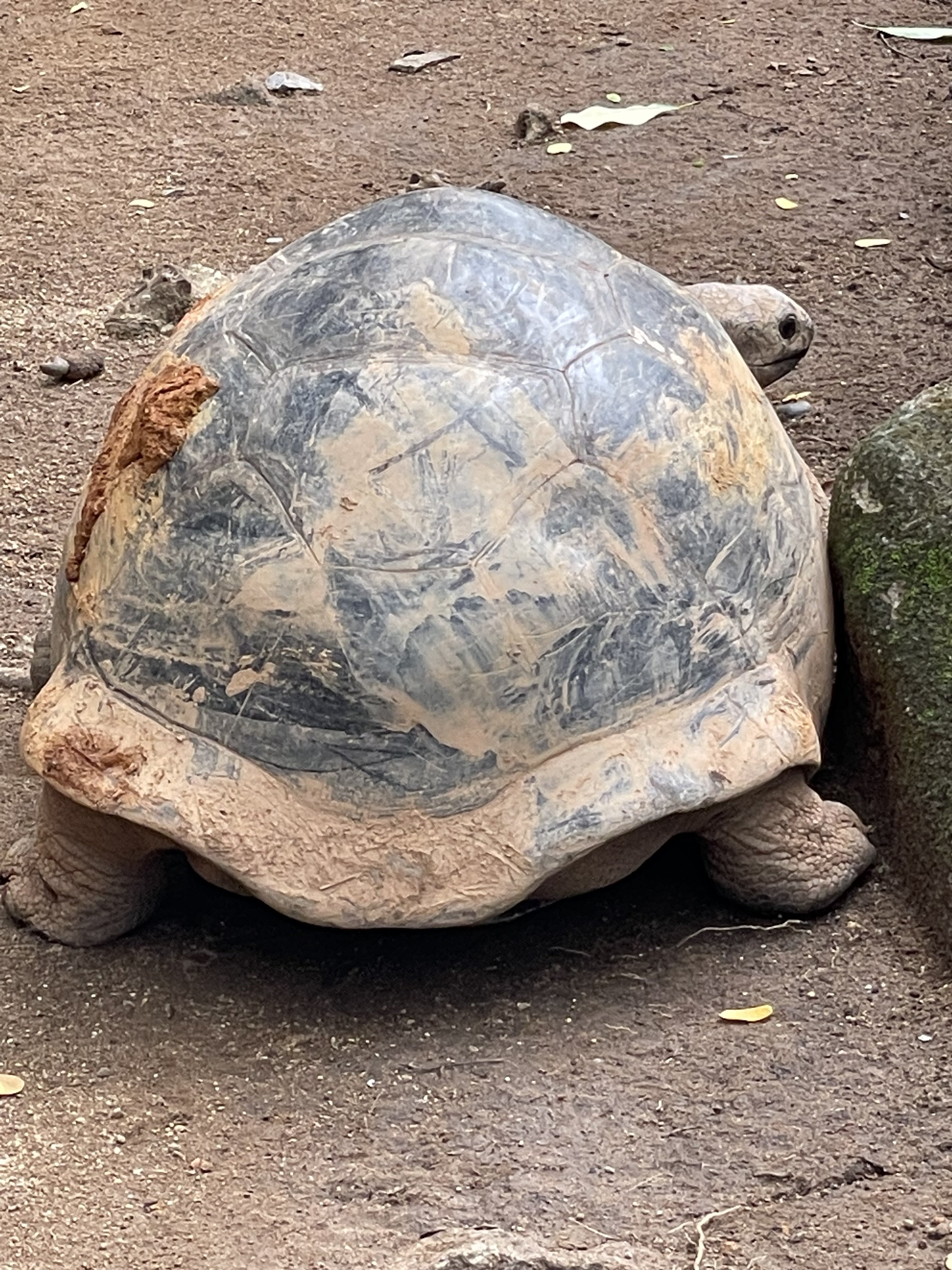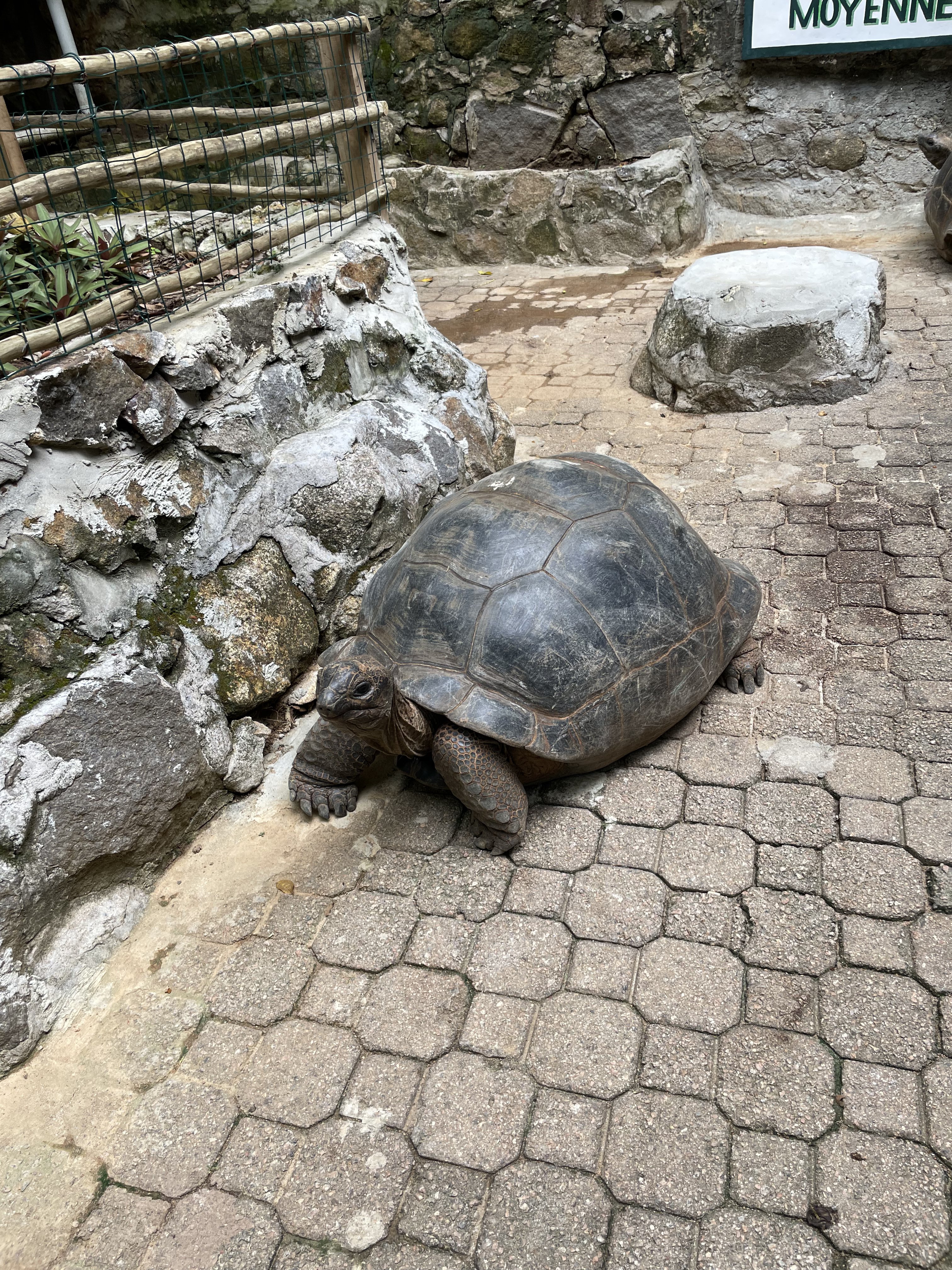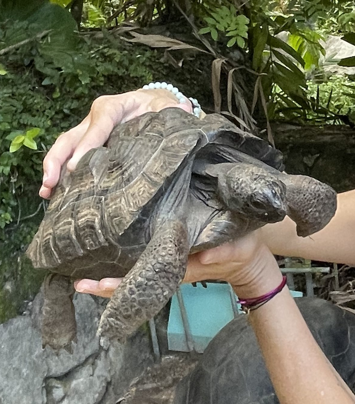 Il faisait super chaud et nous n’étions plus très réceptifs quand un employé et venu vers nous et nous a proposé de nous montres des surprises …. bon ok on vous suit. Il nous emmène vers une palissade qui une fois franchie nous laisse devant l’infirmerie et nurserie du jardin. Nous avons pu porter des bébés tortues de terre et marines ayant que 4 jours. Puis une torture terrestre de 10 ans …. une petite explication pour caresser une torture géante, il faut tapoter gentiment sur l’arrière de sa carapace, de ce fait elle va sortir sa tête et vous pourrez la caresser sous le cou, elle adore ça ….