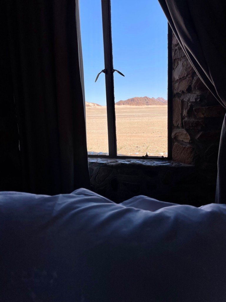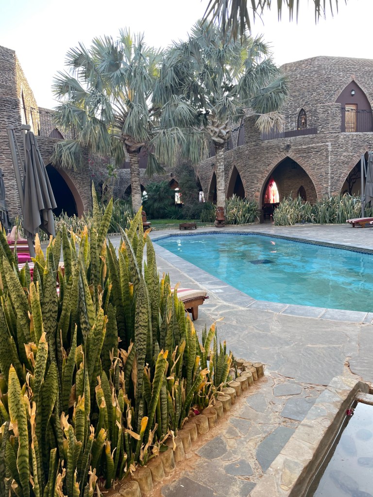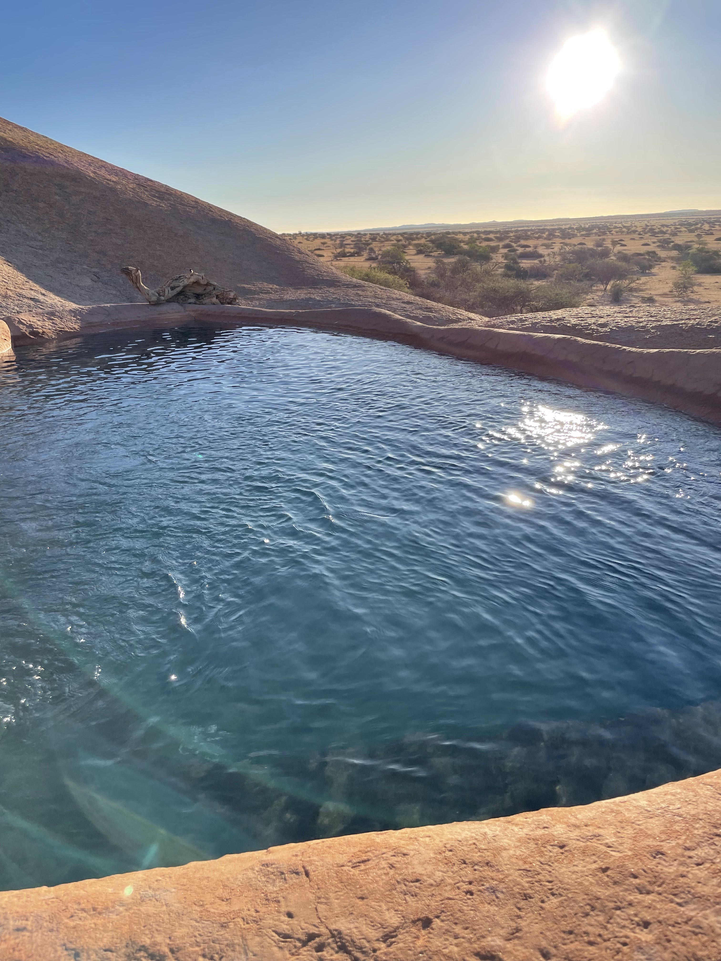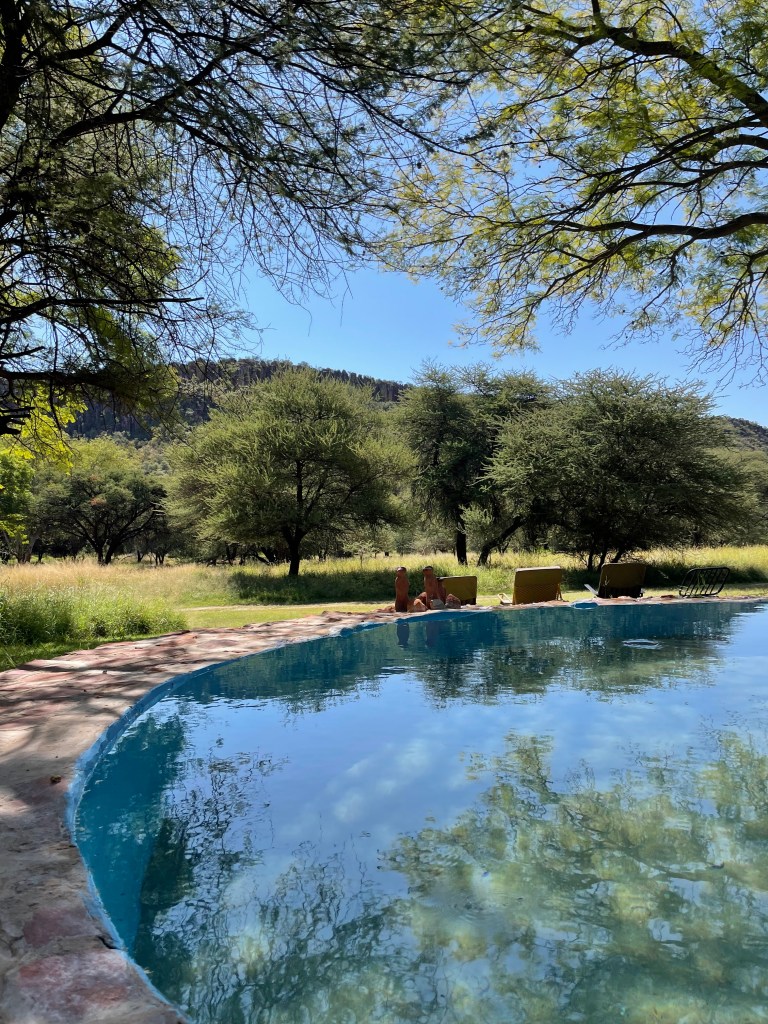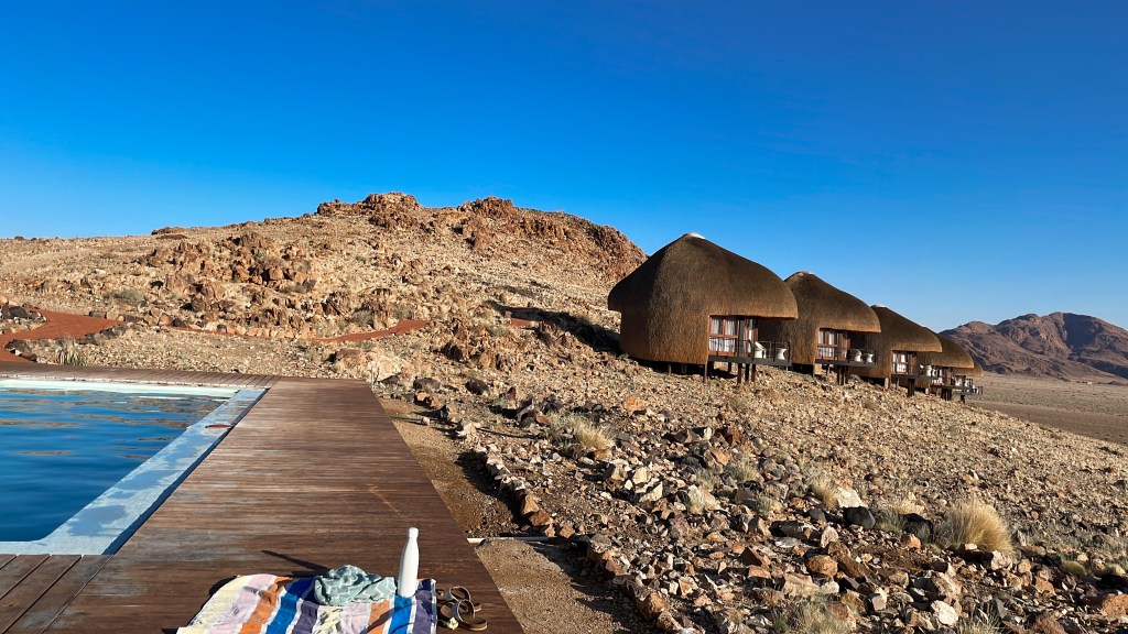 L’émerveillement tout au long du séjour, les lodges, le repas mais aussi le paysage grandiose avec un spectaculaire coucher de soleil sur le Namib. A noter qu’il y a une piscine mais qu’elle n’est pas chauffée ( et heureusement….) donc au mois de mai, ce sont uniquement les courageux qui s’y risquent.