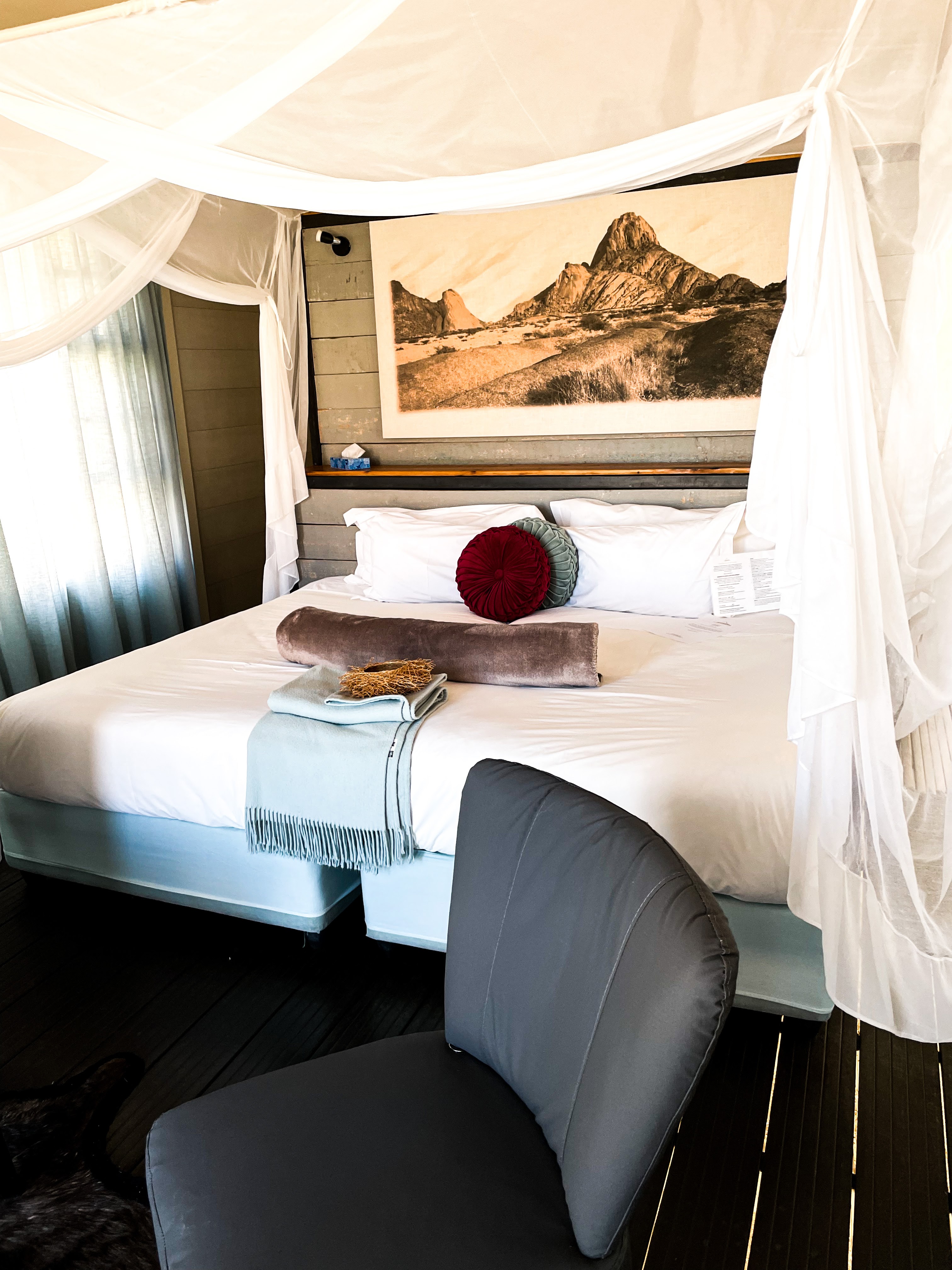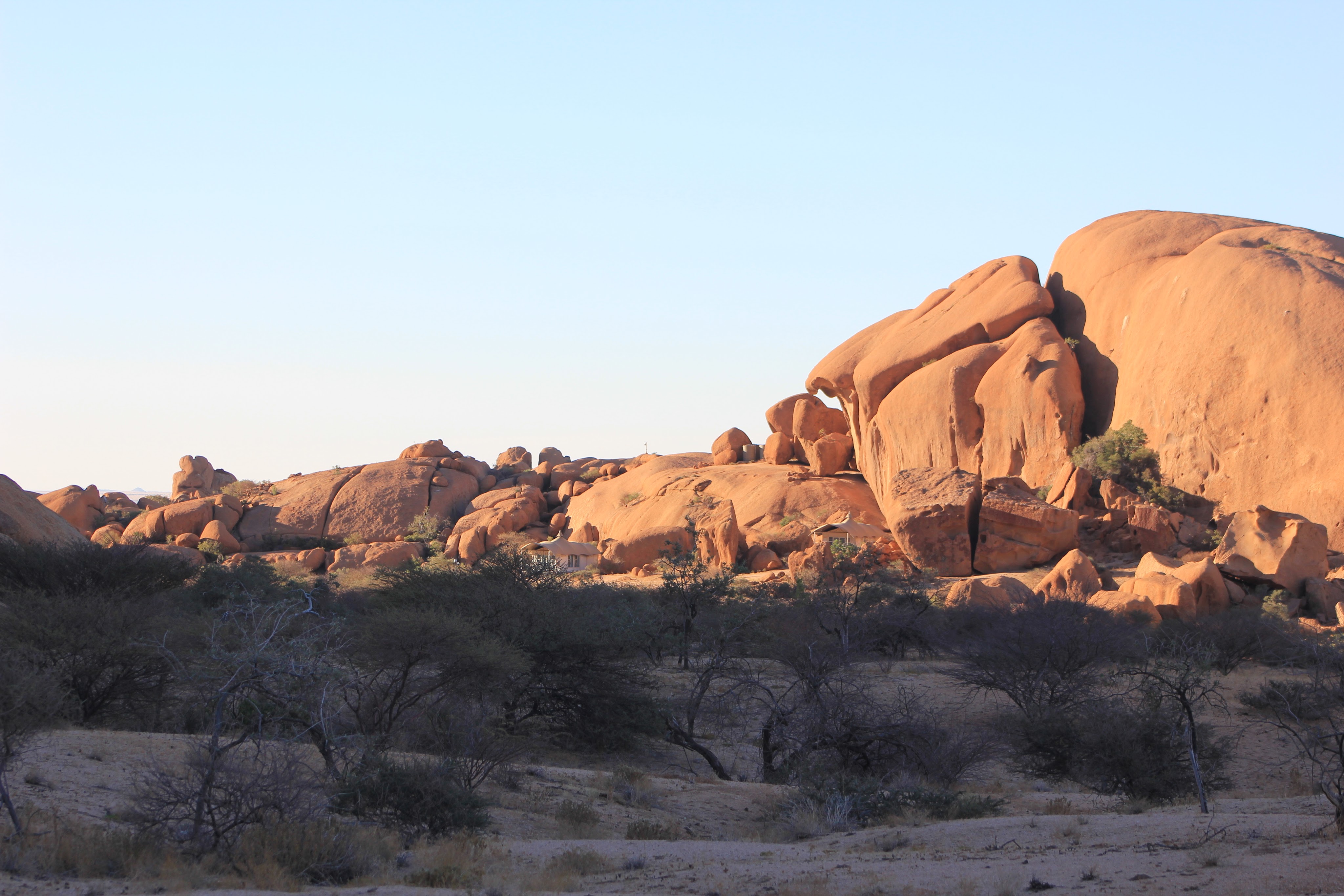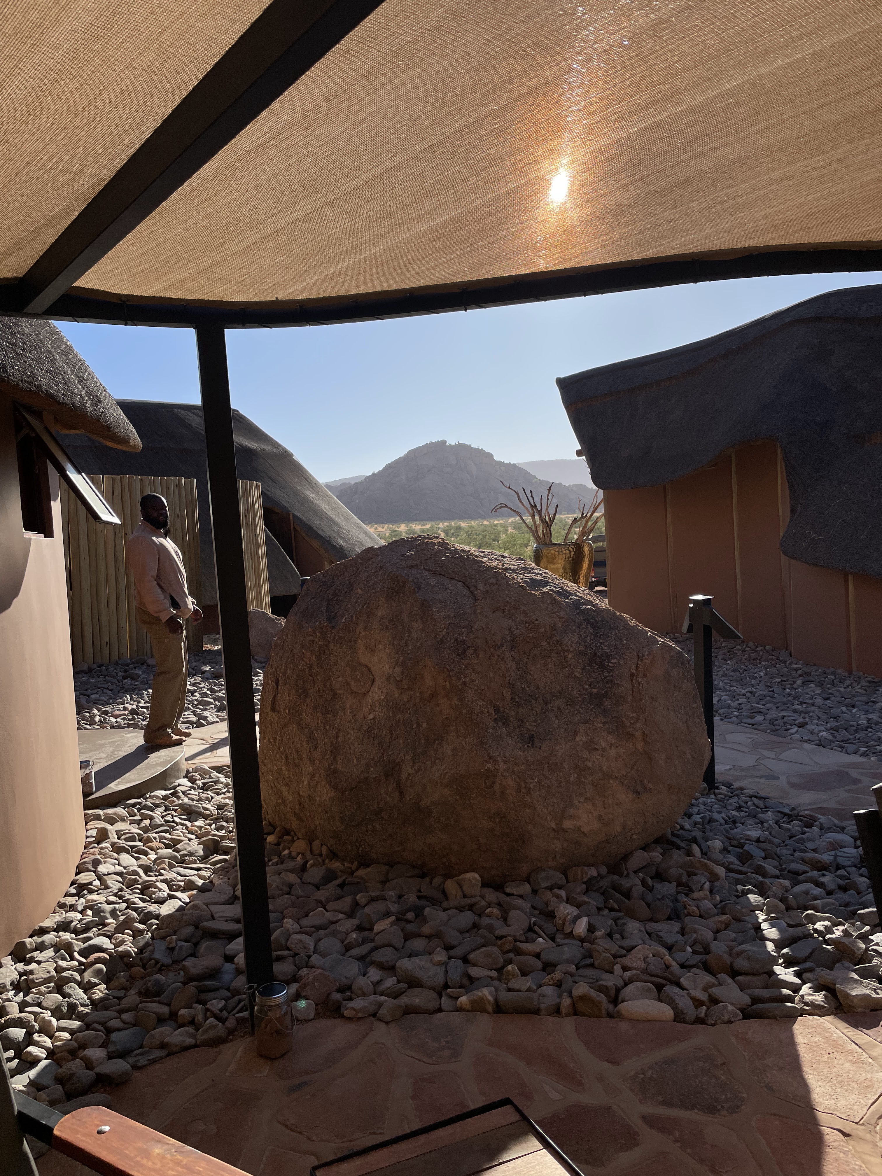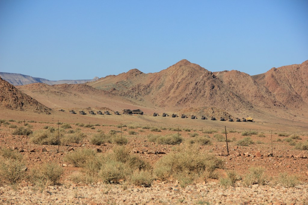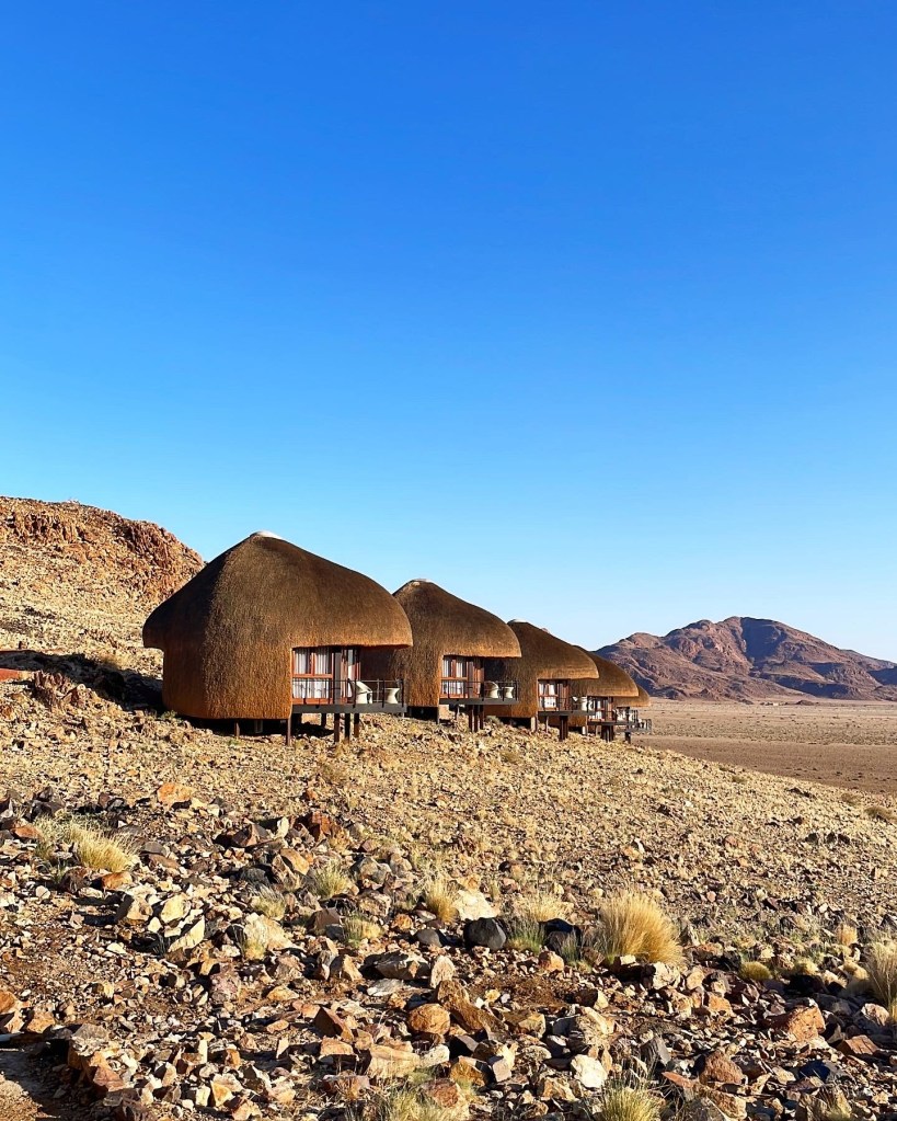 Il ne nous reste plus beaucoup de route pour arriver dans la réserve où se situe notre deuxième hôtel. Nous sommes au pied d’une chaîne de petites montagnes dont le Mont Naukluft qui est constitué de roches volcaniques datant d’un milliard d’année. Au milieu d’une longue ligne droite, nous apercevons de loin les petits chalets à toits de chaume. Mon premier coup de coeur par écran interposé et sur place, c’est au delà de mes espérances.