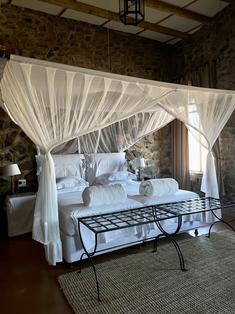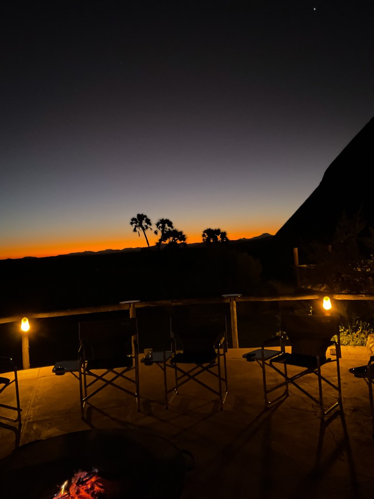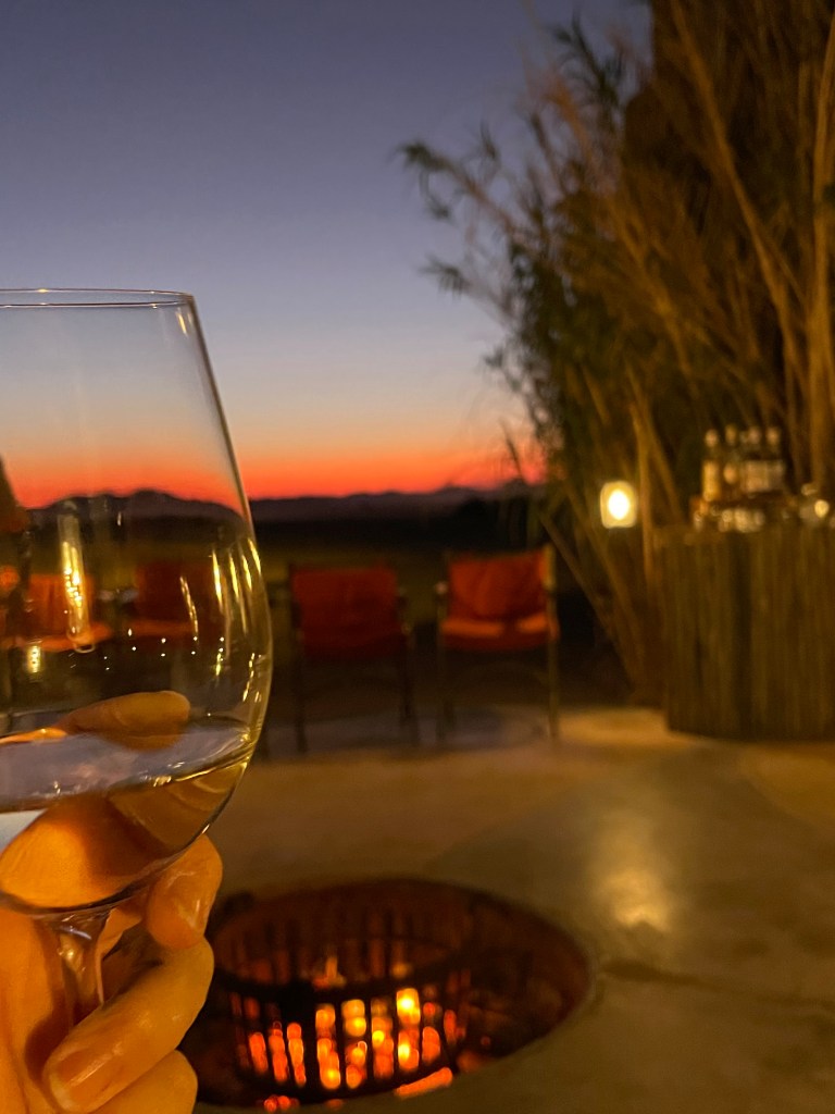 Les chambres sont incroyables et son petit coin brasero -coucher de soleil avec un cocktail ou un verre de Chenin blanc est juste fabuleux. Tout ça avant un incroyable repas où tous les plats sont succulents. Un dernier verre au son des cris des chacals que l’on aperçoit roder autour de l’hôtel et nous sombrons de sommeil après cette journée qui restera à jamais dans ma mémoire.