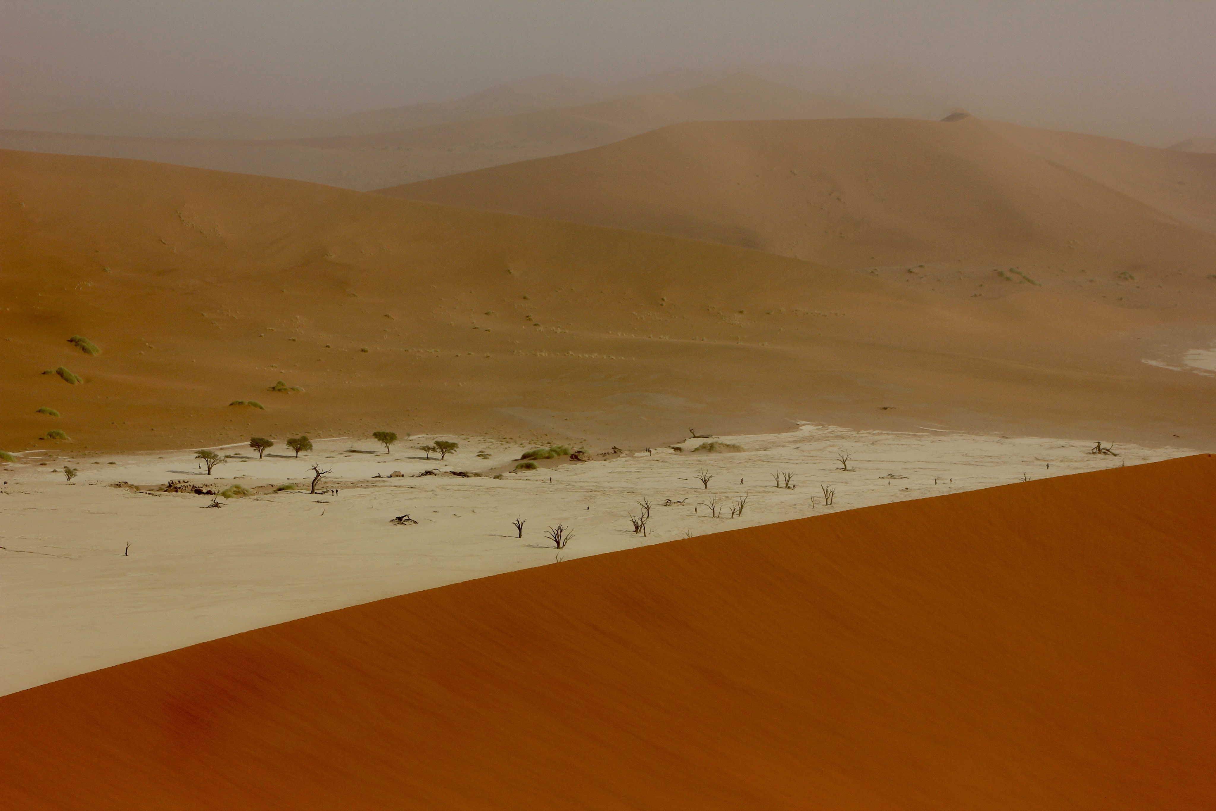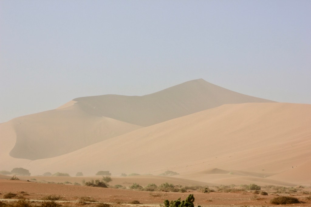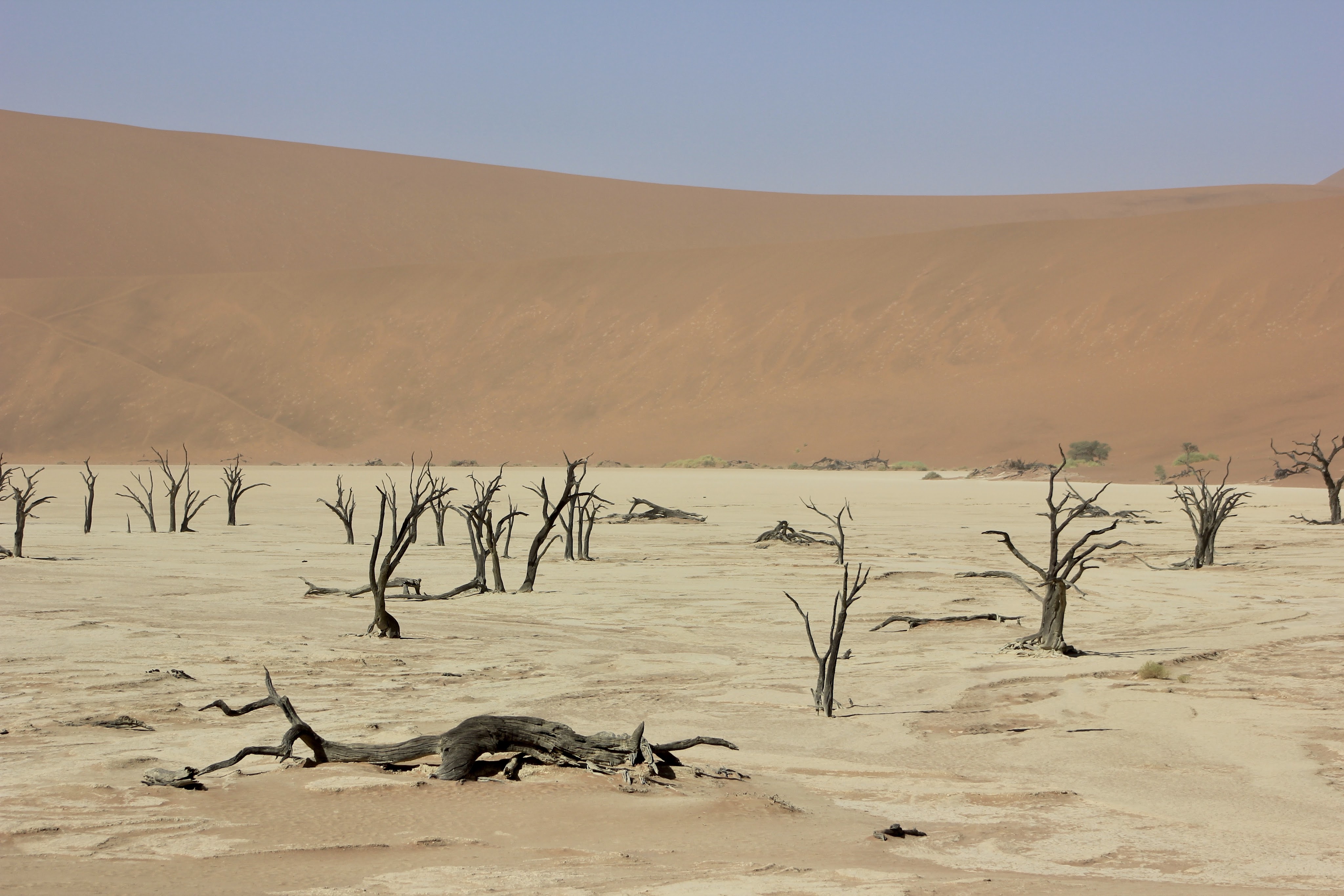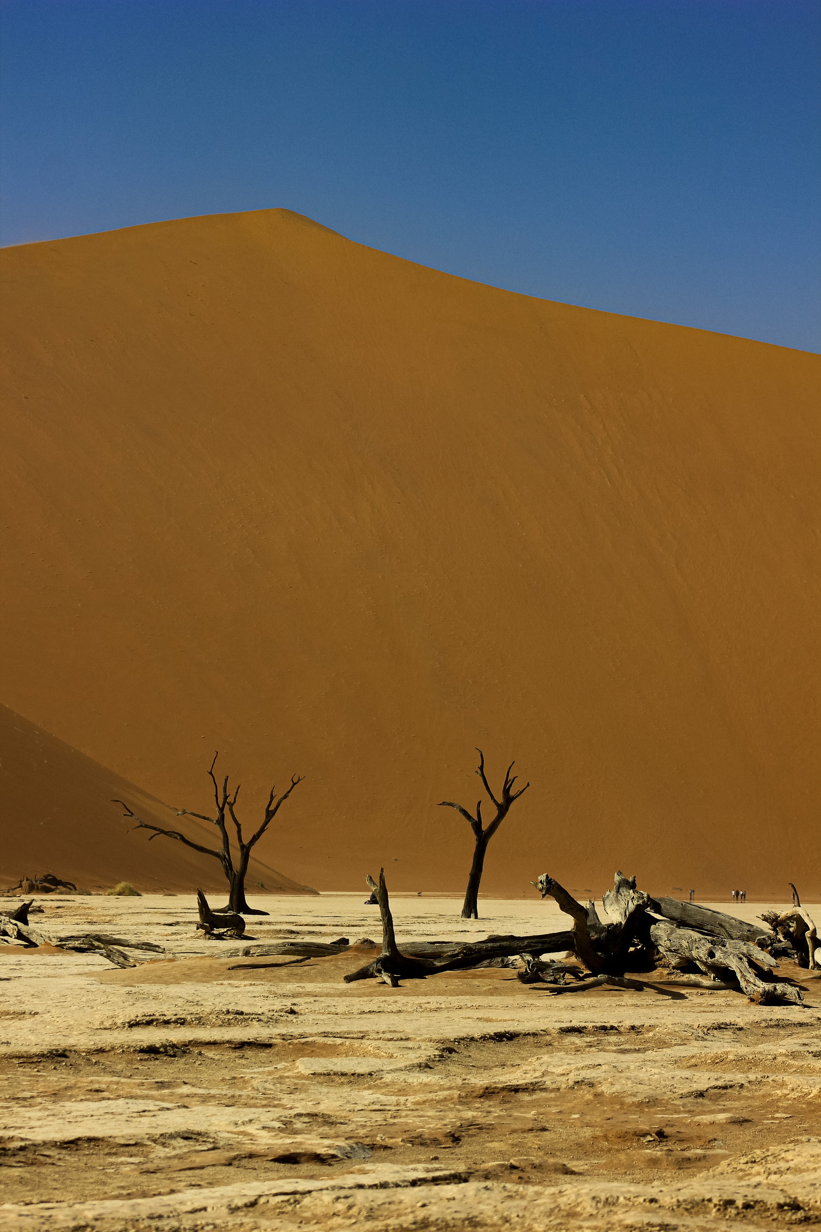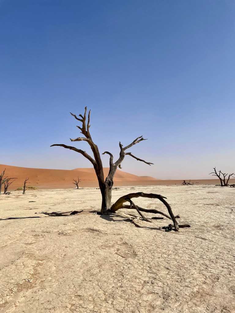 Dead Vlei ou “marais mort” est un lac d’argile asséché entouré des plus hautes dunes du monde dont la plus haute est Big Daddy. Ces dunes ont empêché la rivière de couler et n’ayant plus d’eau, les acacias vieux de 900 ans ont littéralement brûlés au soleil. L’extrême sécheresse les a pétrifiés à jamais.