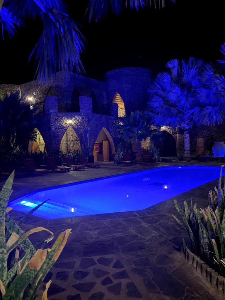 La route qui mène au Fort est vraiment plate et l’on ne voit que du sable et des petites collines à l’horizon, puis soudain une silhouette à peine visible se dessine au loin. L’hôtel porte bien son nom de mirage au milieu du désert, son jardin luxuriant contraste avec la rudesse des extérieurs.