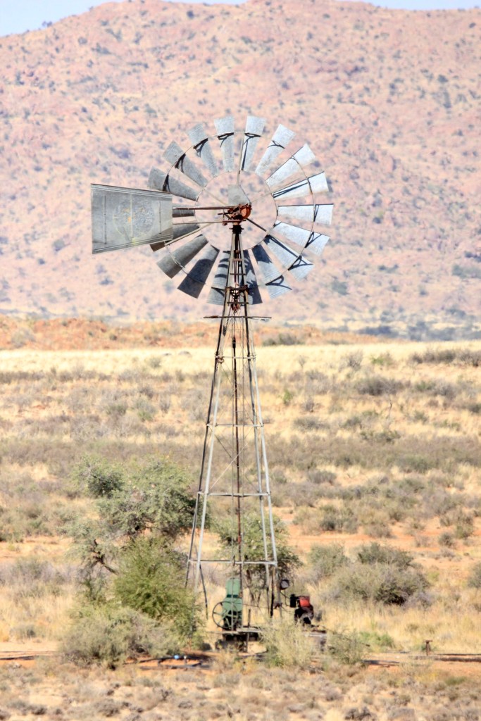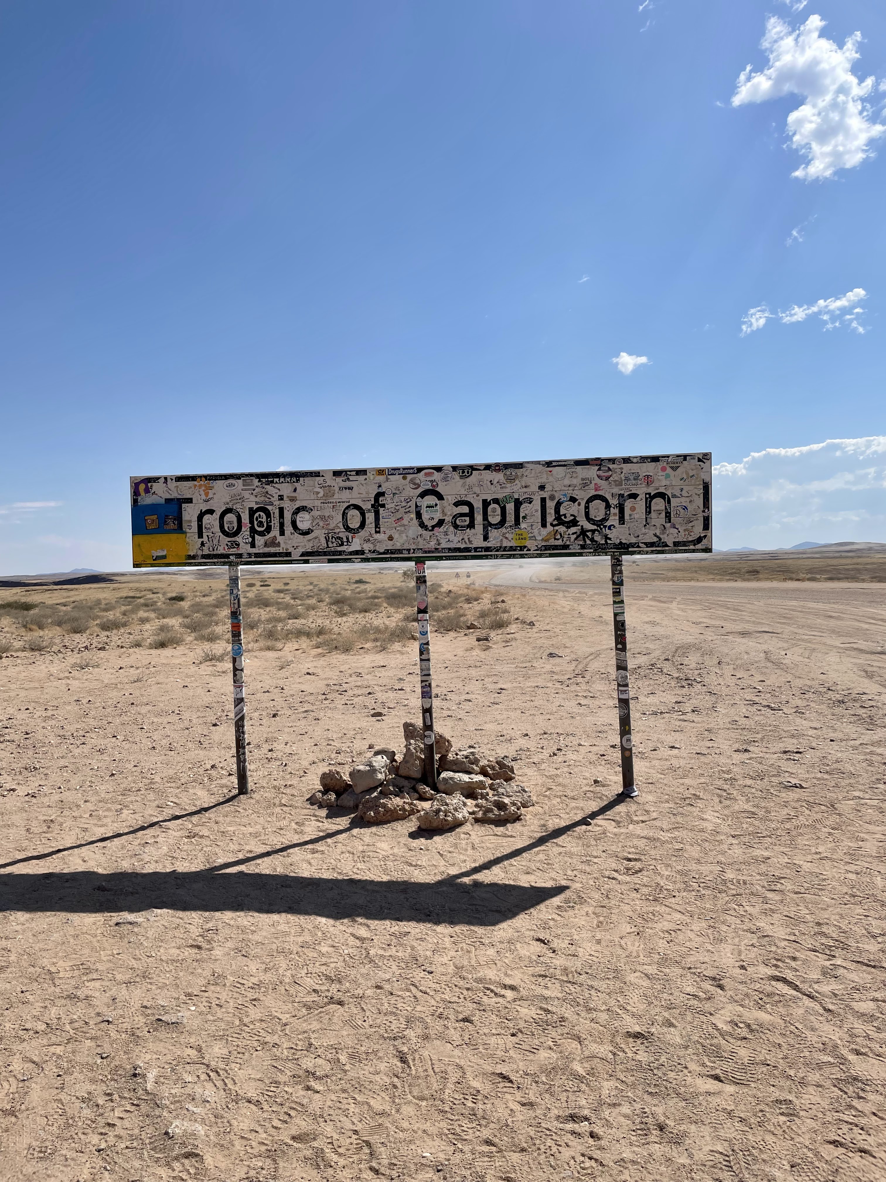 Aujourd’hui, nous partons après un bon petit déjeuner pour 370 km et remontons vers le nord en droite ligne . Chaque étape de plus de 300 km pourrait paraître insurmontable, mais je vous garanti que les paysages changent tellement souvent, on à chaque fois surpris, de plus l’envie de voir des animaux nous fait passer ces km à grande vitesse. Après moins d’une heure de route, nous passons par le Tropique du Capricorne, un petit stop photo obligatoire. Le long de la route rectiligne nous voyons de nombreux oiseaux posés sur les piquets des barrières, puis qques autruches au loin. Très très peu d’habitations, le mot désert prend tout son sens.