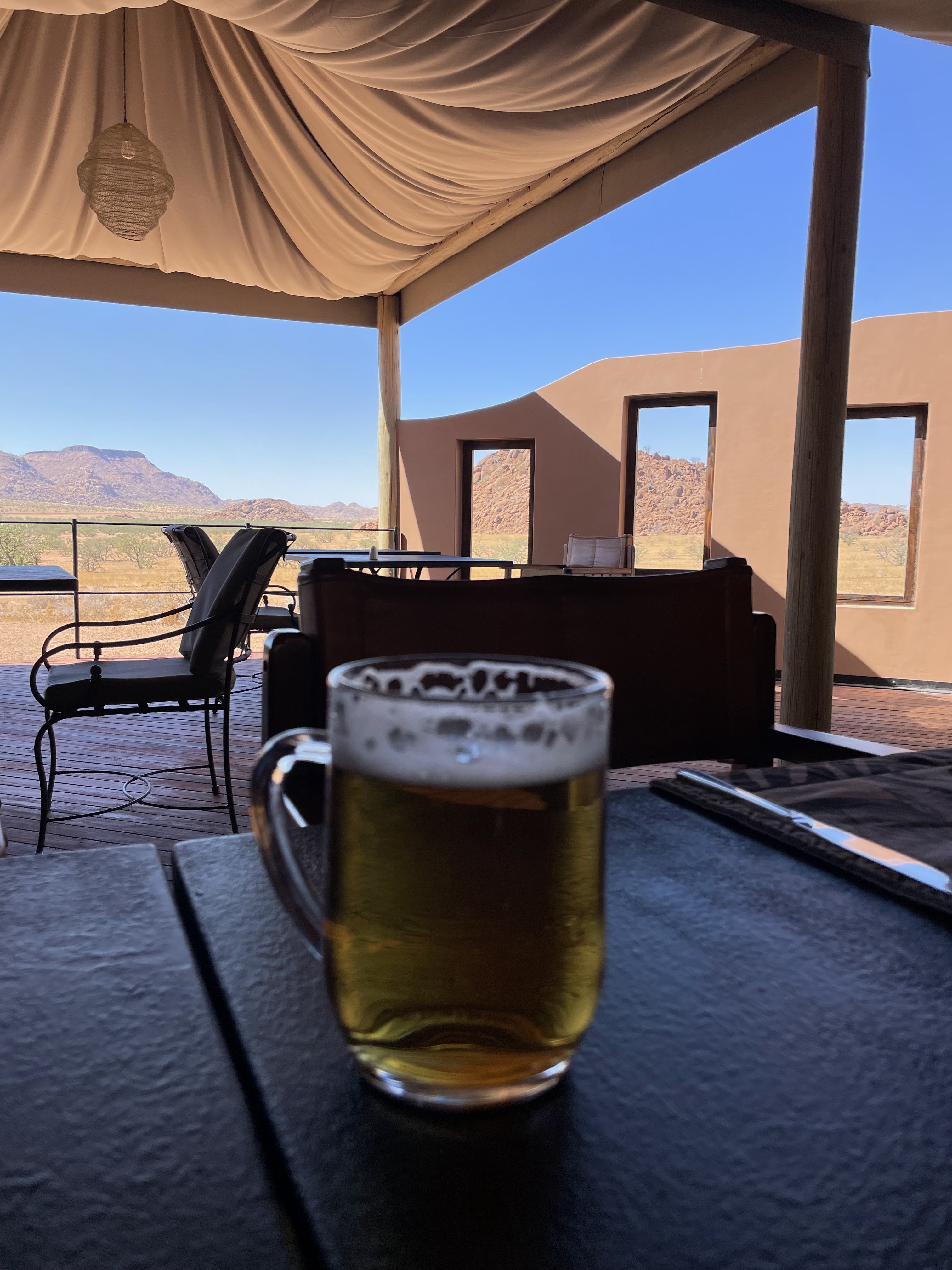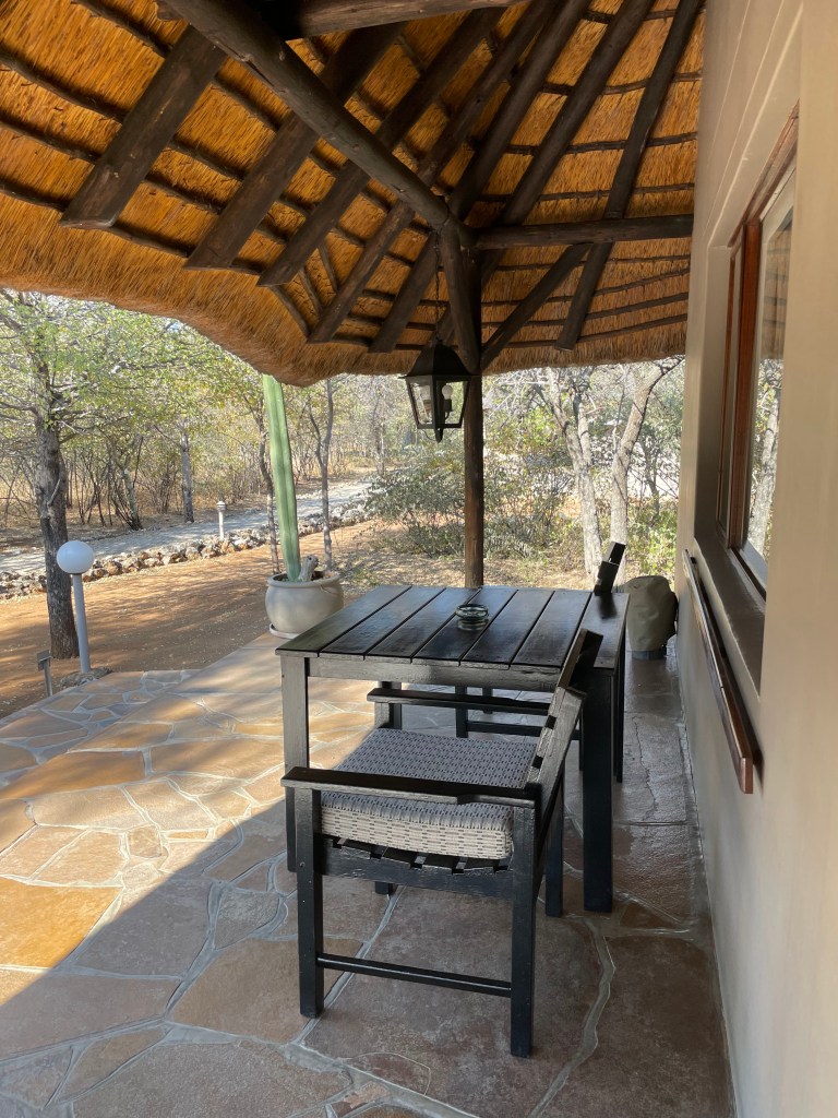 PARCE QUE L’ON SE DIT TOUT l’hôtel est idéalement situé pour faire des safaris, mais au niveau des infrastructures, restauration et service à table nous remarquons que l’état est bien présent. L’accueil à la réception est limite militaire et nous comprenons vite qu’il doit être expédié rapidement, on est loin de l’accueil tellement chaleureux de Twyfelfontein.