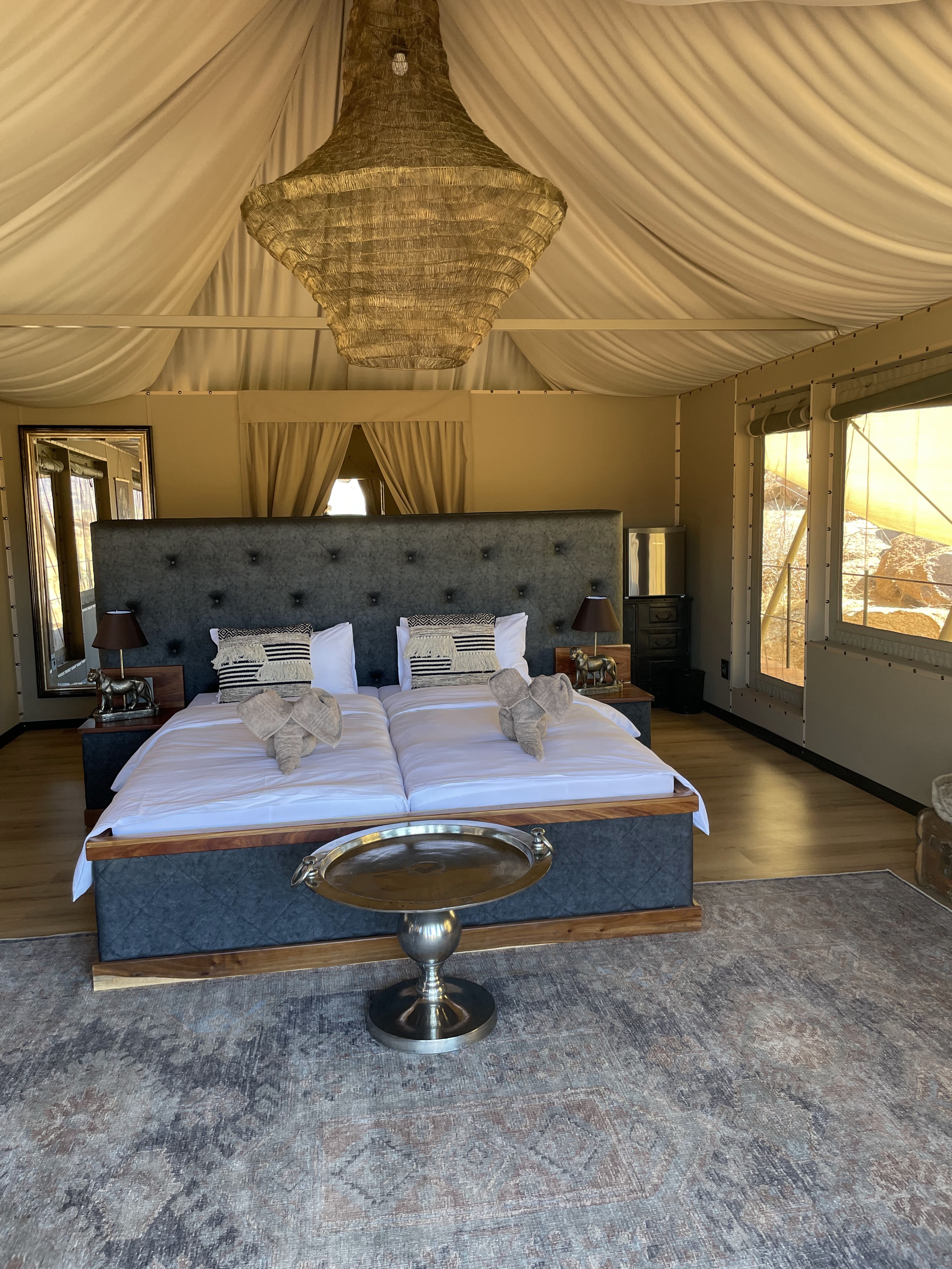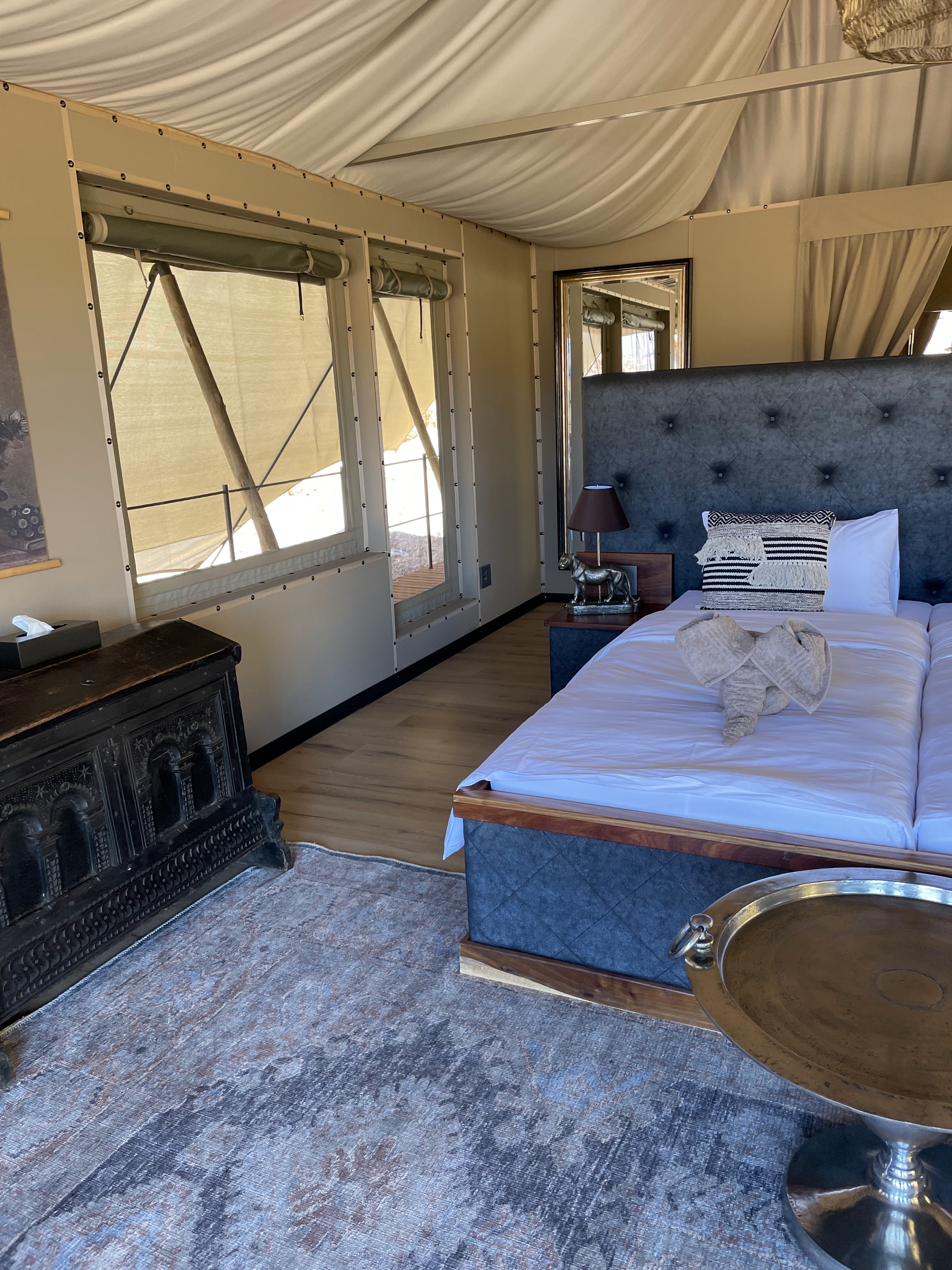 Nous nous installons dans notre tente car nous avions décidé de tester un camp en toile plus simple. Ces tentes sont nettement moins décorées et moins luxueuses que les autres mais ont tout ce dont nous avons besoin.