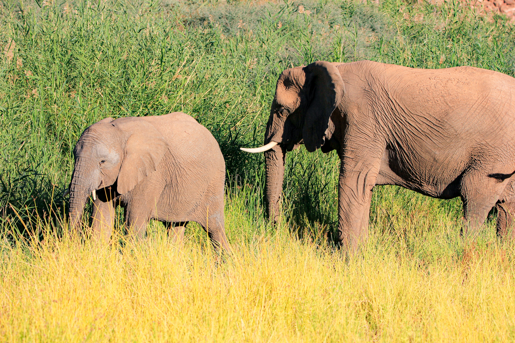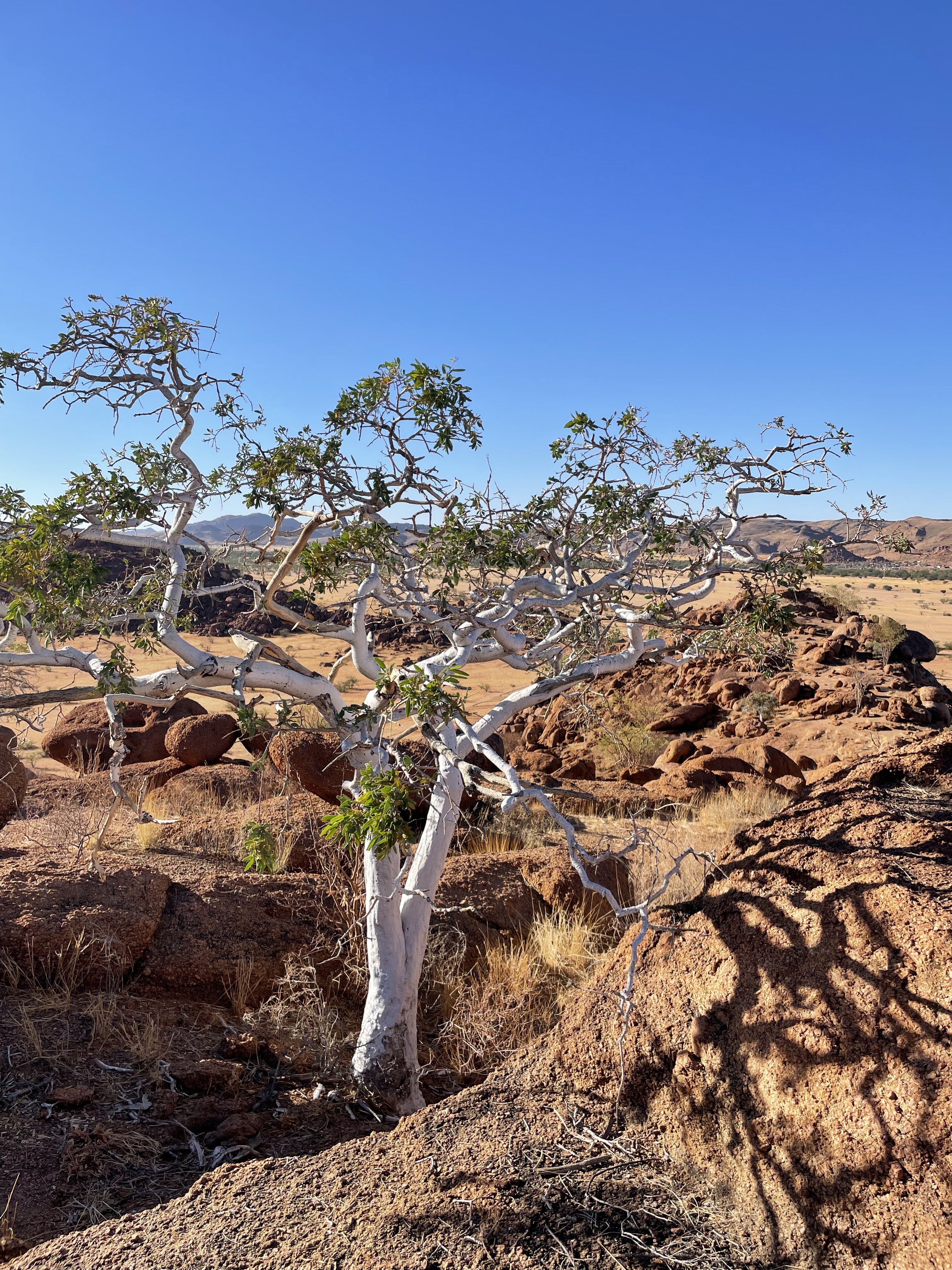 Palmwag se situe à la limite du Damaraland et du Kaokoland, c’est une réserve naturelle avec à nouveau un paysage différent, fait de plaines désertiques avec quelques touches de vert. On verra les fameuses Euphorbes qui ont une sève laiteuse qui est un puissant poison dont les San enduisaient les flèches du lait de l’euphorbe.