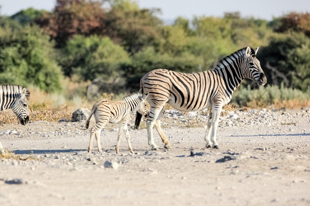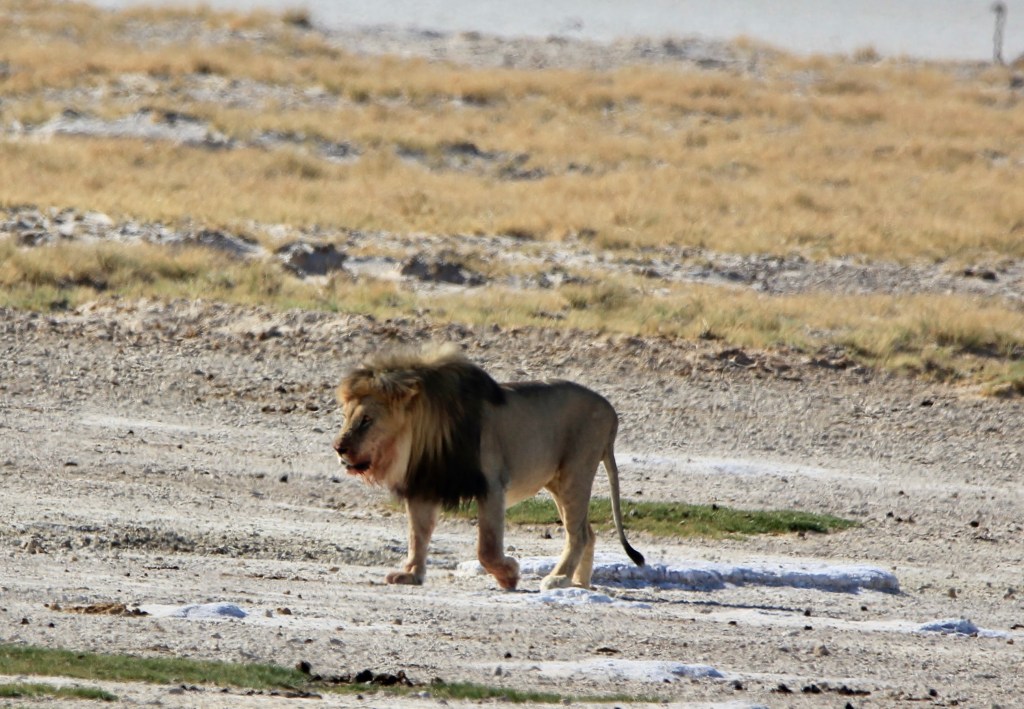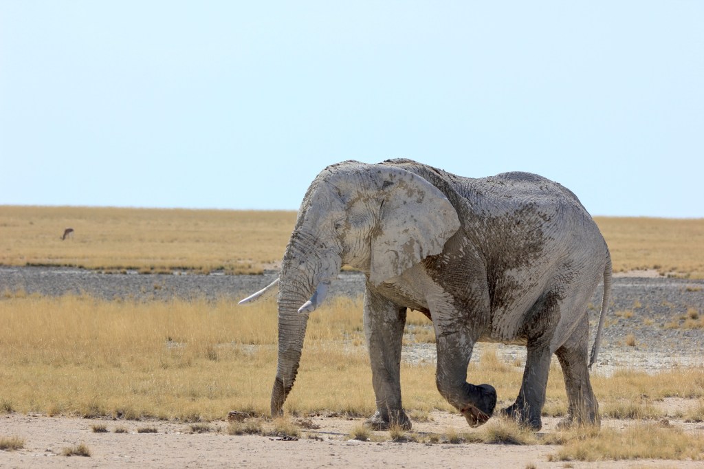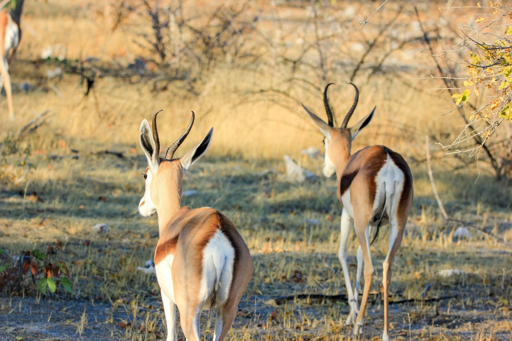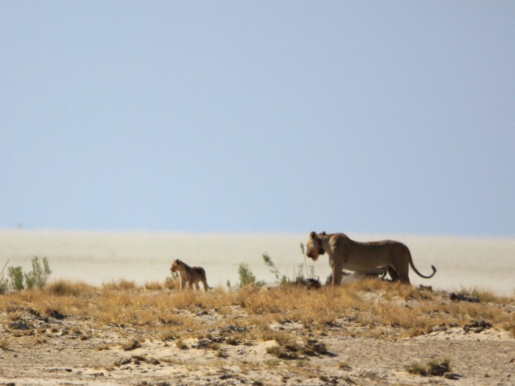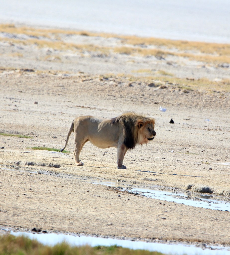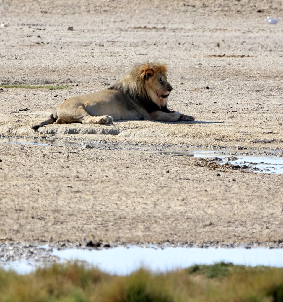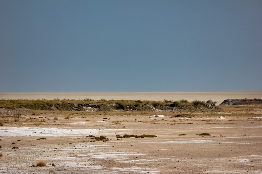 Le parc fait 20’000km2 et en son centre se trouve l’Etosha Pan qui s’étend sur une surface de 5’000km2, c’est un lac salé asséché qui donne ce contraste blanc au milieu du bush.