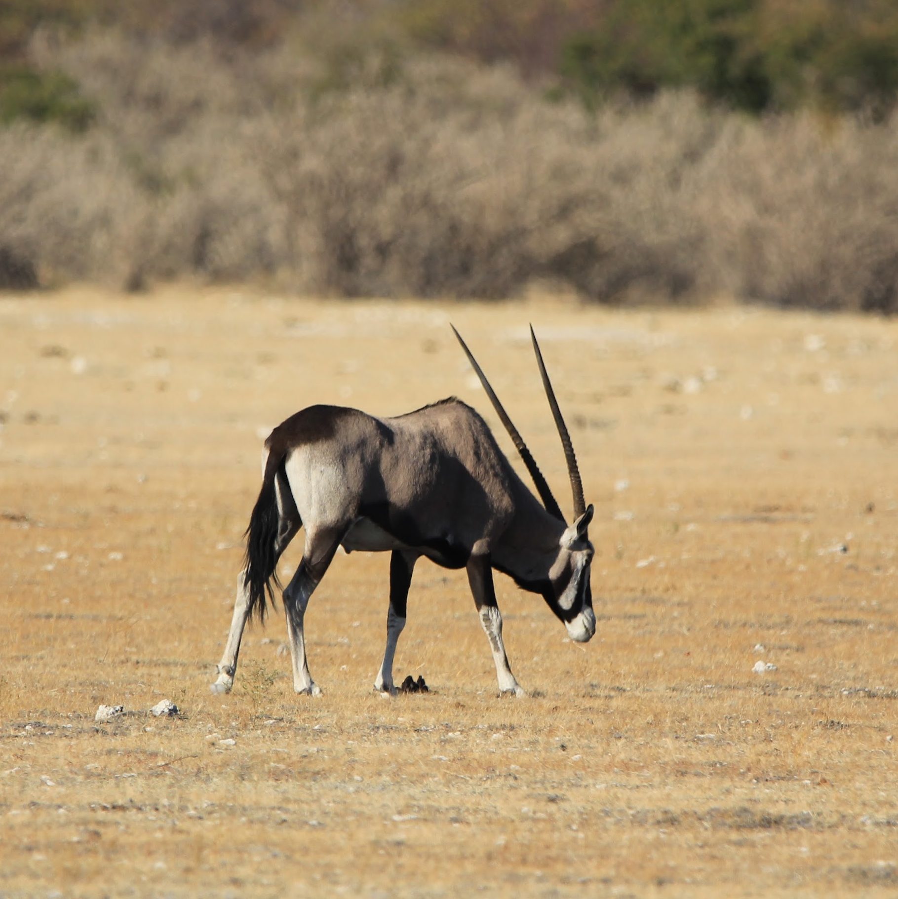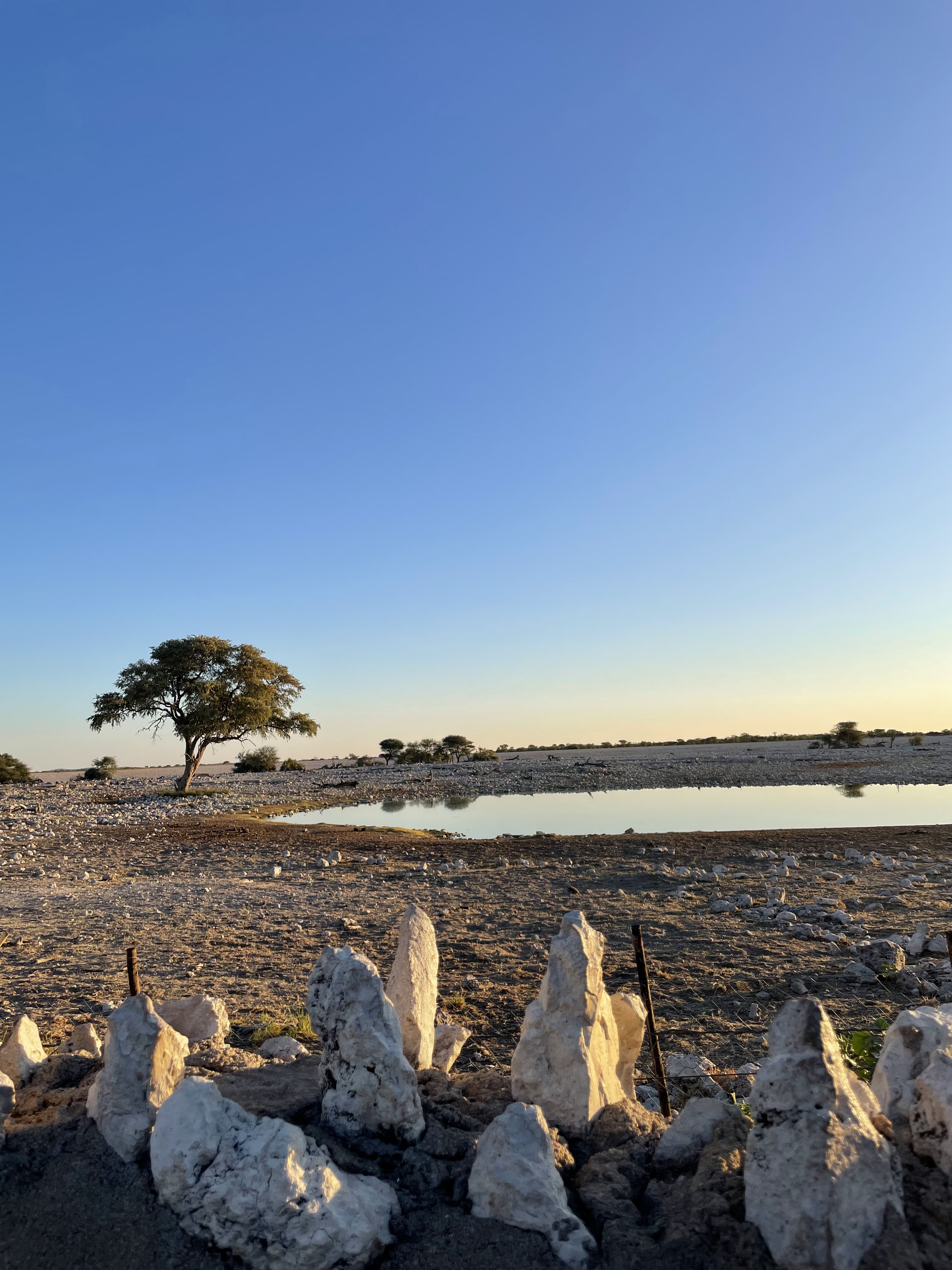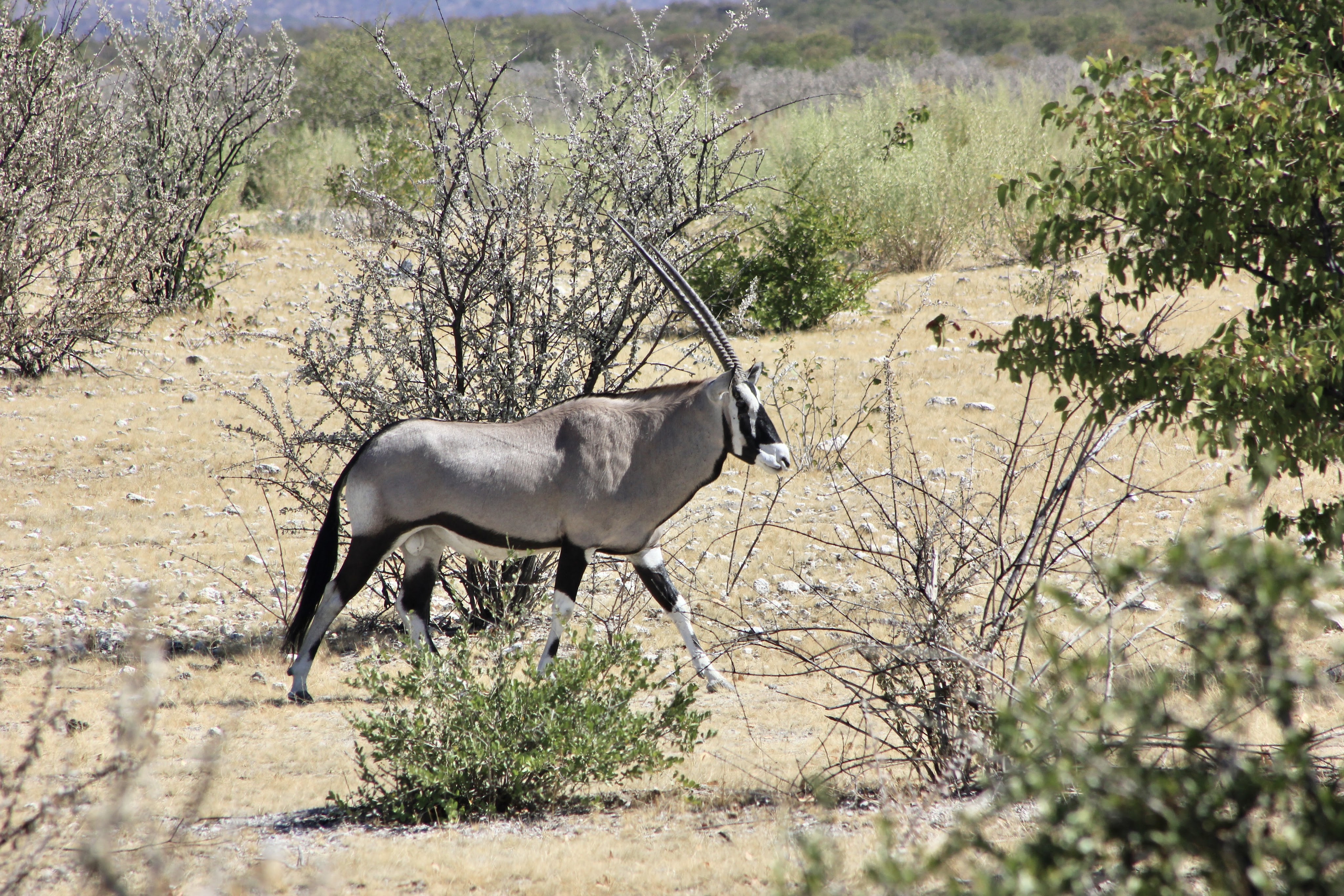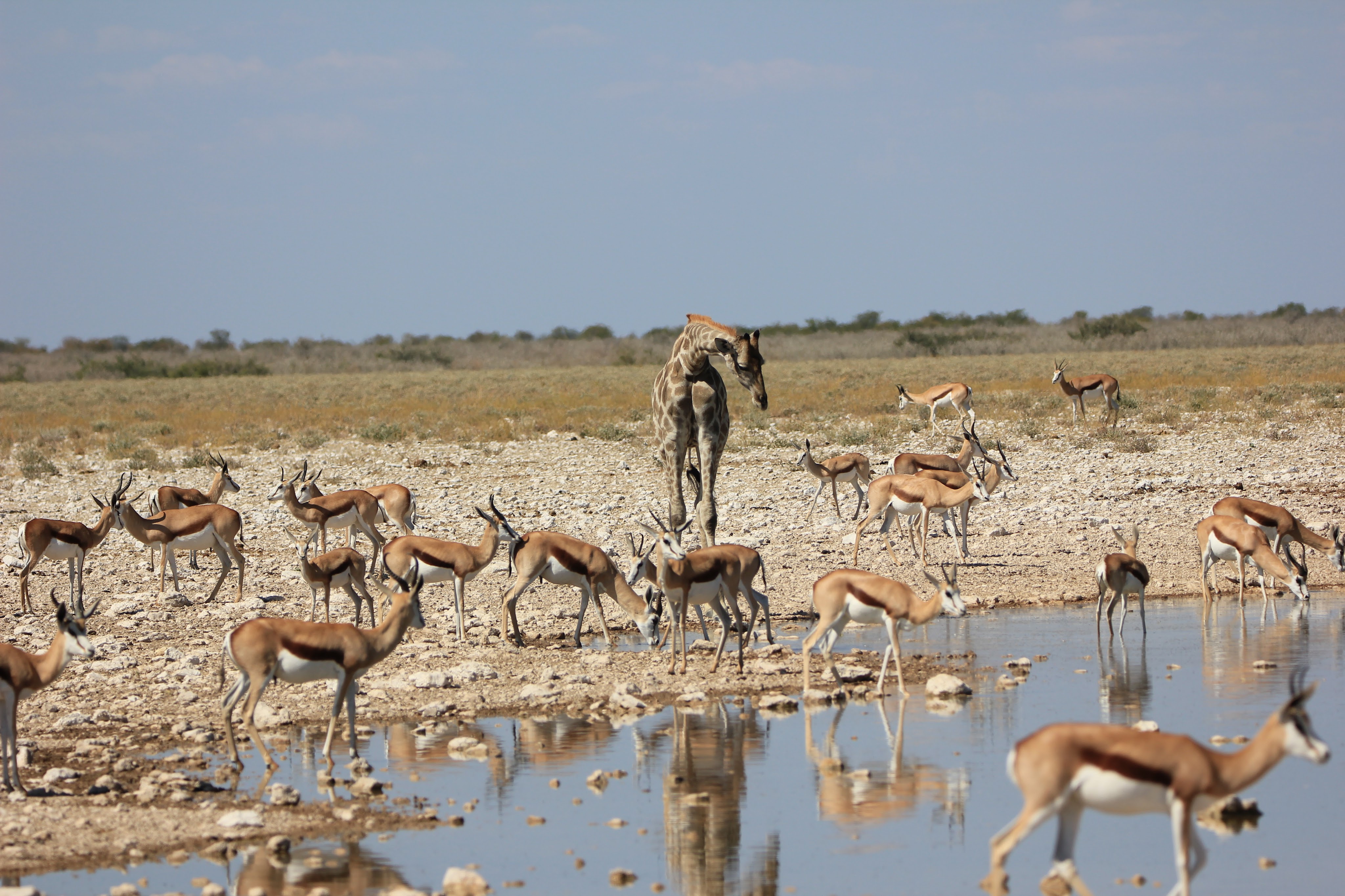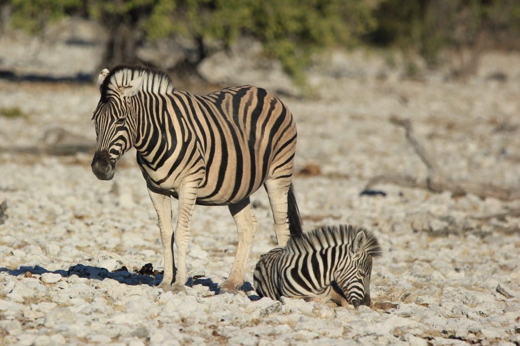 Le parc fait 20’000km2 et en son centre se trouve l’Etosha Pan qui s’étend sur une surface de 5’000km2, c’est un lac salé asséché qui donne ce contraste blanc au milieu du bush.