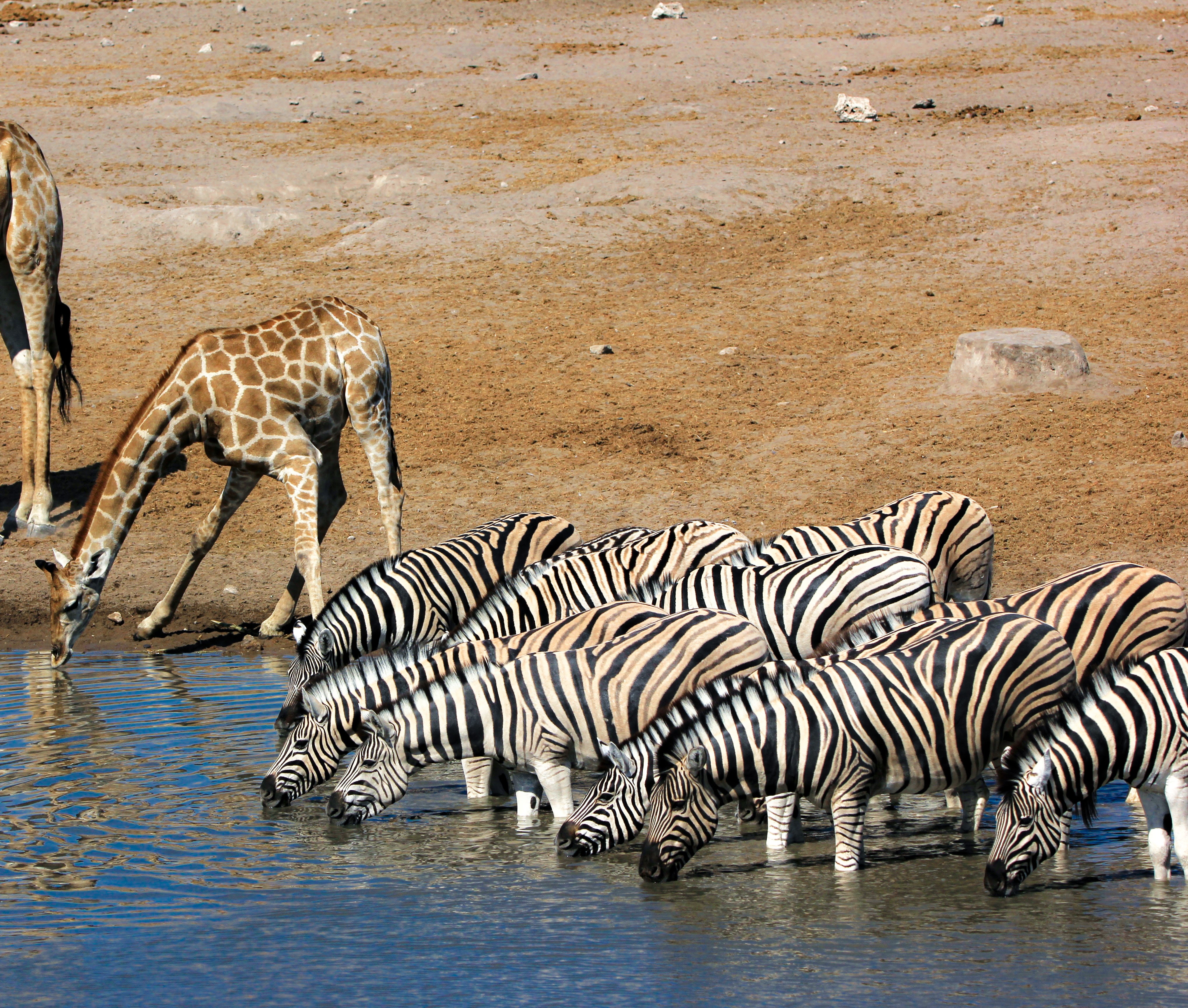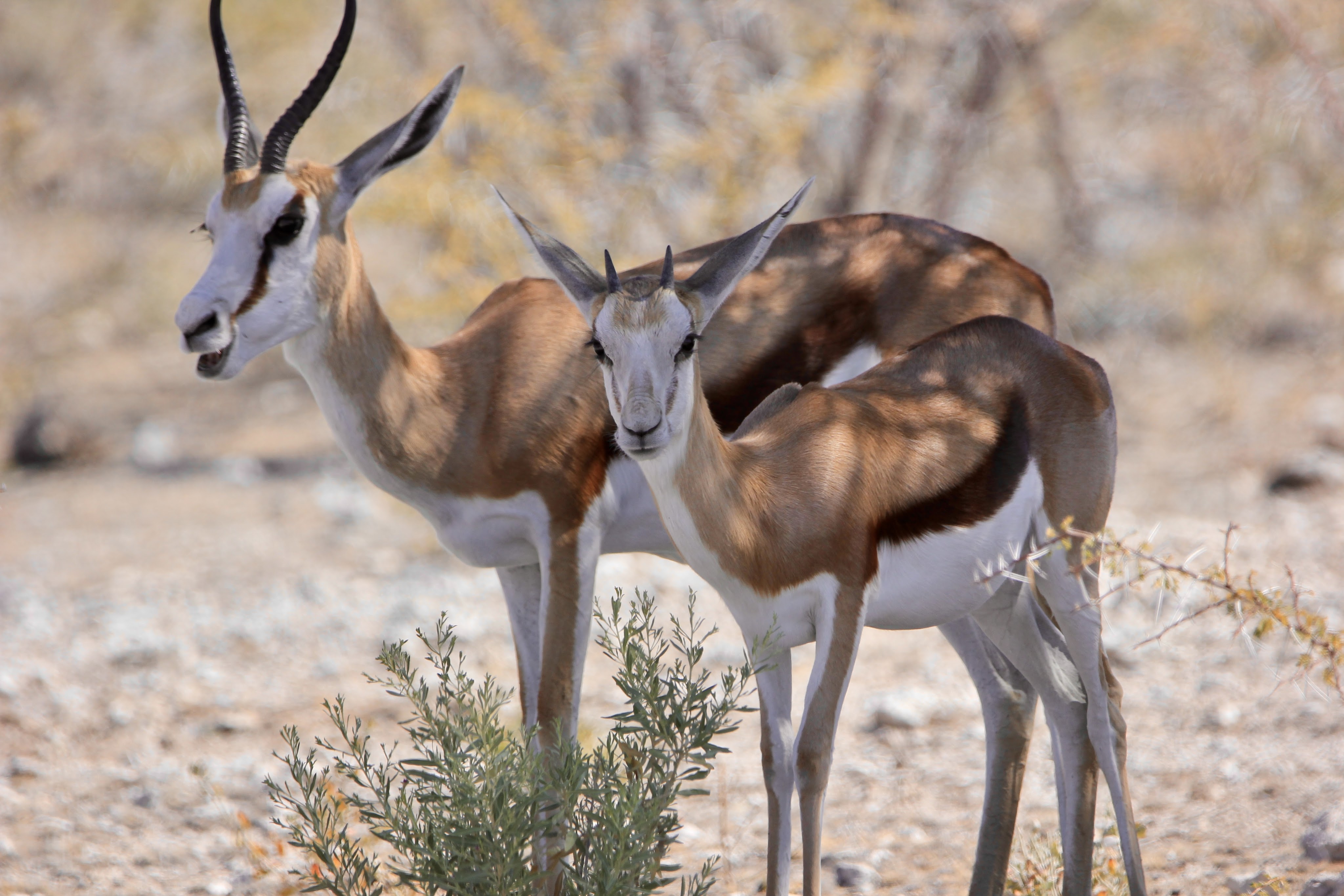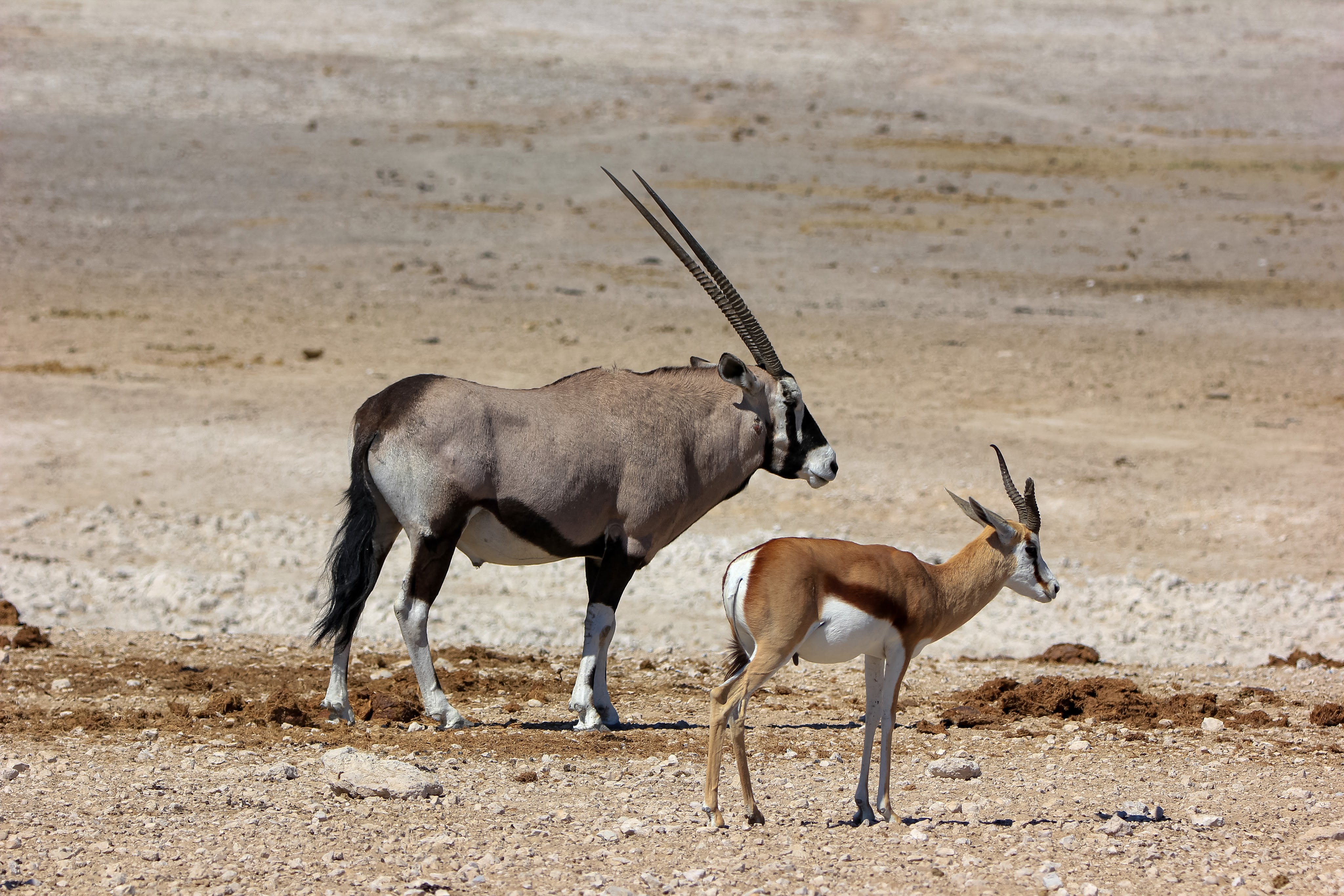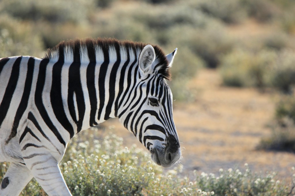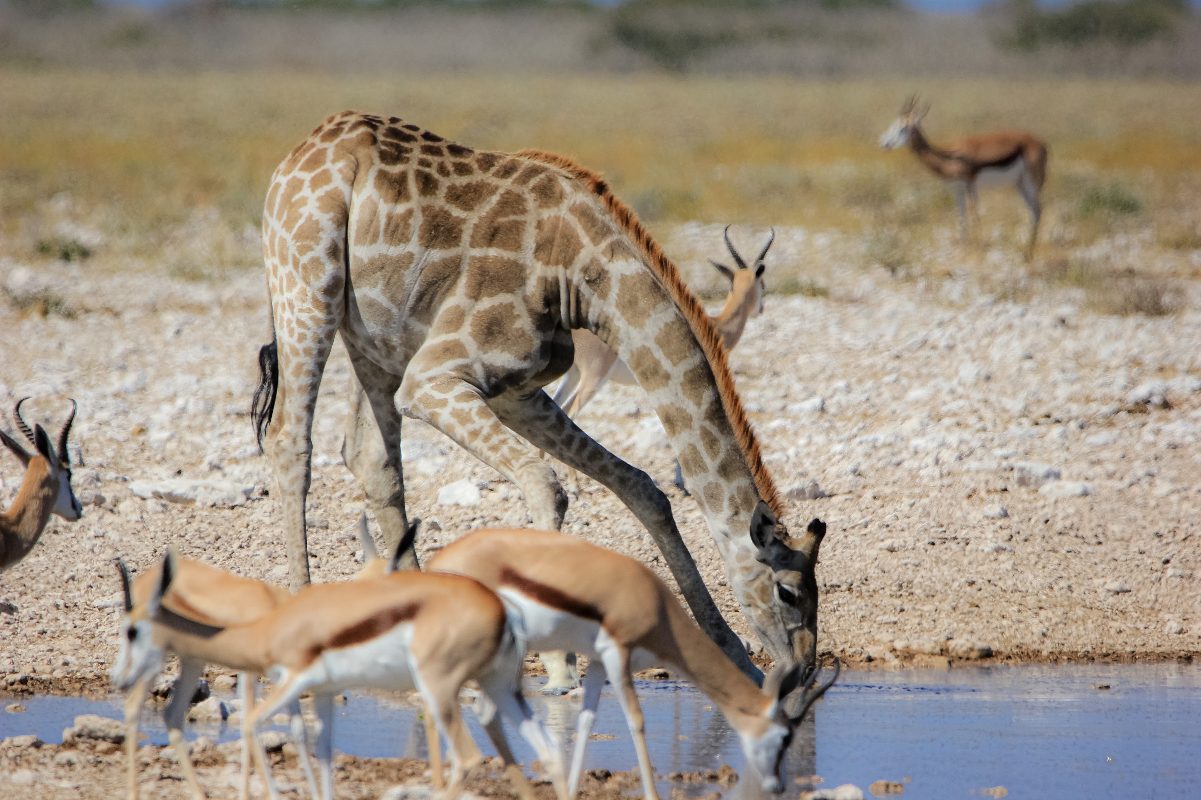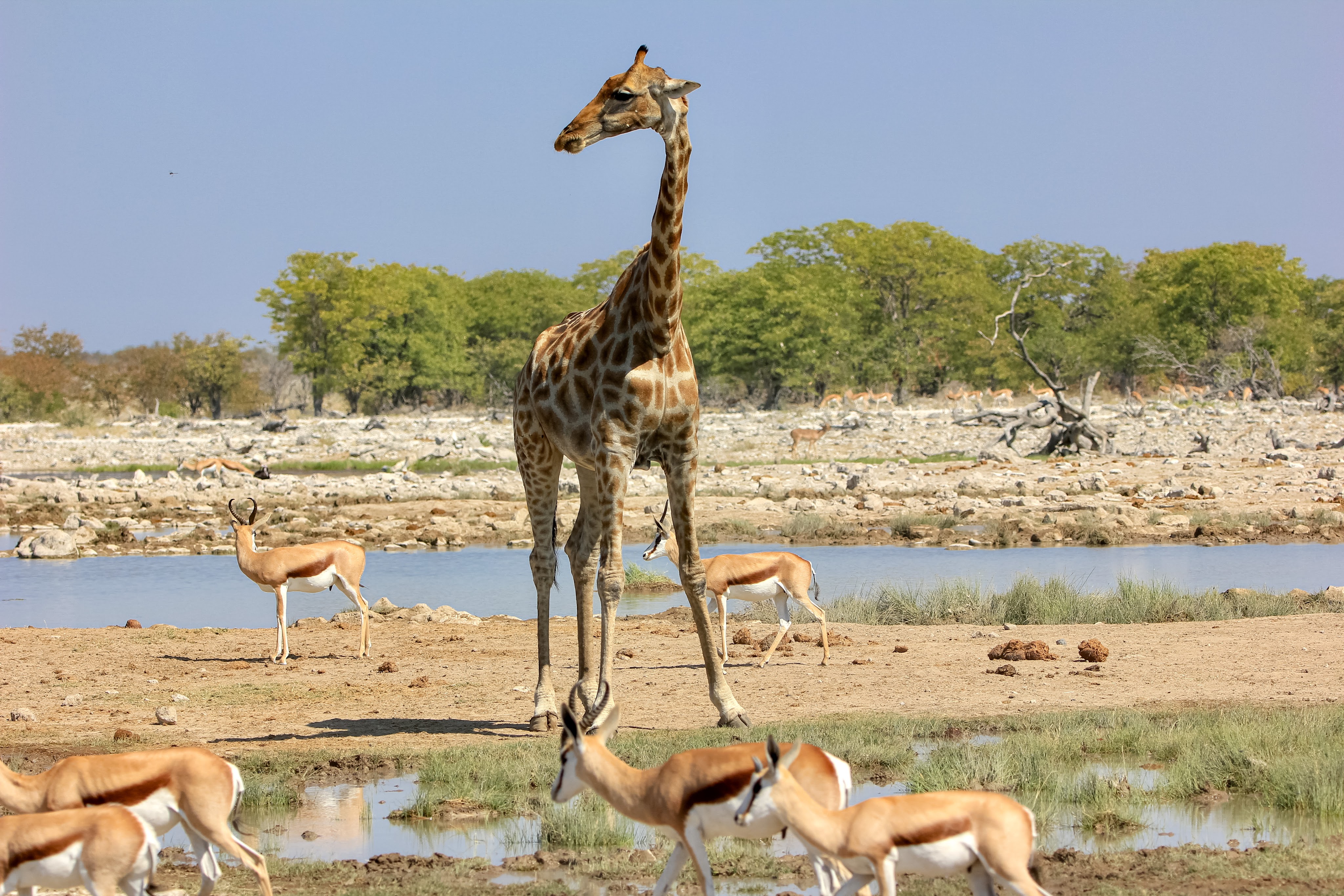 Le parc fait 20’000km2 et en son centre se trouve l’Etosha Pan qui s’étend sur une surface de 5’000km2, c’est un lac salé asséché qui donne ce contraste blanc au milieu du bush.