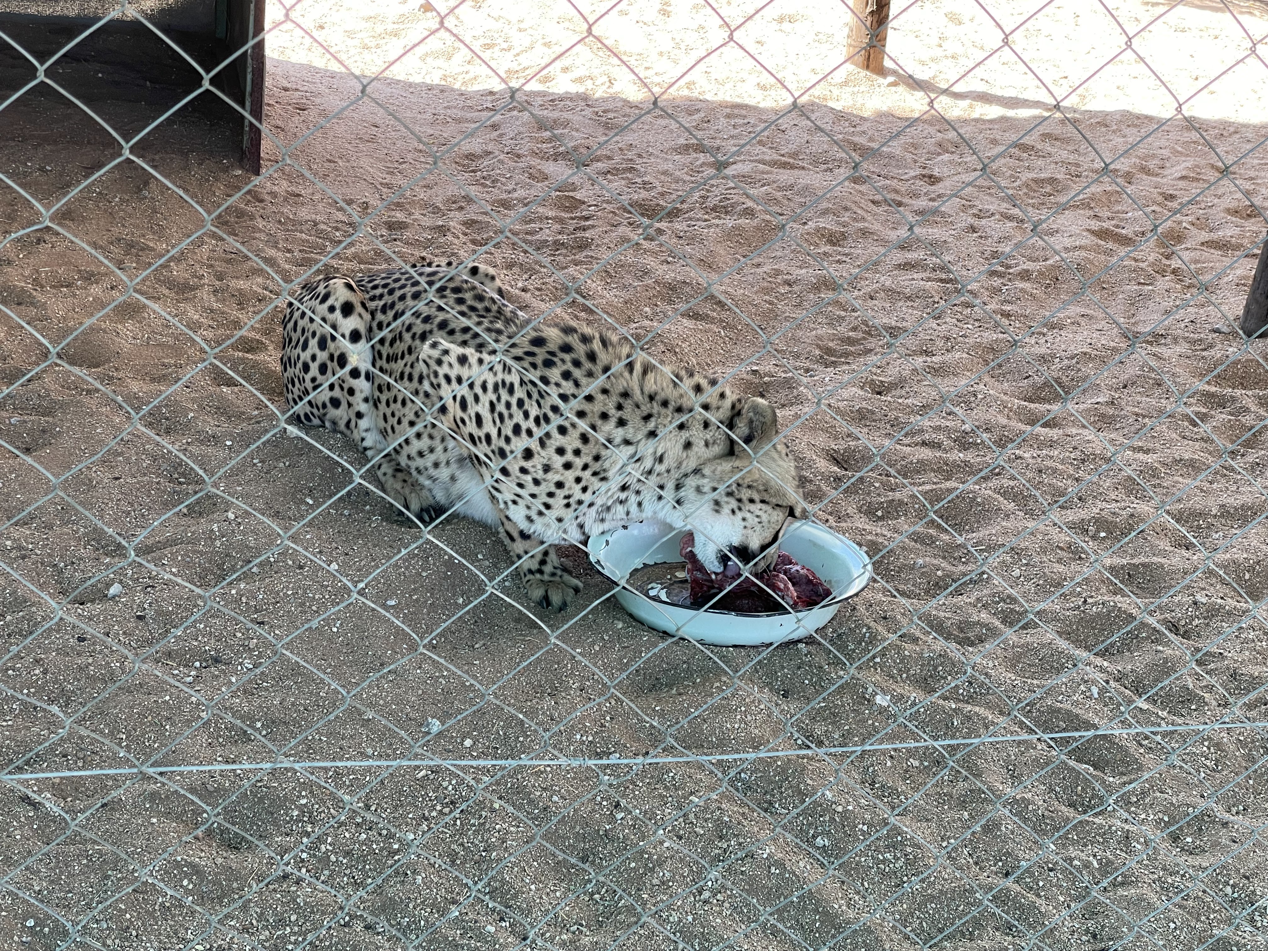 Arrivés à la CCF soit Cheetah Conservation Fund, nous profitons de nous restaurer avant le visionnage d’un film très intéressant sur le travail de la fondation et de sa fondatrice Laurie Marker. Nous assistons ensuite aux repas des guépards avant d’avoir un peu de temps pour se balader dans la ferme et profiter de notre joli lodge en attendant le souper, très familial et fameux du soir. Le filet de boeuf était incroyable …