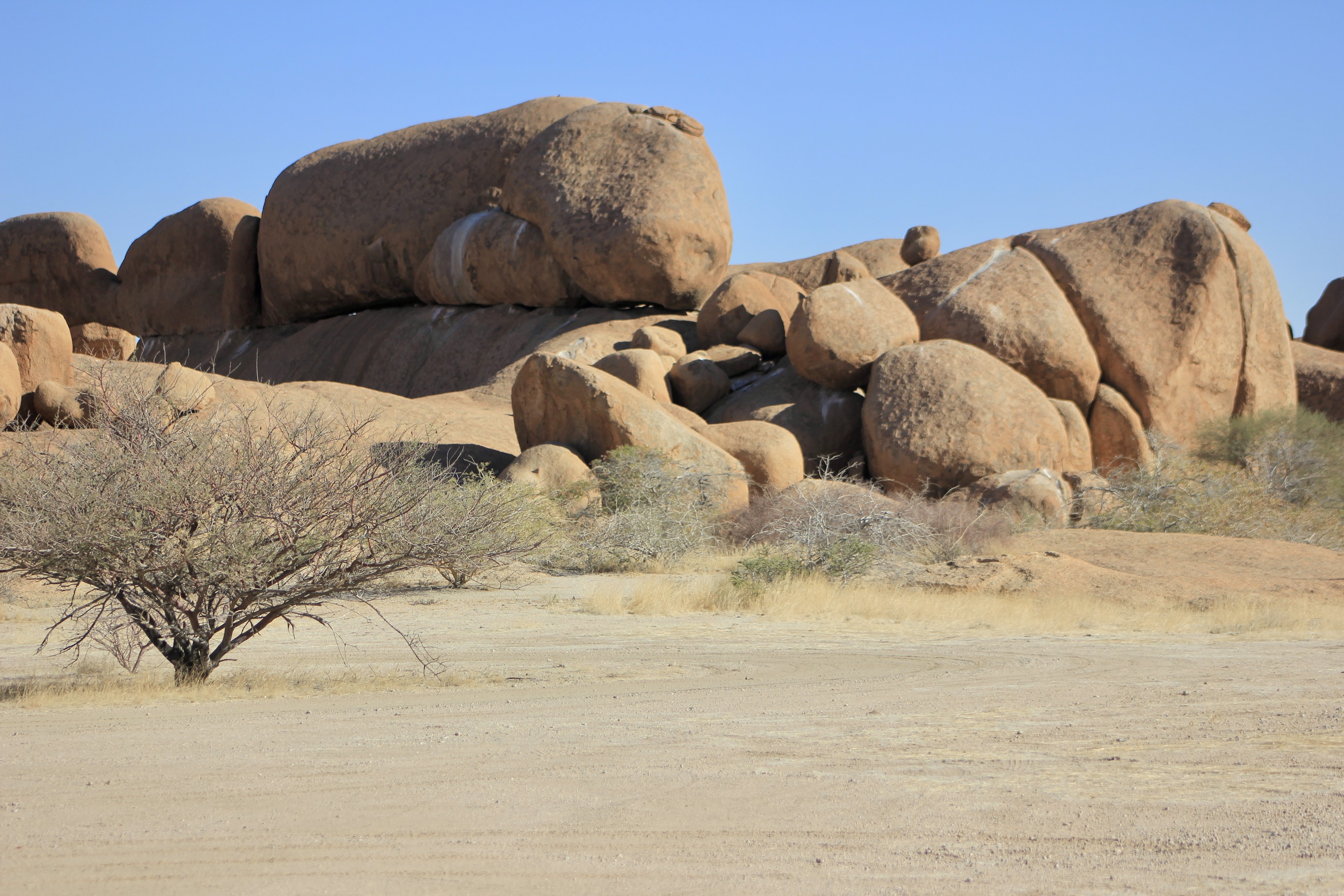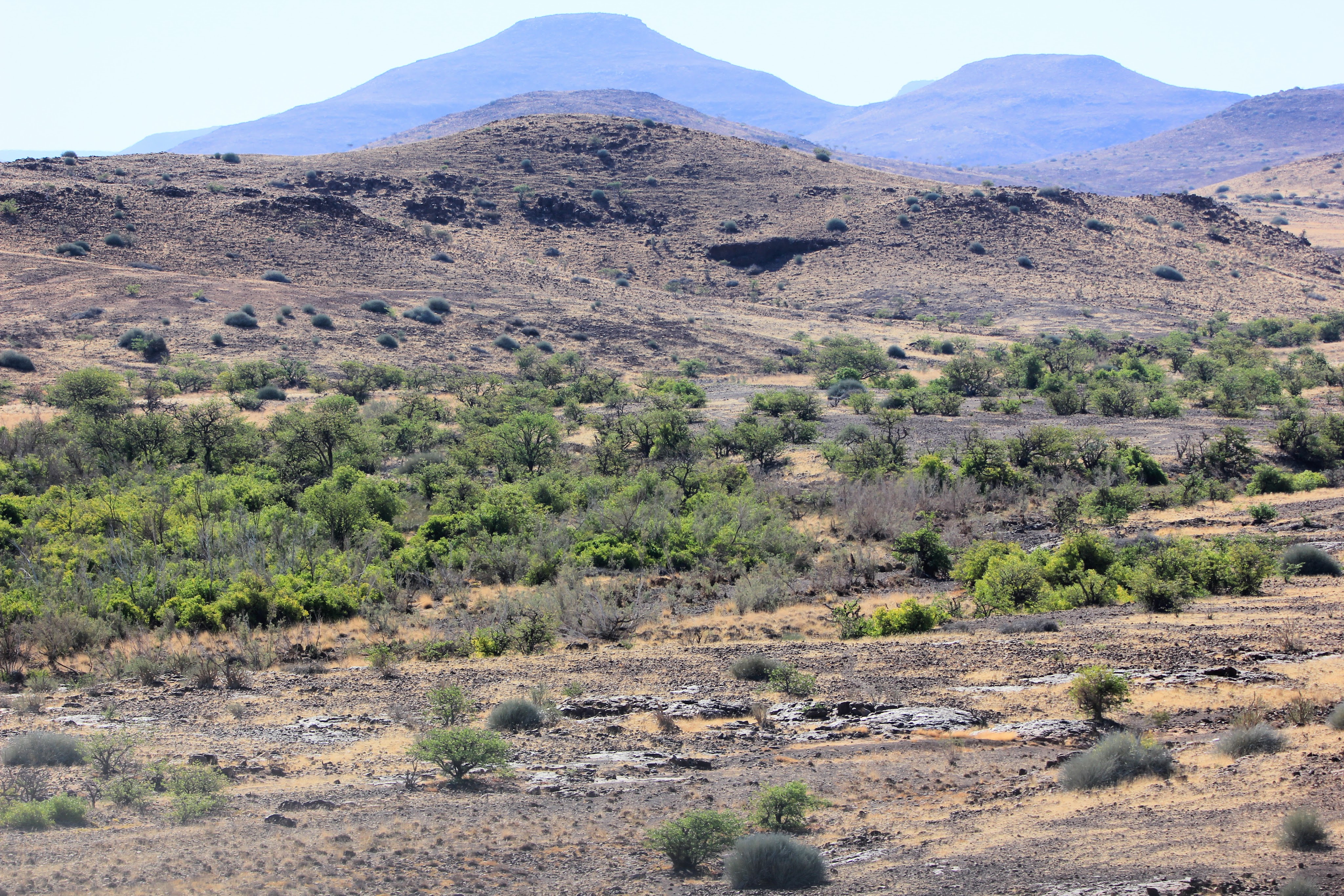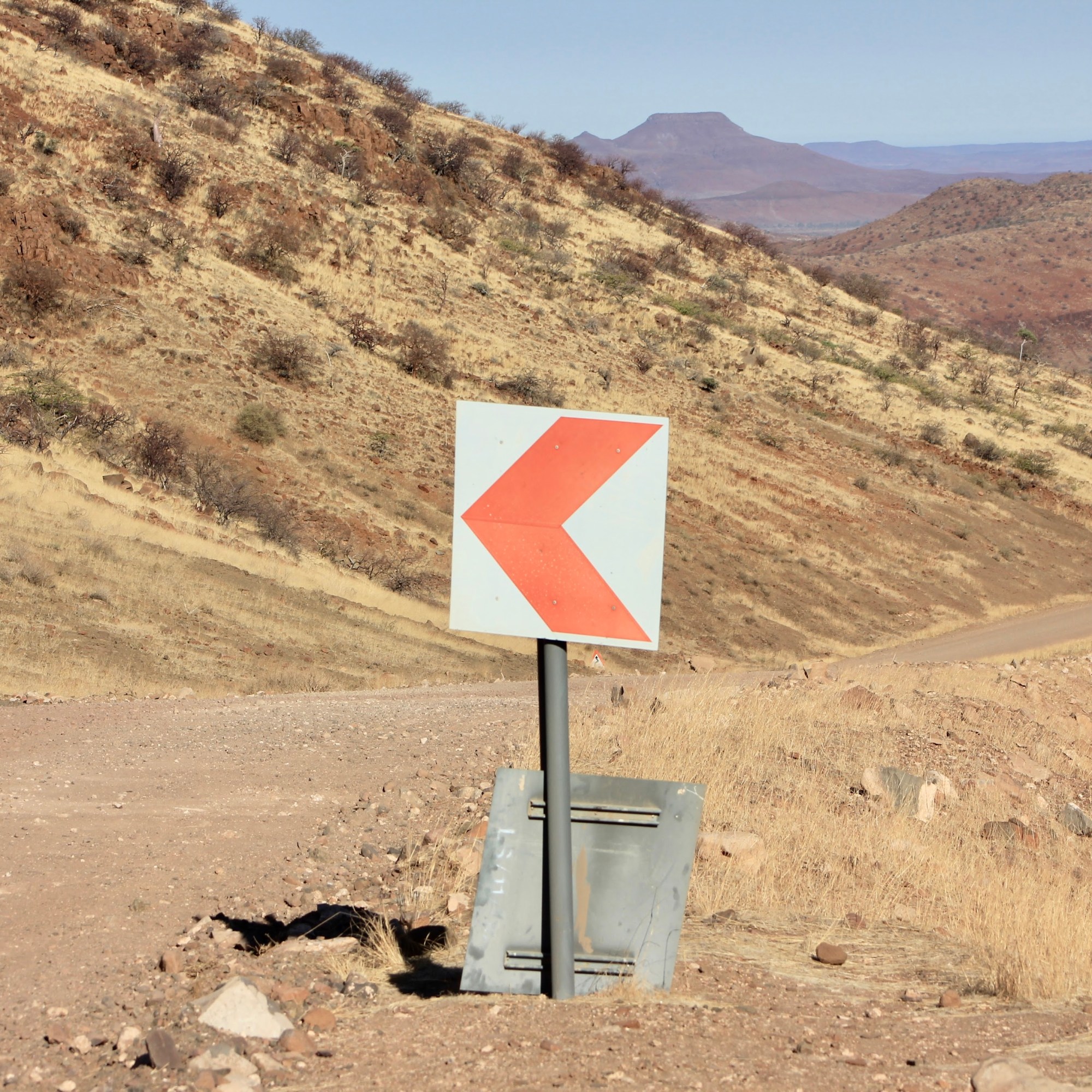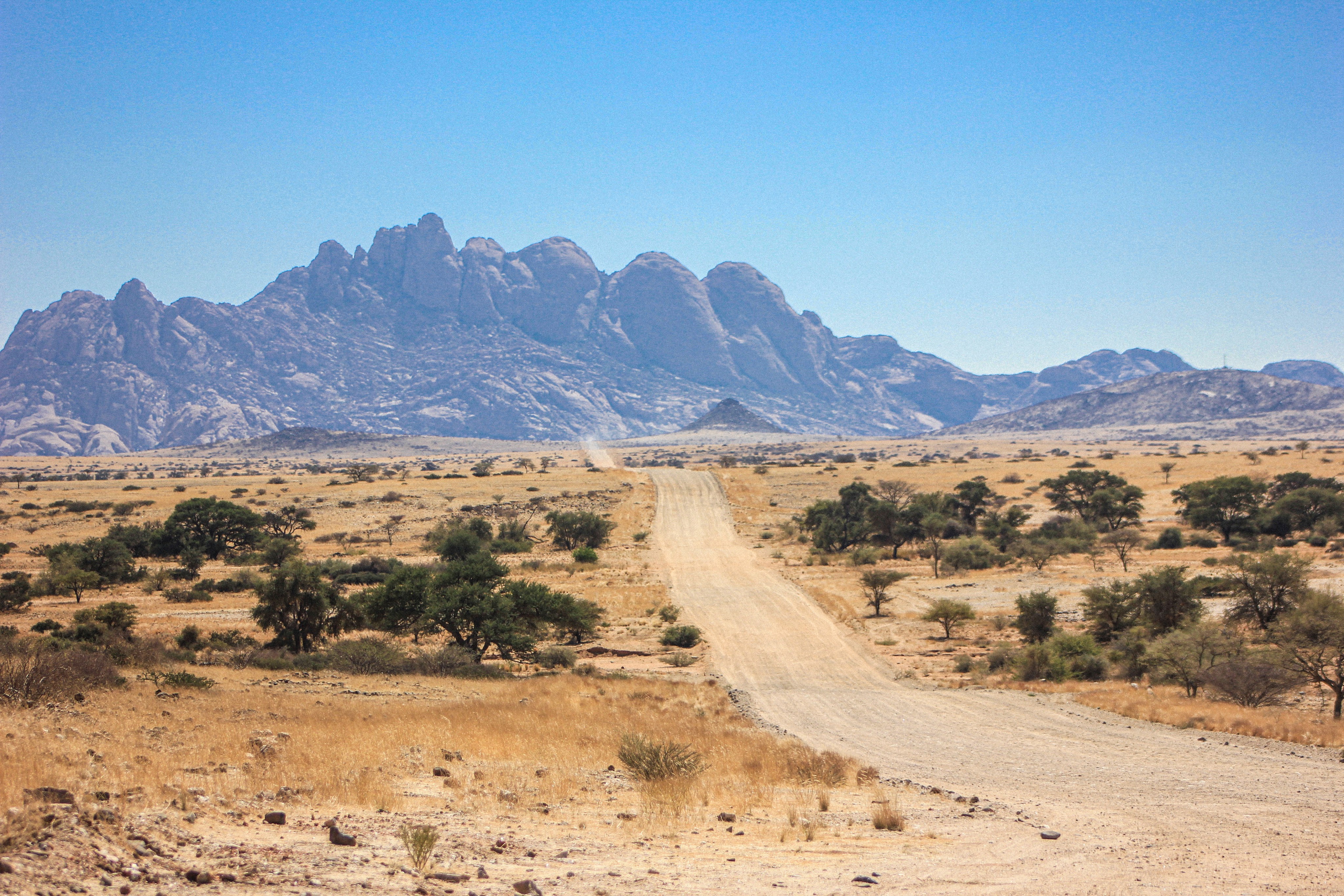Nous repassons le cordon sanitaire sans le moindre souci cette fois encore et prenons la direction de Kamanjab, la route est bordée de monts rocheux et souvent la piste épouse le relief, ce qui donne des montées et descentes vertigineuses.