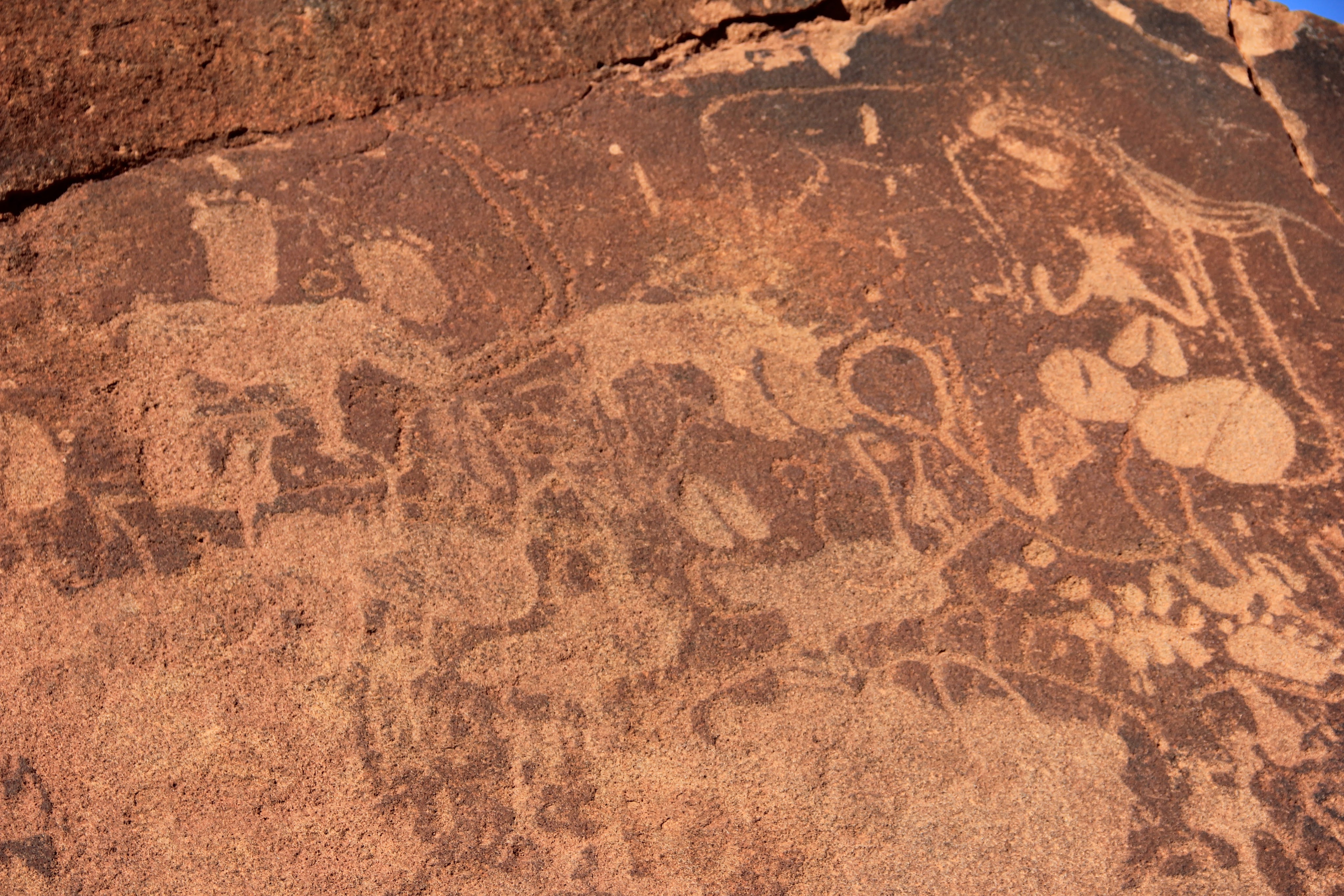 Vous verrez aussi des ronds qui symbolisent les points d’eau. Selon notre guide, ces scènes étaient faites pour les peuples migrateurs, lorsqu’il arrivaient là, ils venaient lire les pétroglyphes afin de savoir quel animal se trouvait dans la région.