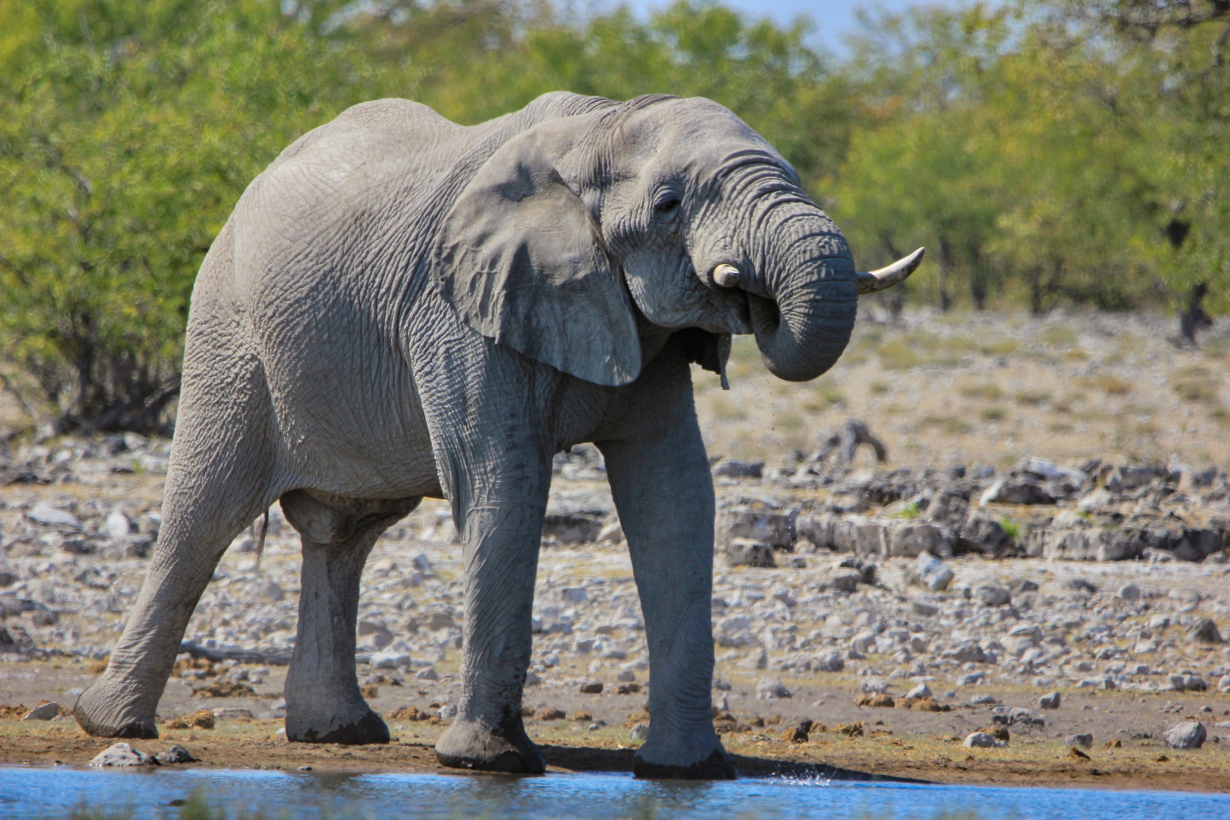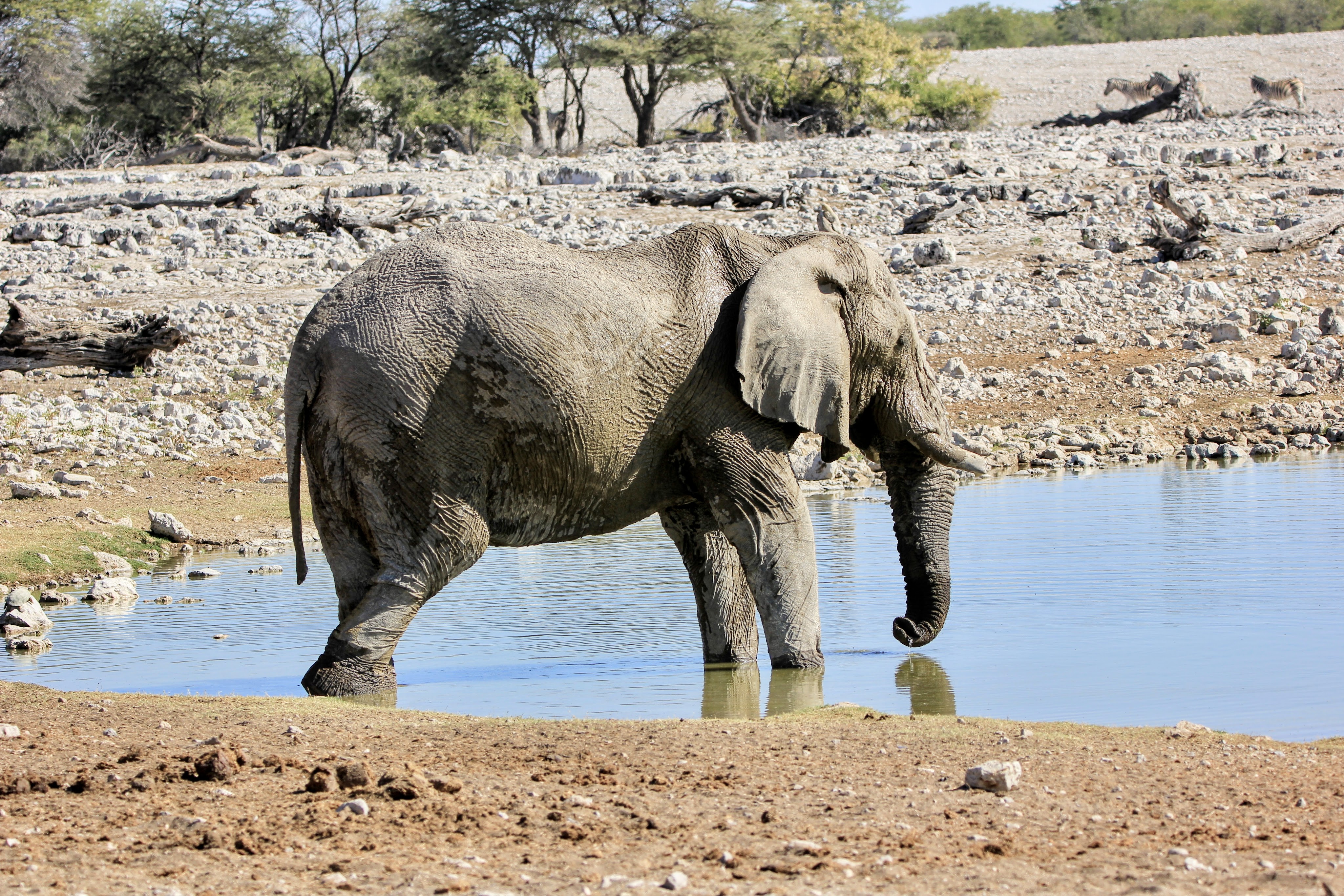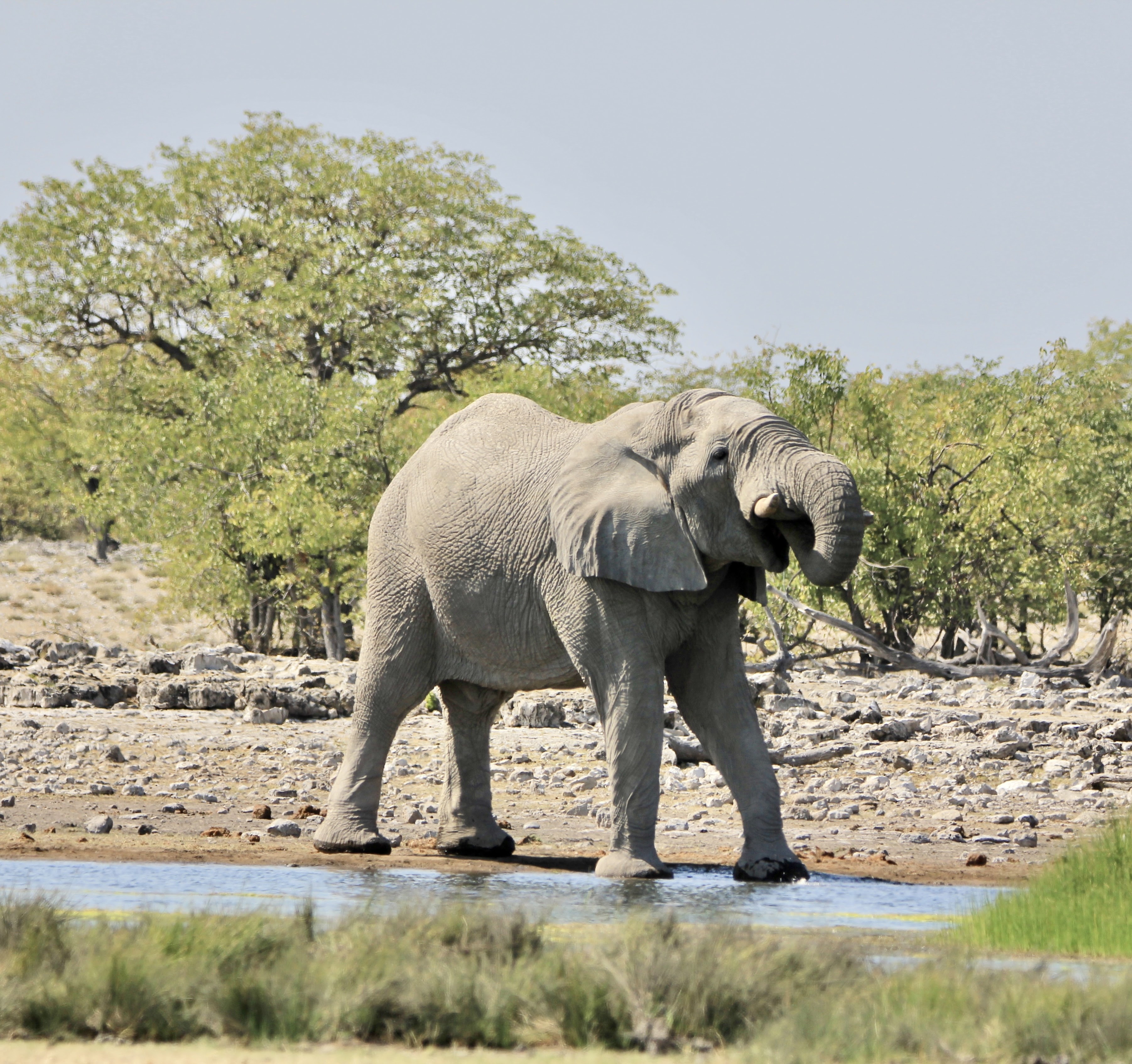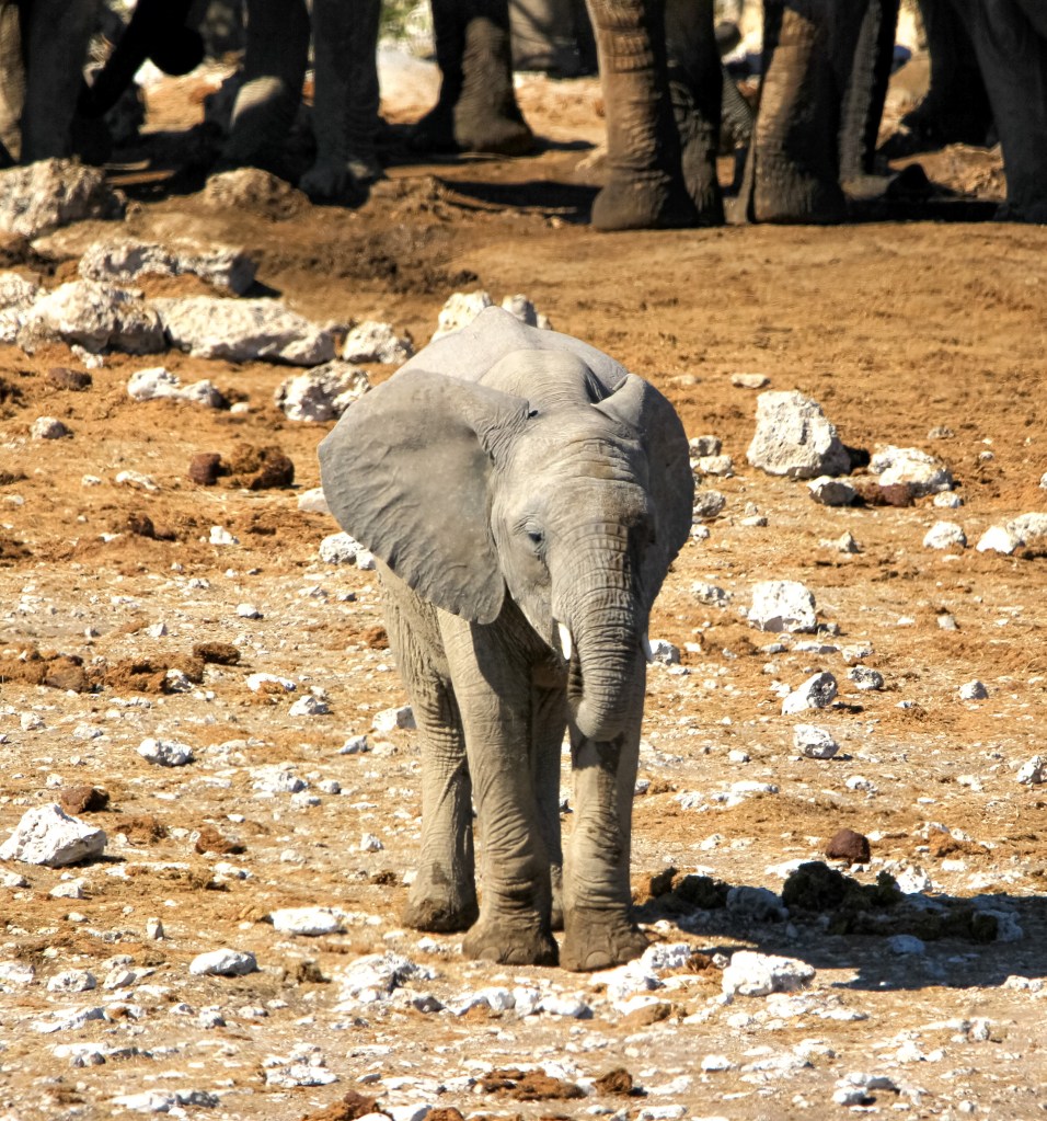 Nous passons donc la Anderson Gate et dans les premières minutes nous voyons des dizaines de springbock, des zèbres et des oryx. Les deux premières nuits, nous séjournerons à Okaukuejo qui m’a attiré grâce à son trou d’eau aménagé en bordure des lodges, dès notre arrivée avant d’aller à la piscine, je pars avec mon appareil photo au waterhole . Je suis seule avec un vieil éléphant, un oryx et qques zèbres, jolie rencontre …Etre assise sur un banc et avoir ce spectacle à ses pieds est vraiment quelque chose de génial à vivre.