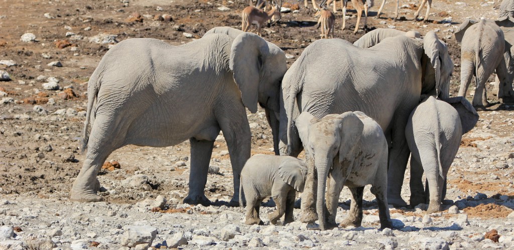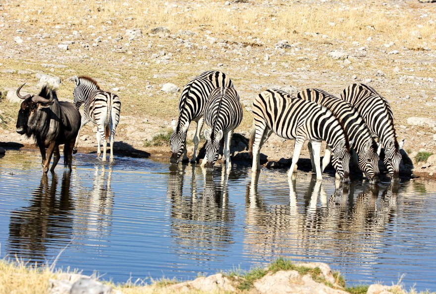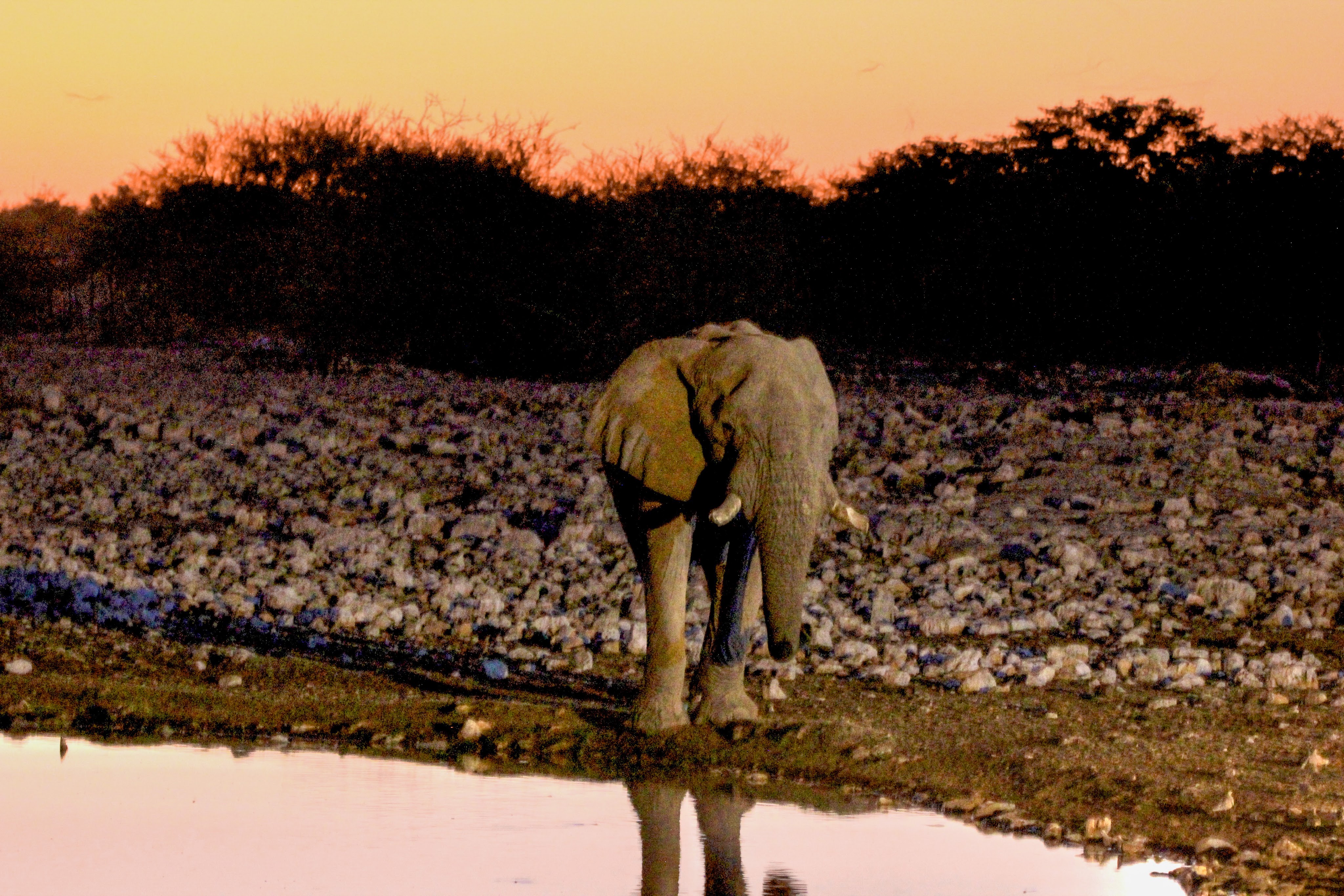 Retour en fin de journée à Okaukuejo pour un repas standard et une virée au waterhole où à nouveau des rhinocéros et des girafes viendront faire le show accompagnés d’un éléphant.