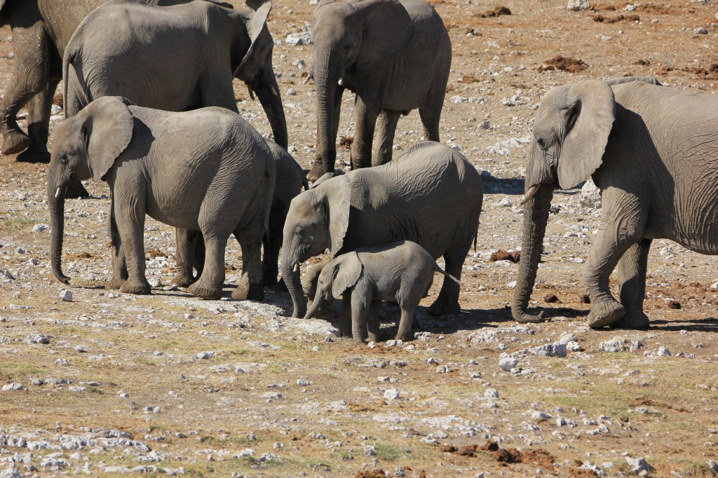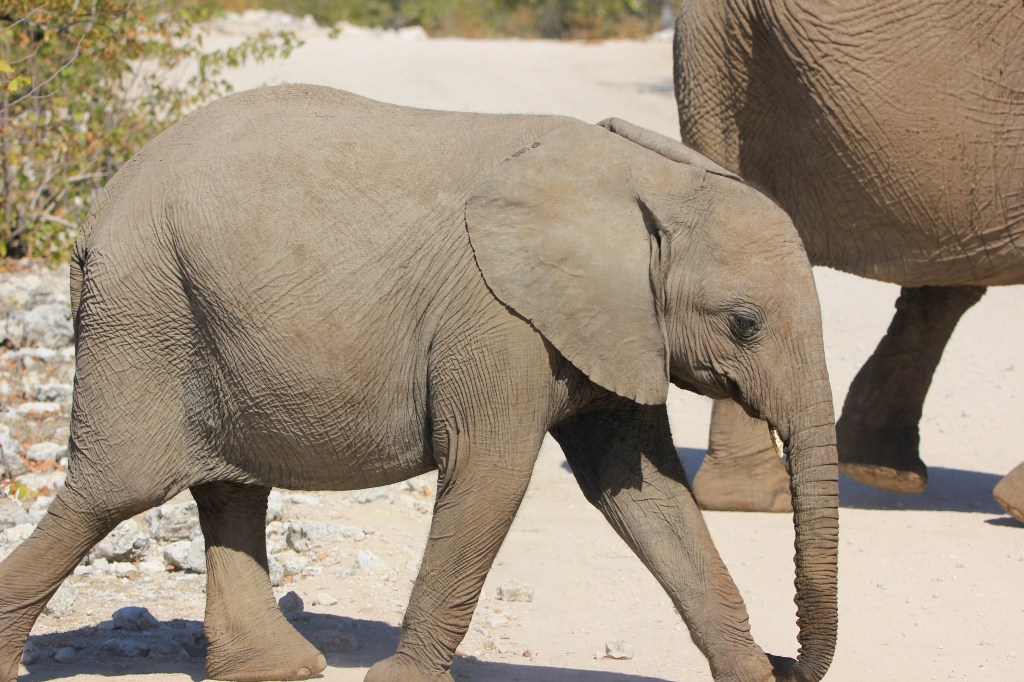 Nous reprenons la route direction Namutoni, on fait une ou deux haltes et nous avons vraiment beaucoup de chance, une maman zèbre et son petit posent au bord de la piste, quand tout à coup un troupeau de femelles éléphants et des petits, trop beaux passent devant nous.
