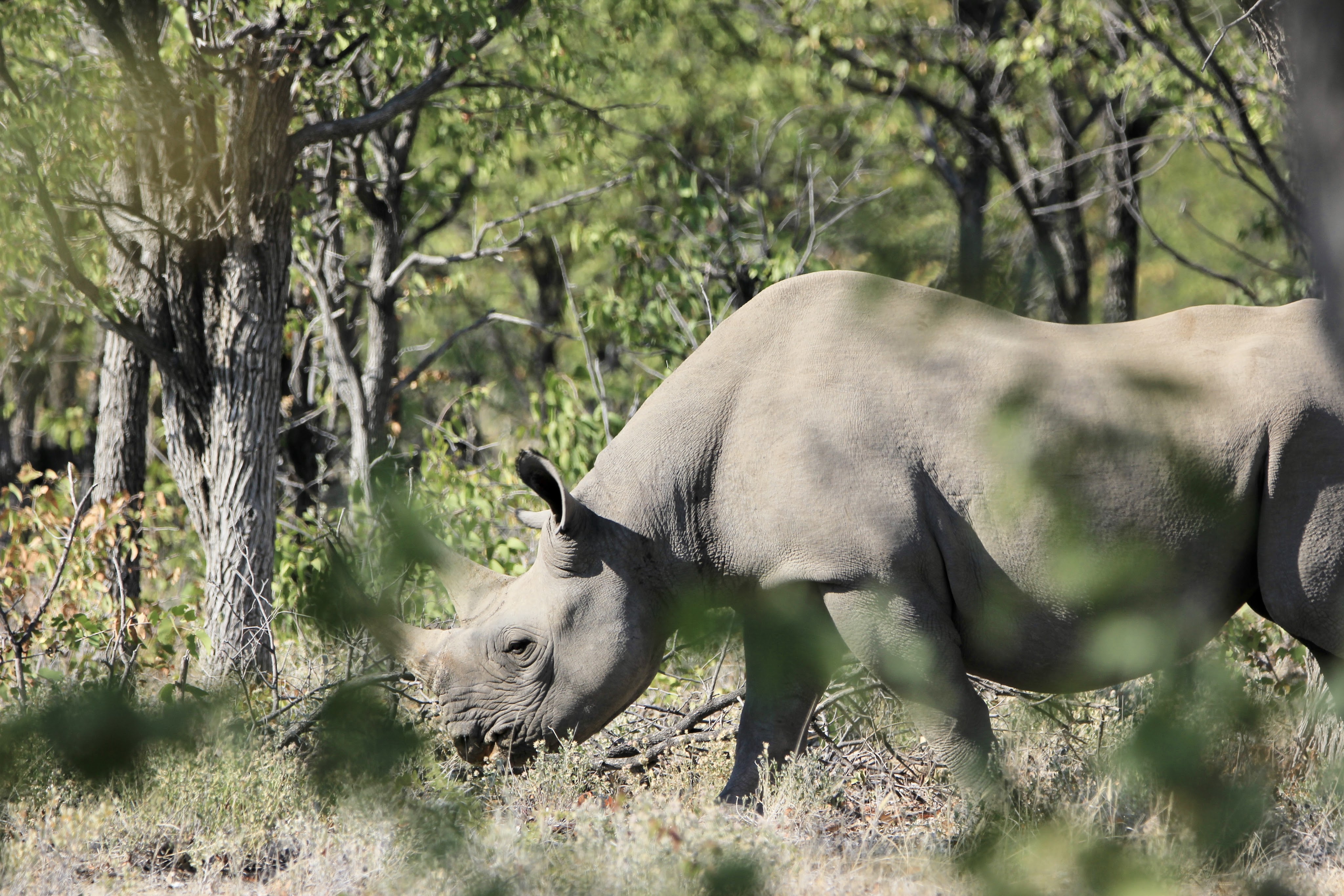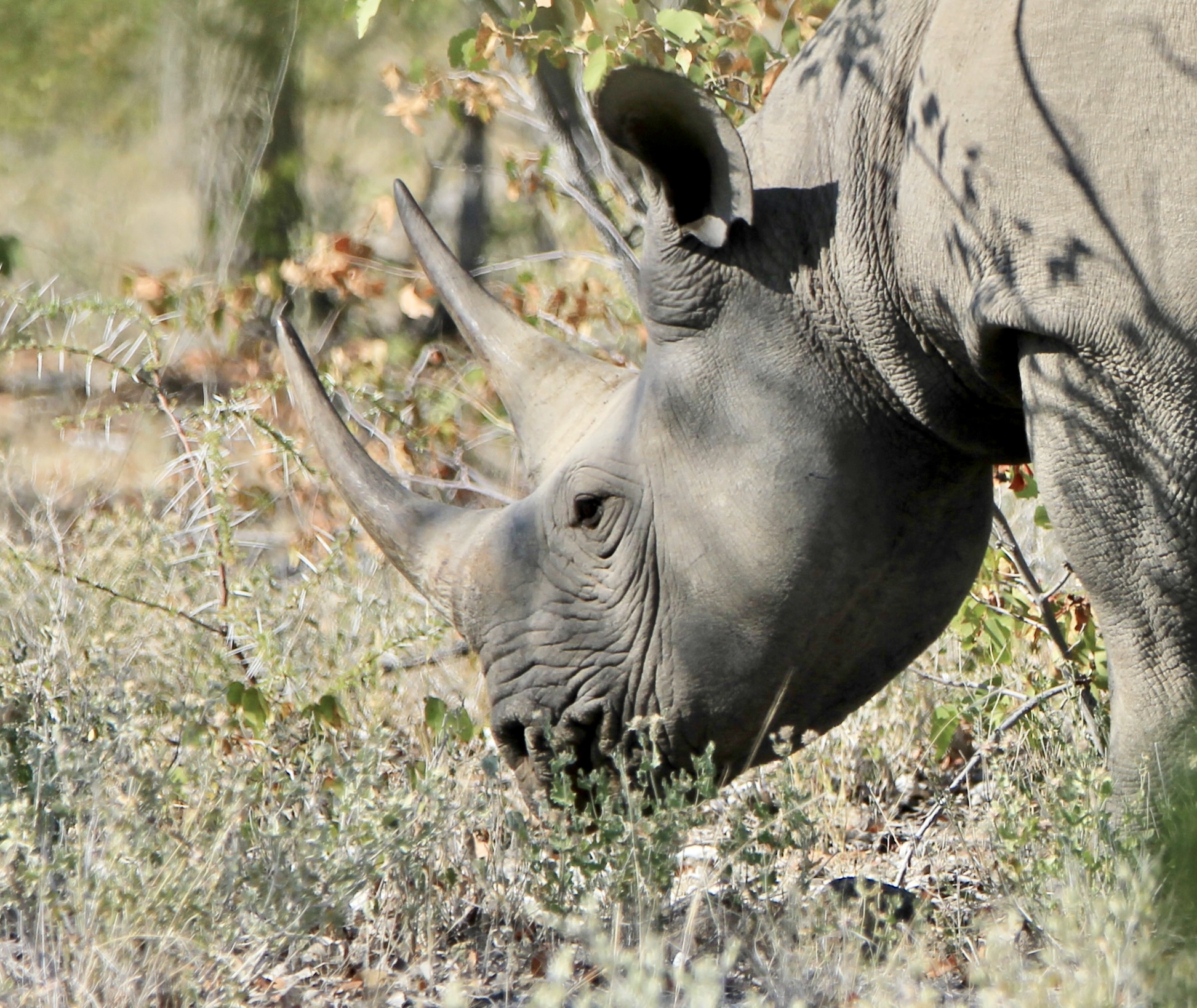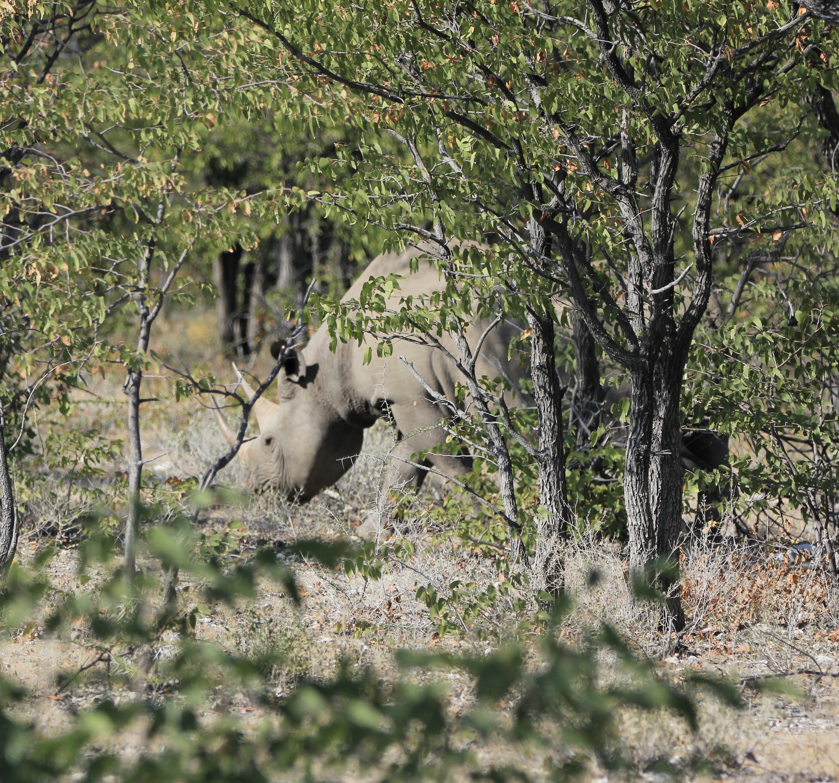 Au détour d’une piste nous voyons deux véhicules arrêtés, nous ralentissons et quel incroyable spectacle, une maman rhinocéros et son petit… c’était juste fou… nous avons bien pris le temps de les photographier, même si le petit était toujours caché un peu par la végétation.