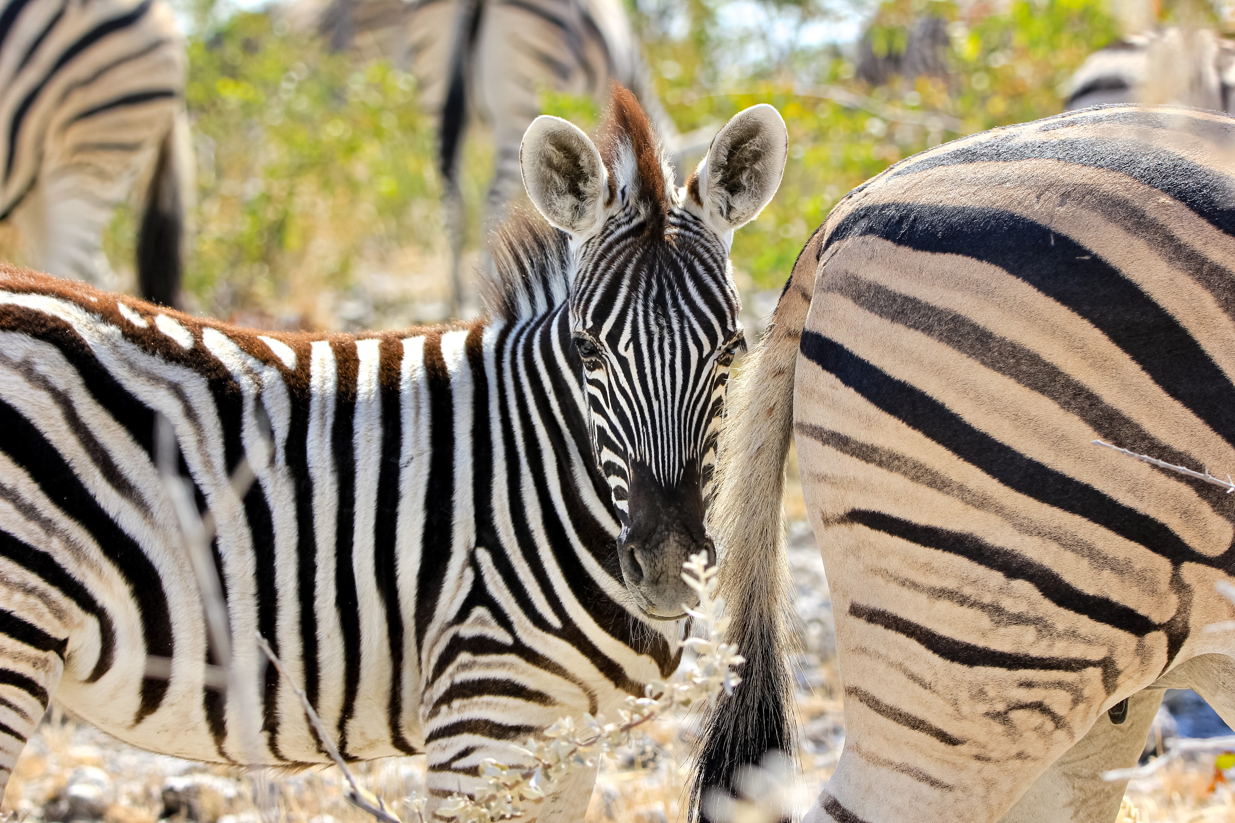 Juste avant la pause de midi à Halali, nous tentons un autre point d’eau et trouvons un grand troupeau de zèbres, on s’arrête un instant pour prendre quelques photos puis sur le retour nous tombons nez à nez avec 4 males éléphants.