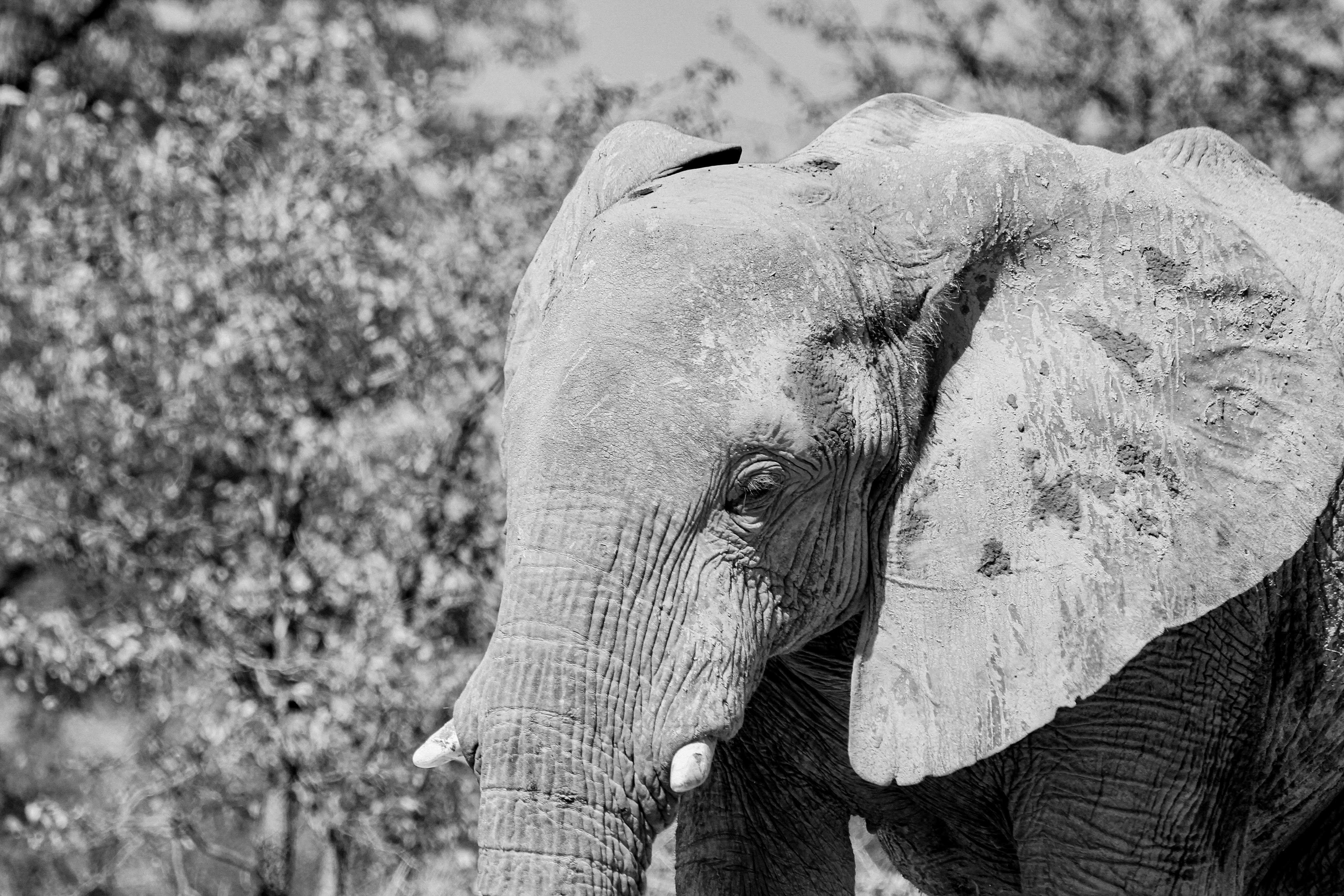 ET une fois de plus la chance nous souri, un vieux mal éléphant couvert d’argile blanche marche tranquillement au bord de la piste… Majestueux
