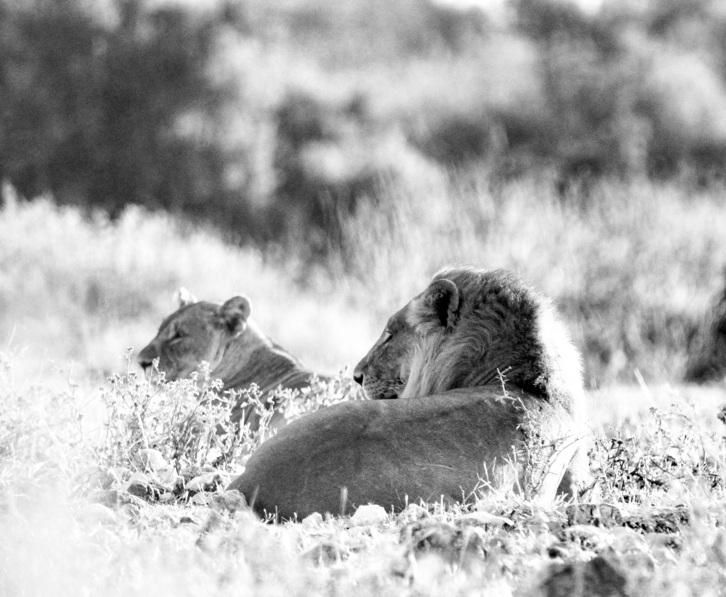 Nous arrivons lorsque le roi mange un gnou avec une femelle et un petit qui le regardent manger. Le roi finit tranquillement son festin, s’étire et se rend au point d’eau. Sa démarche est chaloupée, il n’est visiblement pas pressé, à ce moment précis tous les animaux présents, par dizaines, marquent l’arrêt. Cela ressemble au jeu d’enfant 1,2,3 soleil.
