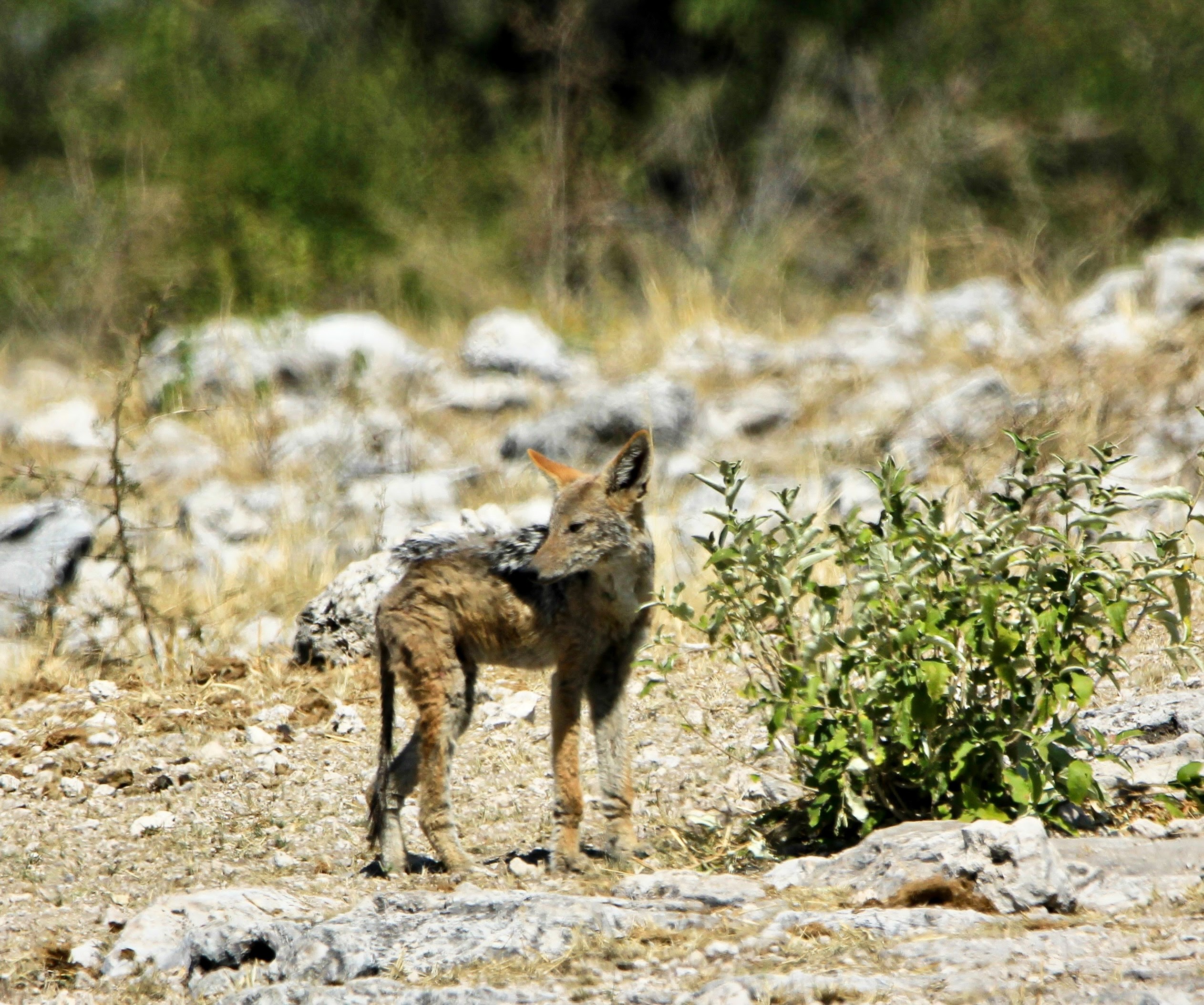 Nous arrivons à un waterhole, une voiture est immobilisée depuis un moment … il nous faudra de la perspicacité pour voir le chat sauvage caché derrière une pierre, nous attendons et arrivons à la photographier malgré son déplacement rapide.