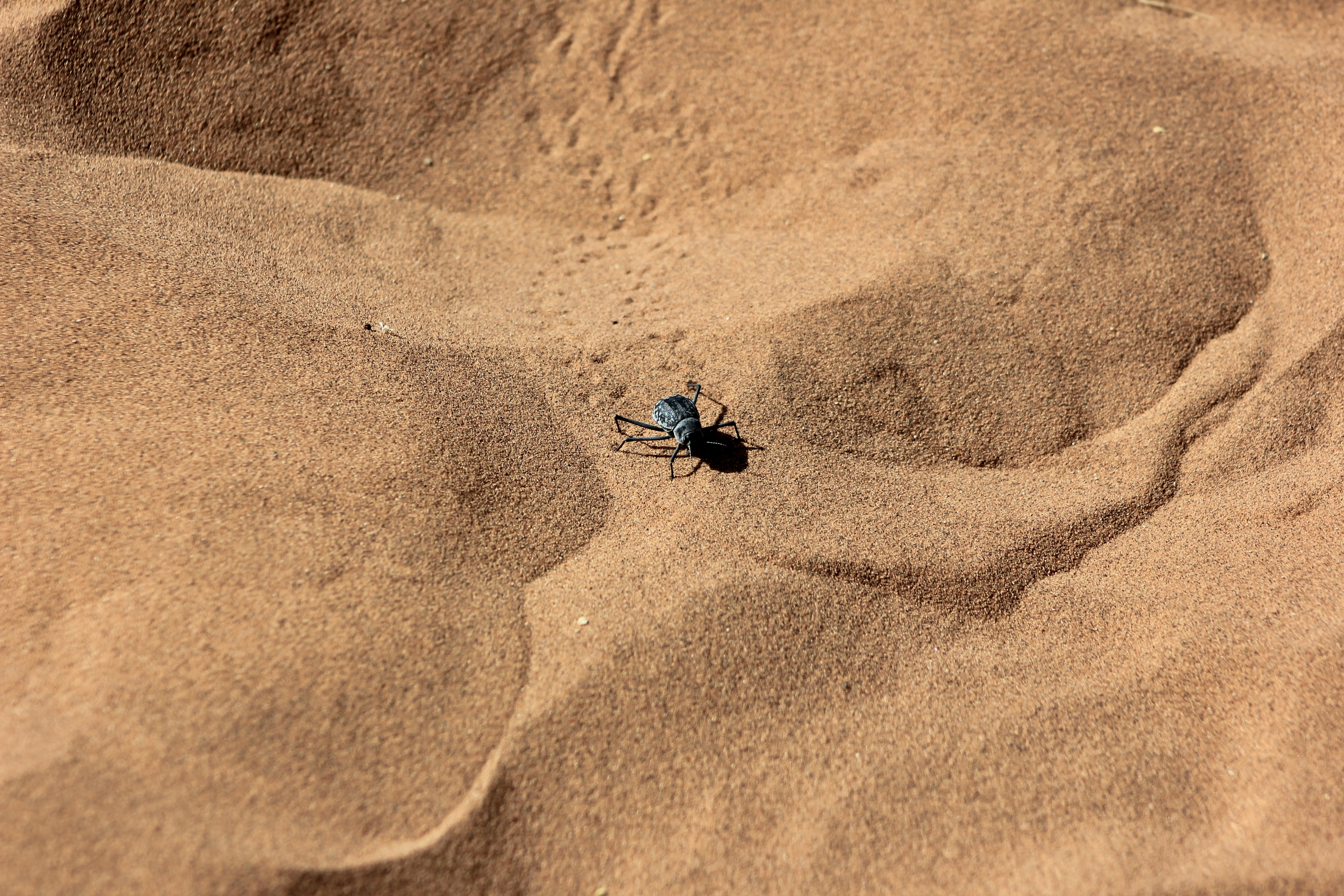 C’est un coléoptère capable de récupérer de l’eau et de survivre dans ces régions où il ne pleut jamais. Le brouillard matinal forme des gouttelettes sur sa carapace qui est plus fraiche que le sable, grâce à ses pattes arrières plus grandes il fait glisser l’eau jusqu’à sa bouche.