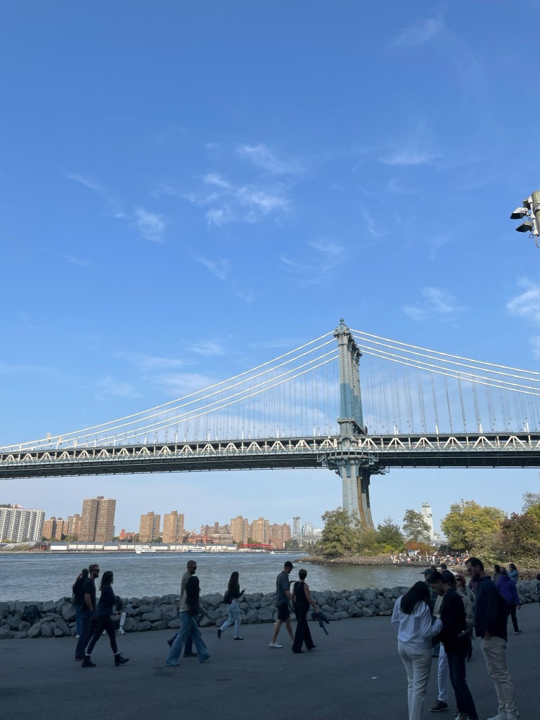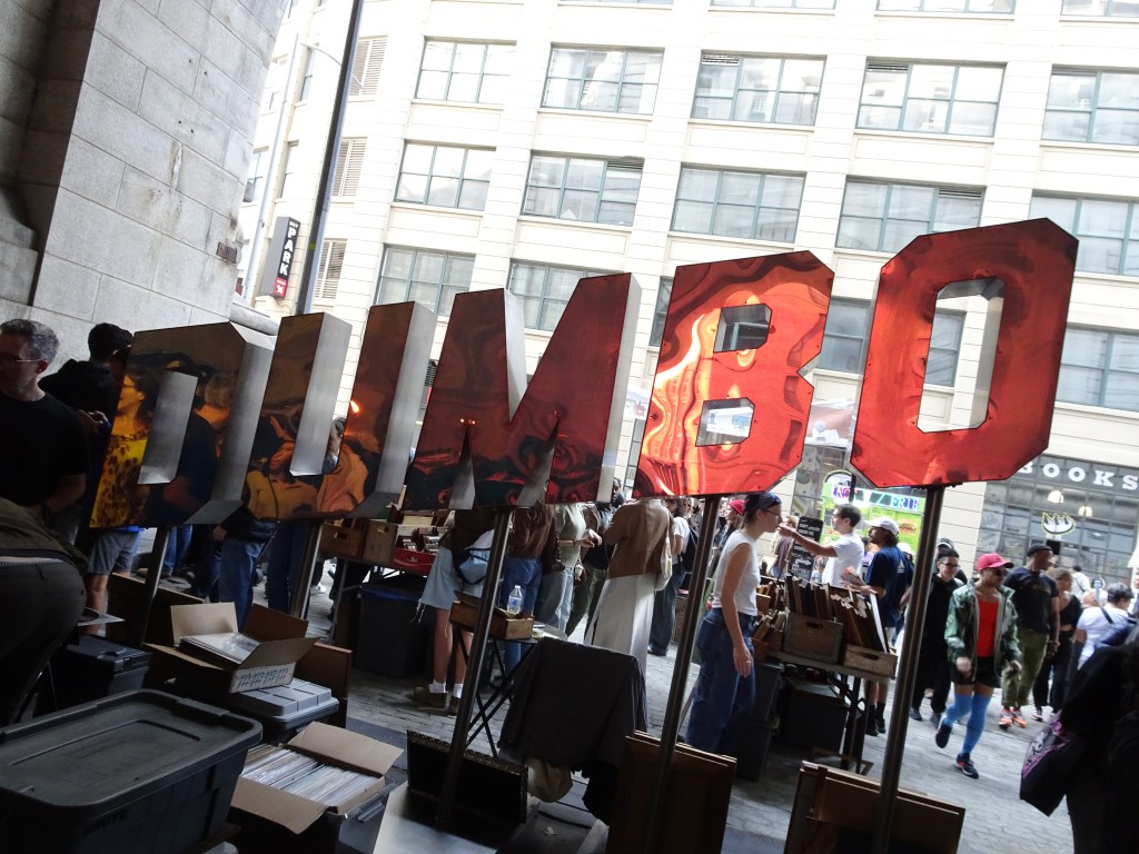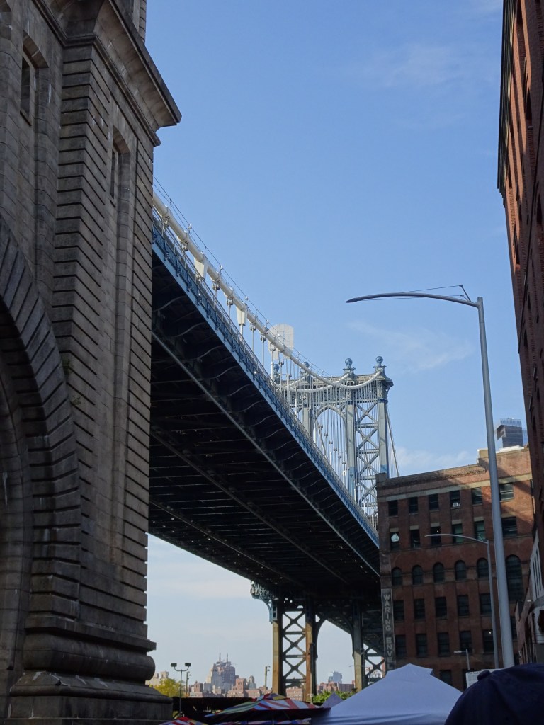 PARCE QUE L’ON SE DIT TOUT en quittant le quartier juif nous nous trouvons un court moment sous le pont du métro et l’ambiance change… des gens zonent sous le pont et dorment dans des épaves, des éclats de voix résonnent, ça aussi c’est New-York des zones de non droit. Nous allongeons le pas et la foule de Dumbo en devient presque réconfortante.