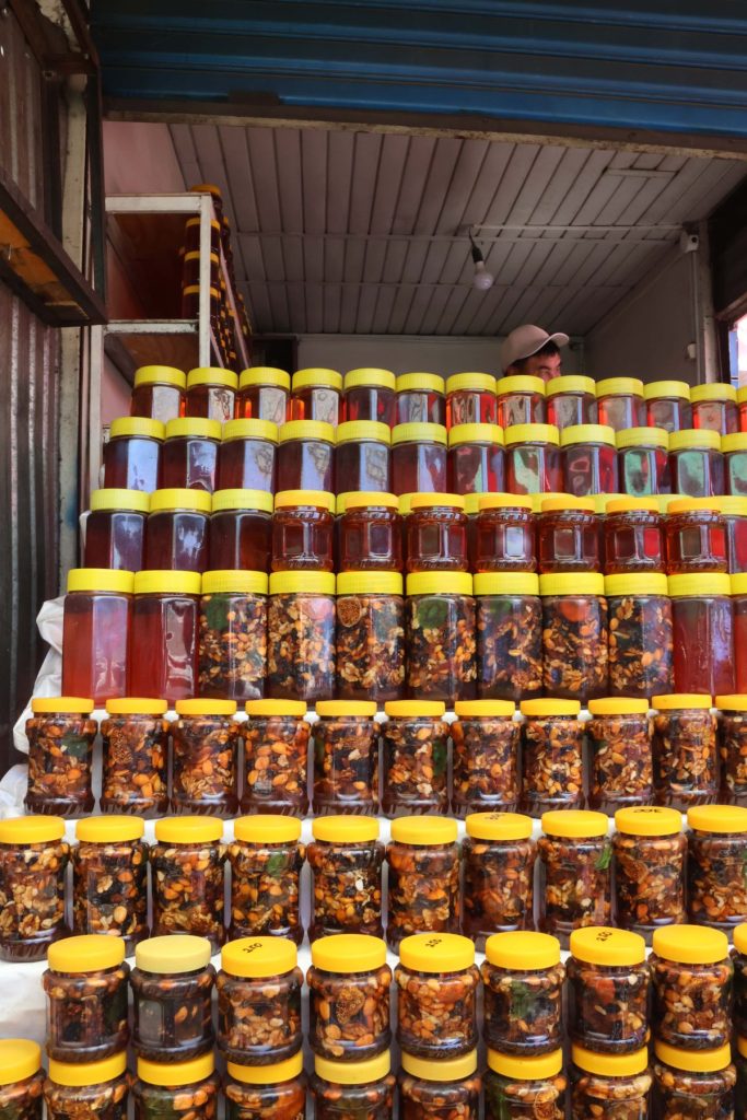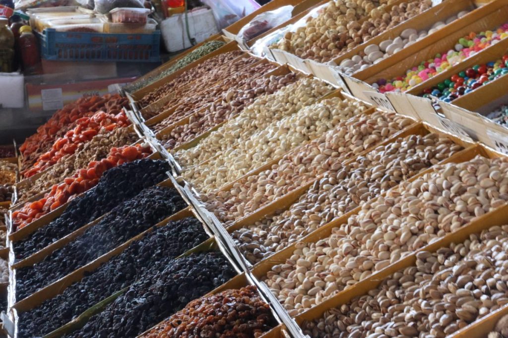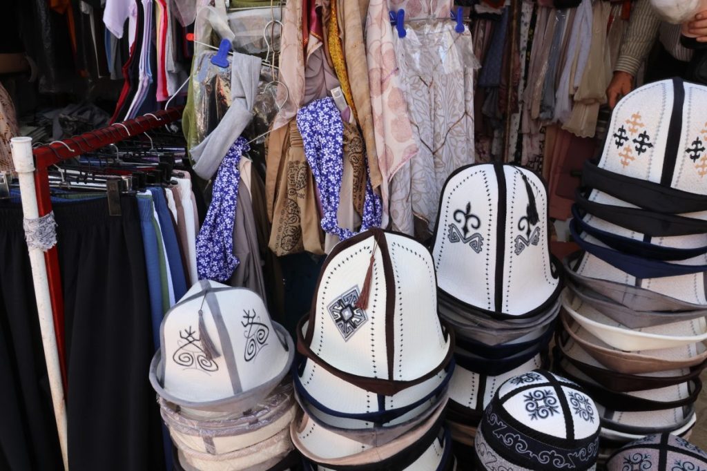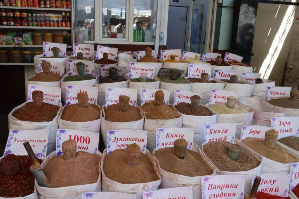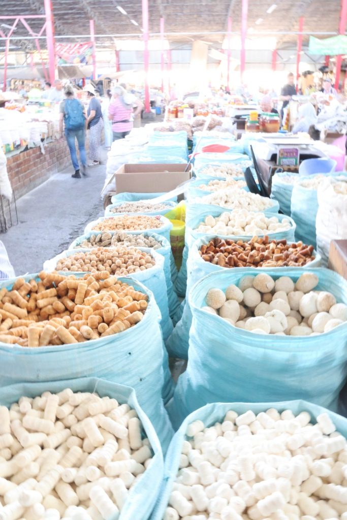 Elle se situe proche du Kazakhstan voisin, comme déjà évoqué son architecture rappelle l’ère soviétique avec de nombreux bâtiments en marbre ou béton plutôt massifs et austères qui bordent de grandes avenues avec de chaque côté des petits canaux d’irrigation qui donnent de l’eau en abondance aux nombreux arbres. Nous commençons notre visite sous un soleil de plomb au bazar d’Osh, toutes les spécialités kirghizes sont réunies, des fruits et légumes dont une bonne partie aussi séchés, le kurut (fromage séché) du miel avec pour certains pots des fruits secs et le lepyoshka ( pain rond avec des décorations magnifiques ) Mais il y a aussi le quartier des bouchers et des textiles où l’on trouve beaucoup de produits faits en laine. N’hésitez pas à goûter le fameux kymyz, le lait de jument fermenté… je vous laisse la surprise.