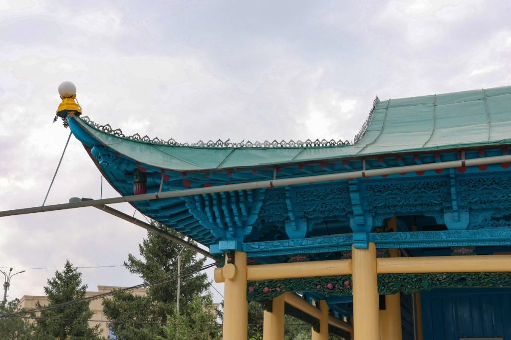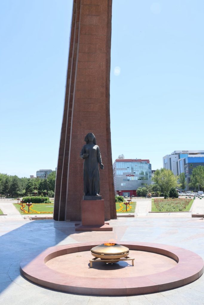 Nous poursuivons notre visite à pas lents sous une chaleur étouffante, même les sommets enneigés au loin ne nous rafraichissent pas. Nous nous rendons sur la Place de la Victoire en l’honneur de la victoire sur l’Allemagne nazie, elle a été érigée en 1985, pour l’anniversaire des 40 ans de la fin de la guerre. Au centres des 3 arcs représentant une yourte se trouve une flamme éternelle.