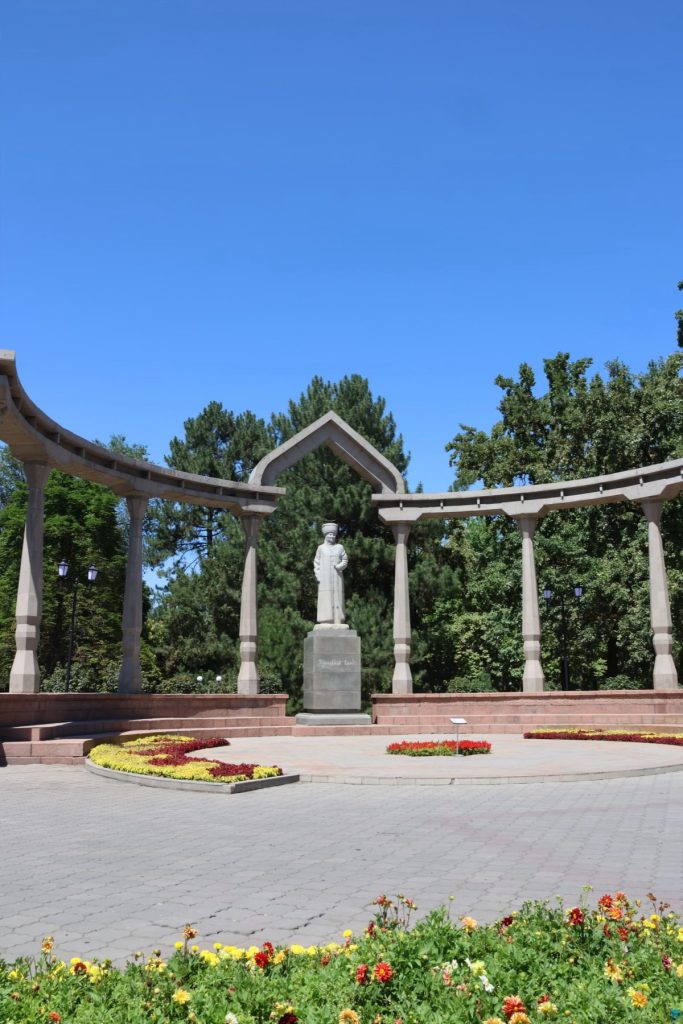 Nous nous approchons du parc Dubovy où la fraicheur des grands chênes nous tend les bras. Au centre du parc, nous contemplons la sculpture de la Reine du Sud. Kurmanjan Datka, une figure historique kirghize, également connue sous le nom de “Reine d’Alai”. Elle est une figure importante de l’histoire kirghize, reconnue pour son rôle de leader politique et son héritage féministe, démocratique et patriotique, son portrait apparaît également sur les billets de 50 soms.