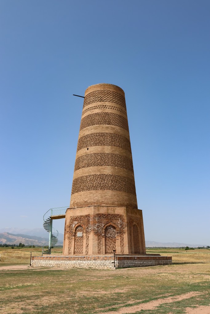 La tour Burana est un vestige fascinant situé dans la vallée de Chuy, près de la ville de Tokmok, cet ancien minaret est tout ce qui reste d’une ancienne ville appelée Balasagun, autrefois florissante et capitale de l’Empire Karakhanide. À l’origine, elle mesurait près de 45 mètres de haut, mais à cause de séismes elle ne fait plus que 25 mètres.
