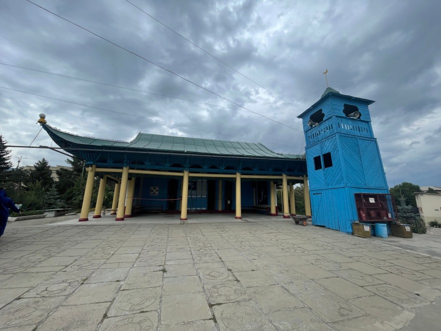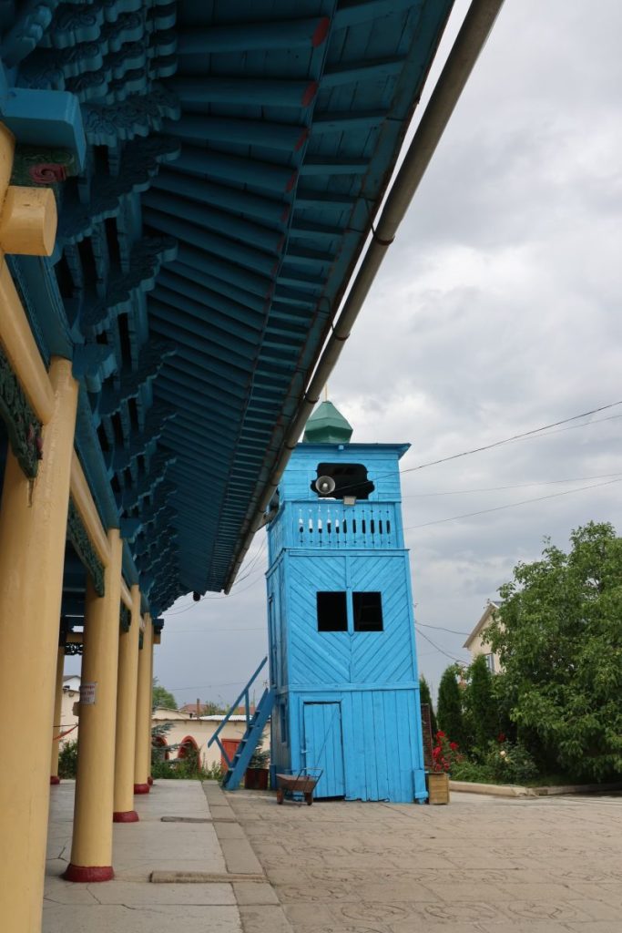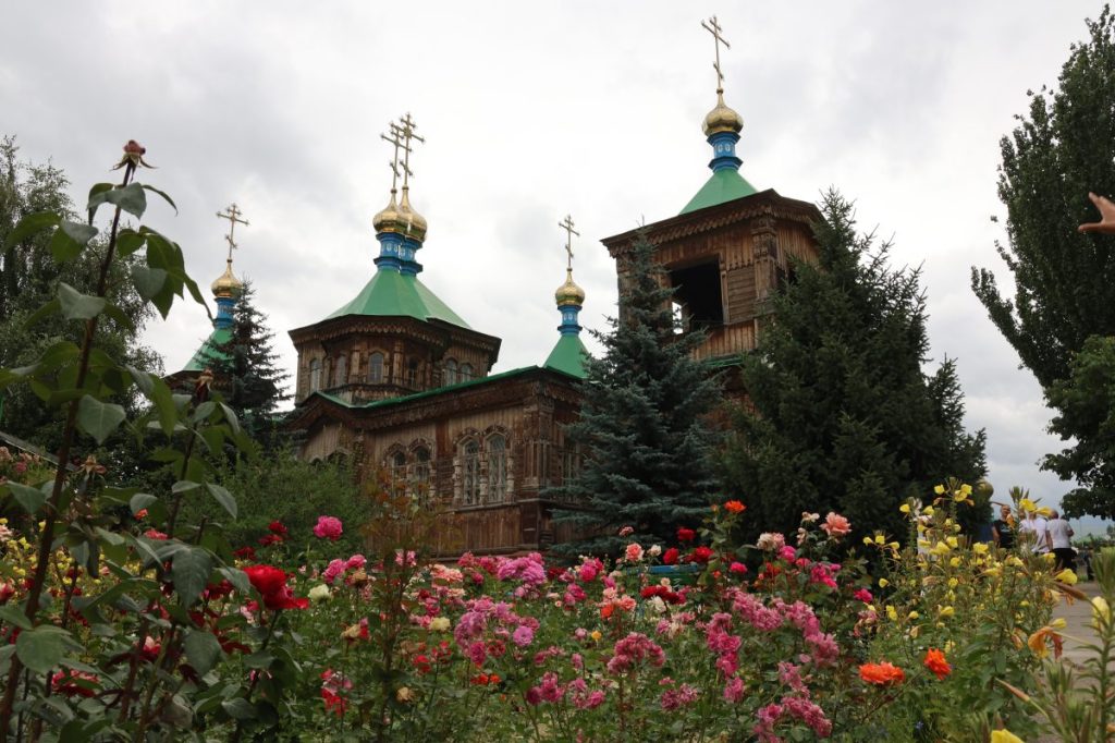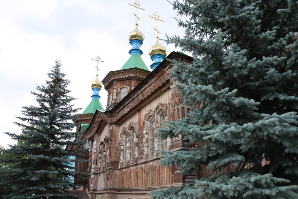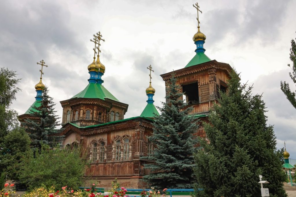 Nous nous rendons à la cathédrale de la sainte Trinité symbole de Karakol. L’histoire particulière de cette cathédrale datant de juillet 1869, lorsque Karakol était une ville de garnison, elle fût d’abord construite en briques pour la garnison tsariste. Puis reconstruite en 1889 en bois suite à un violent tremblement de terre. Après la révolution de 1917, elle fut utilisée pendant de nombreuses années comme centre d’entraînement, qui abritait un gymnase féminin, un établissement d’enseignement supérieur, une salle de sport, un théâtre et même comme magasin de charbon. Puis, en 1991, après l’effondrement de l’Union soviétique et l’indépendance du Kirghizistan, les autorités locales rendirent le bâtiment à l’église. La décoration intérieure est très intéressante et reflètent bien les traditions russes et leurs icones ainsi que les traditions locales avec des reliques de martyrs locaux.