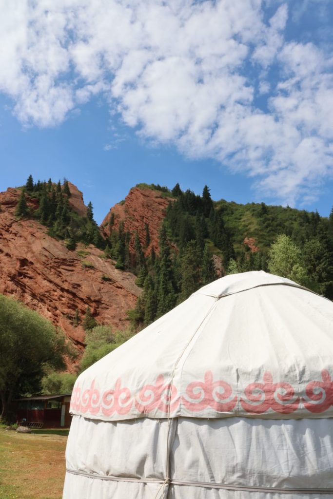 Je vais mieux, mais je me sens faible. L’envie de découvrir sera plus forte … Et nous voilà parti pour la région de Jety Oguz qui est considéré comme l’un des plus beau sites du Kirghizistan ! Entre vallées luxuriantes et gorges impressionnantes. Elle sert aussi de réserve zoologique nationale, abritant de nombreuses espèces d’animaux, mammifères et oiseaux.