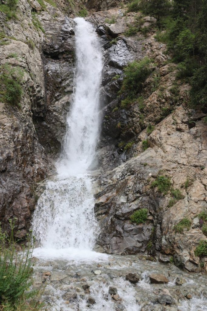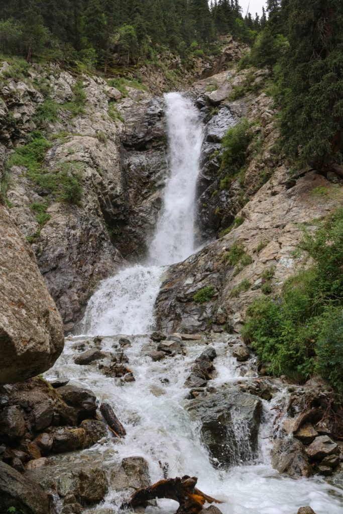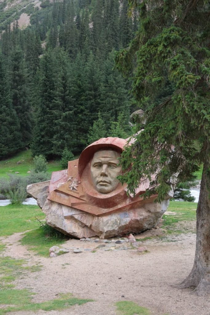 On reprend la route en longeant le lac direction Barksoon,qui signifie en Kirghize “les larmes du léopard de neige”. Cette région, habitée par de nombreux léopards, a deux belles cascades d’où elles tirent ce nom poétique. Nous montons direction les sommets enneigés jusqu’au monument en hommage à Youri Gagarine. Impossible de vérifier cette info, mais il semblerait que M. Gagarine venait facilement se reposer entre deux missions dans la vallée de Barksoon. Nous montons jusqu’à la première cascade, la montée est ardue enfin sans avoir mangé depuis 2 jours et surtout nous sommes à 1’800m d’altitude. Les embruns de la cascade nous rafraichissent et les premières gouttes de pluie accompagneront notre descente.