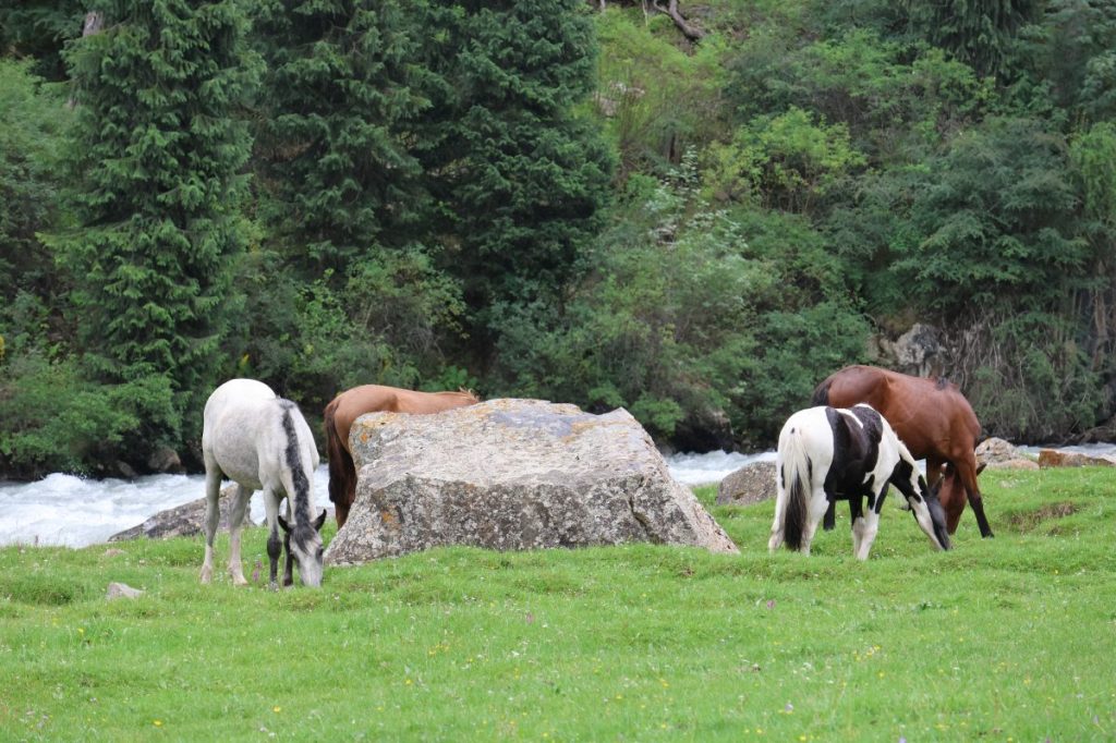 Aujourd’hui, après un petit déjeuner bruyant et oui tous les habitants des maisons de vacances doivent bénéficier du service hôtelier. Nous prenons la route direction les gorges de Grigorievskoe et Semienovskoe. Les paysages rappellent la Suisse si l’on enlève les yourtes et les chevaux qui peuvent se déplacer à leur guise. (certains sont tout de même entravés et ça me plaît beaucoup moins)