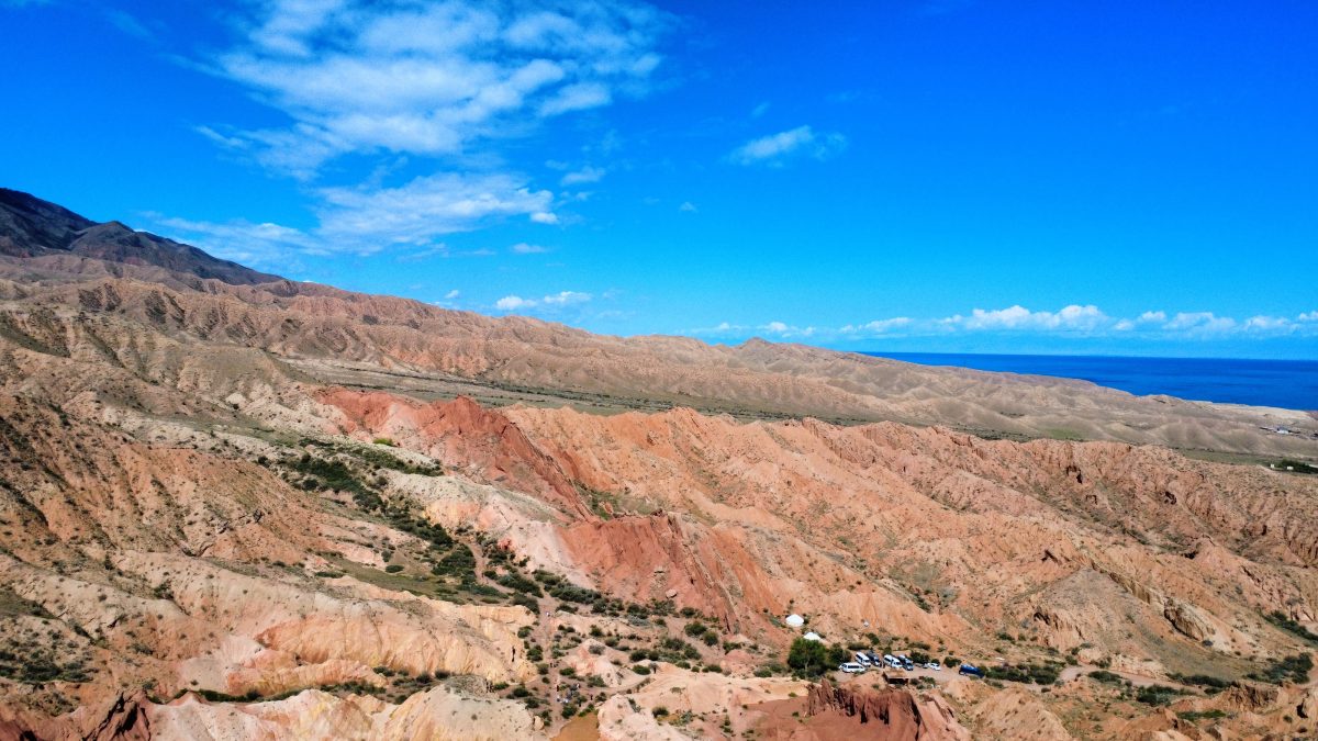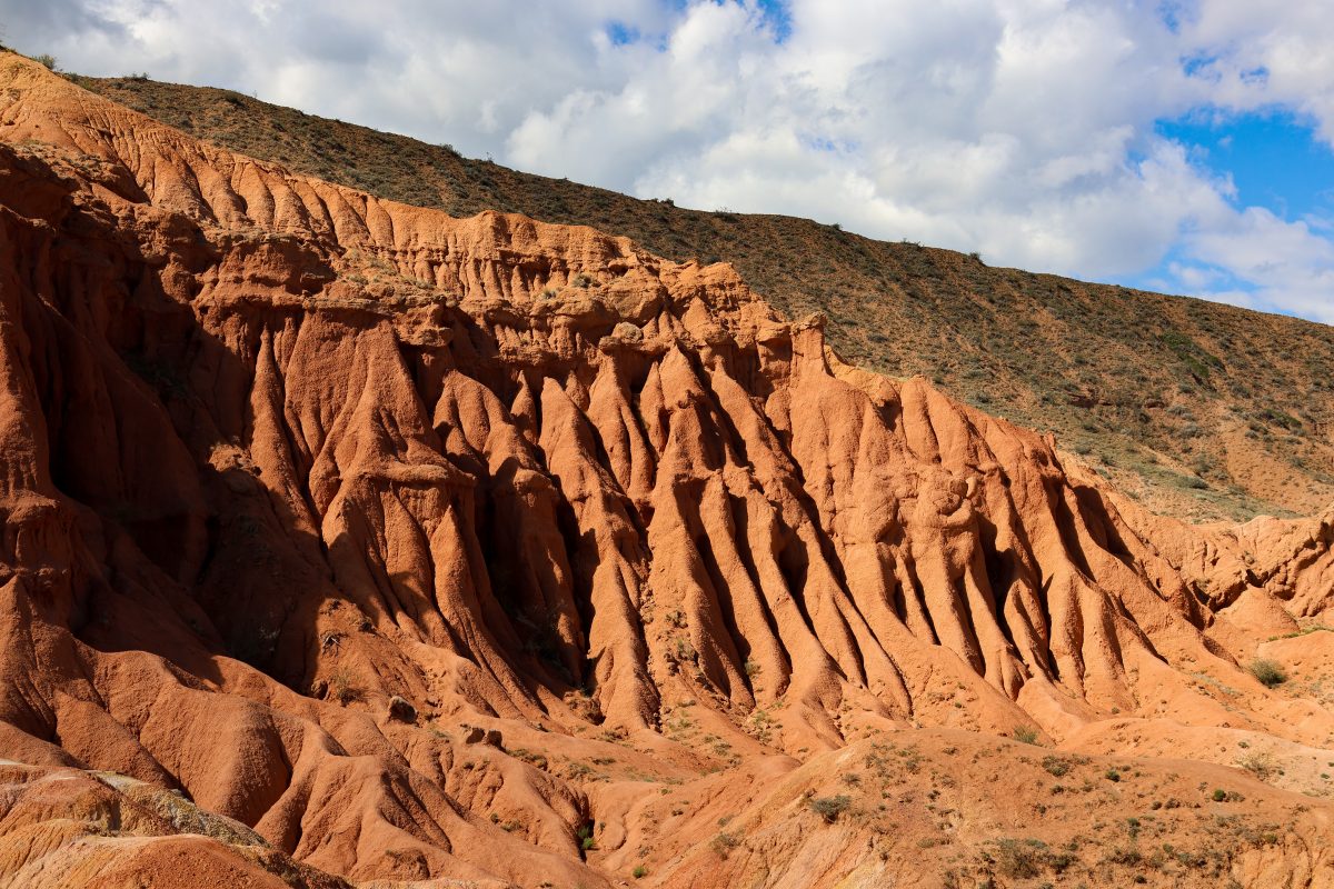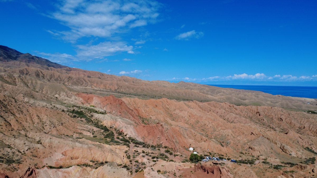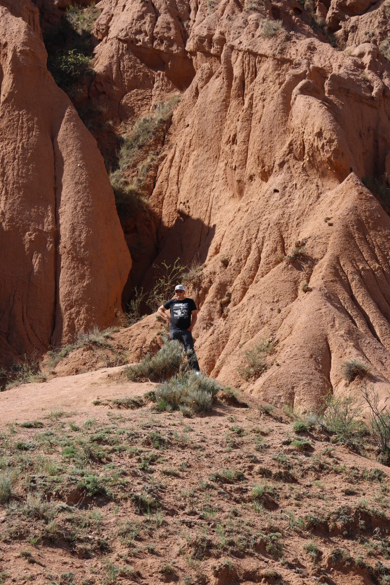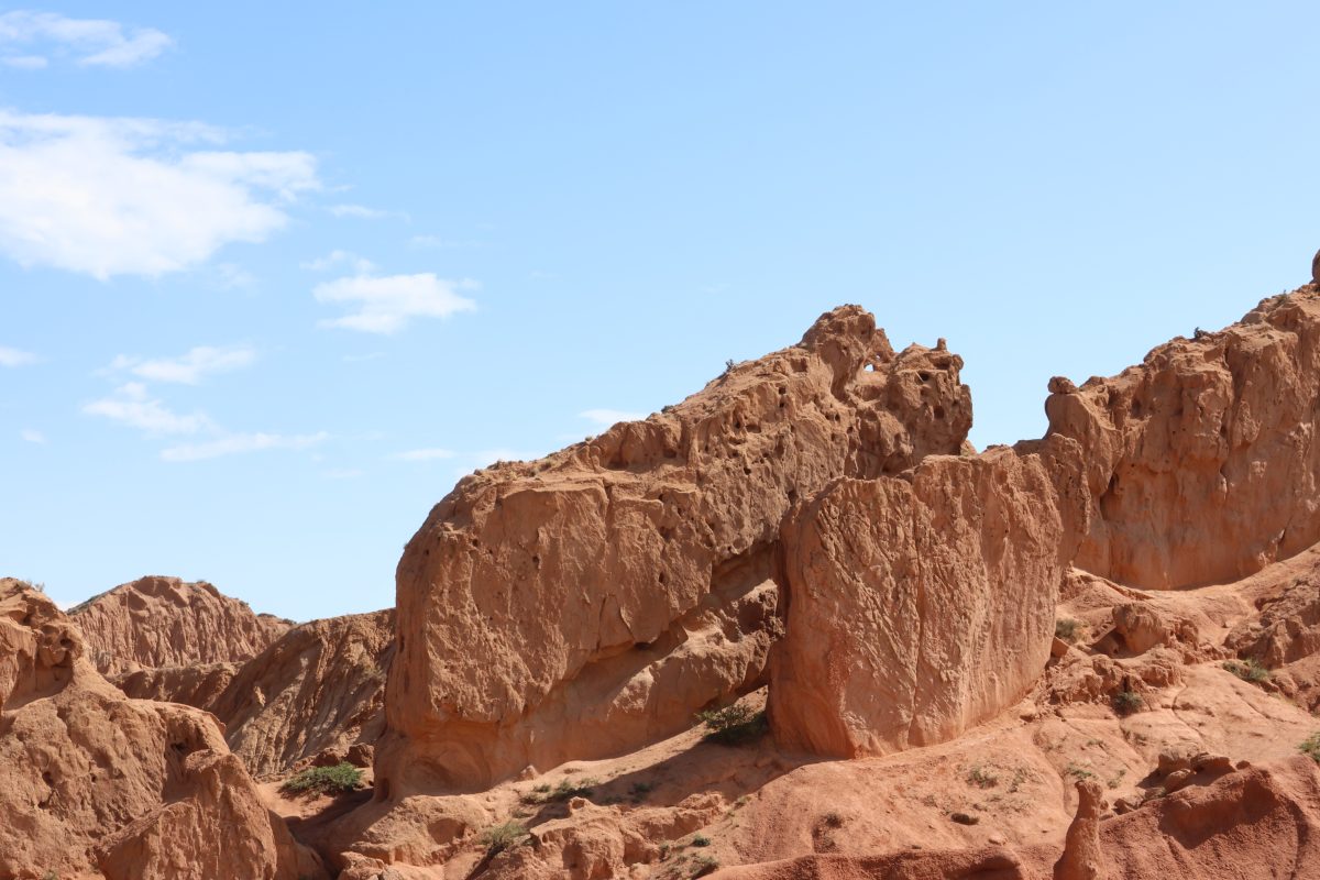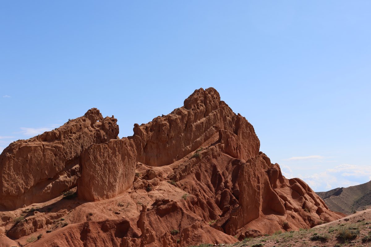 Nous nous réveillons avec un porridge fumant, du thé et des confitures maison, quel accueil !! Nous regrettons de devoir quitter ce petit havre de paix enveloppant. Puis départ pour un endroit que j’attendais avec impatience le Fairytale canyon ou le Canyon de Skazka. Et je vous promets qu’il porte bien son nom. Nous arrivons relativement tôt au canyon en tous cas avant les touristes asiatiques et pouvons ainsi en profiter en toute quiétude. Le canyon se distingue par ses couleurs vives, allant du rouge et de l’orange au jaune, dues aux dépôts minéraux, ses formes féériques ont été sculptées par l’érosion des roches, donnant ainsi l’impression d’être entouré de châteaux, d’animaux sensationnels ou de géants endormis. La vue sur le lac d’Issyk Kul ajoute une touche de bleu et de profondeur aux photos. La légende raconte que les formations rocheuses seraient les vestiges d’un dragon pétrifié. Je vous laisse admirer.