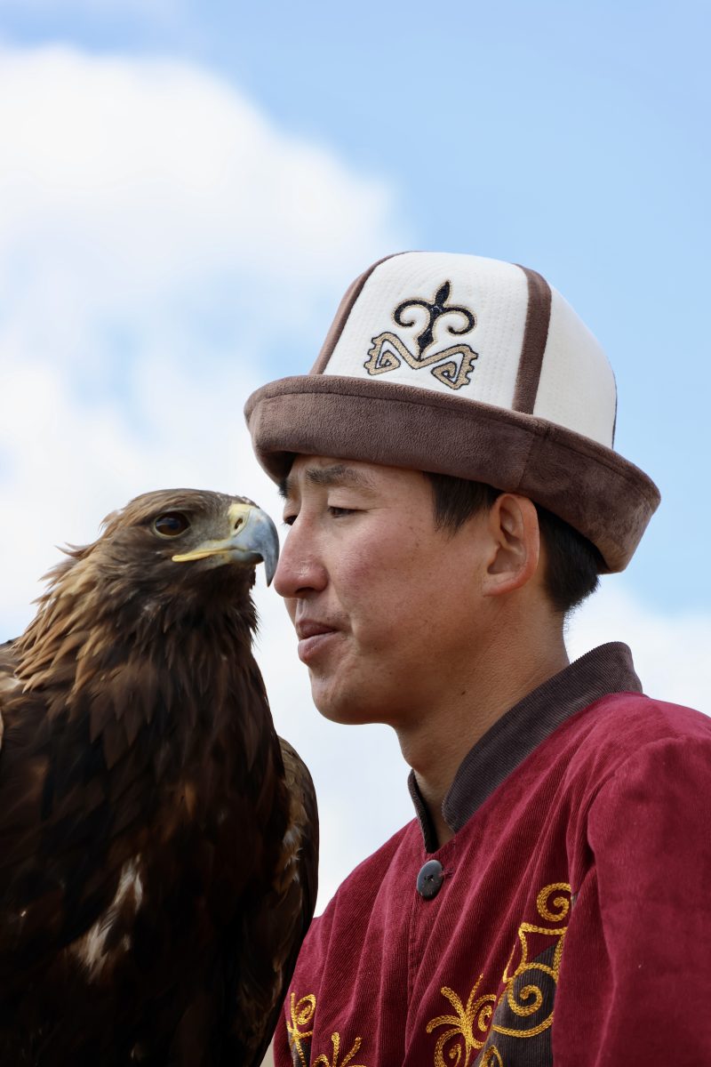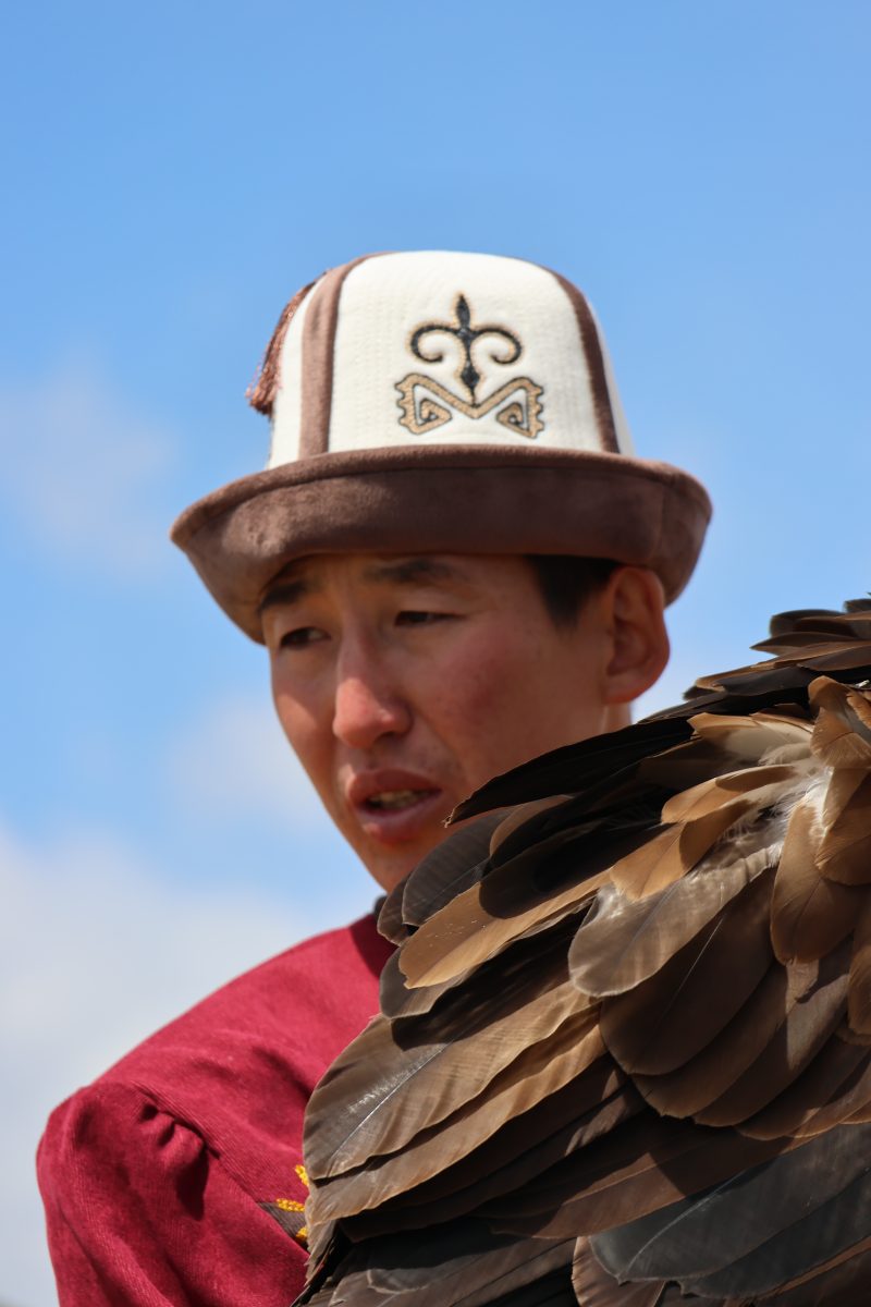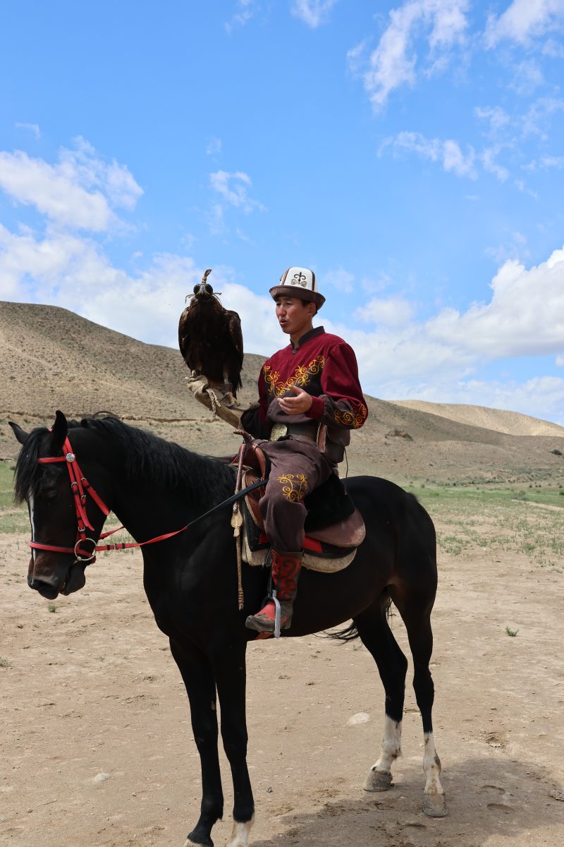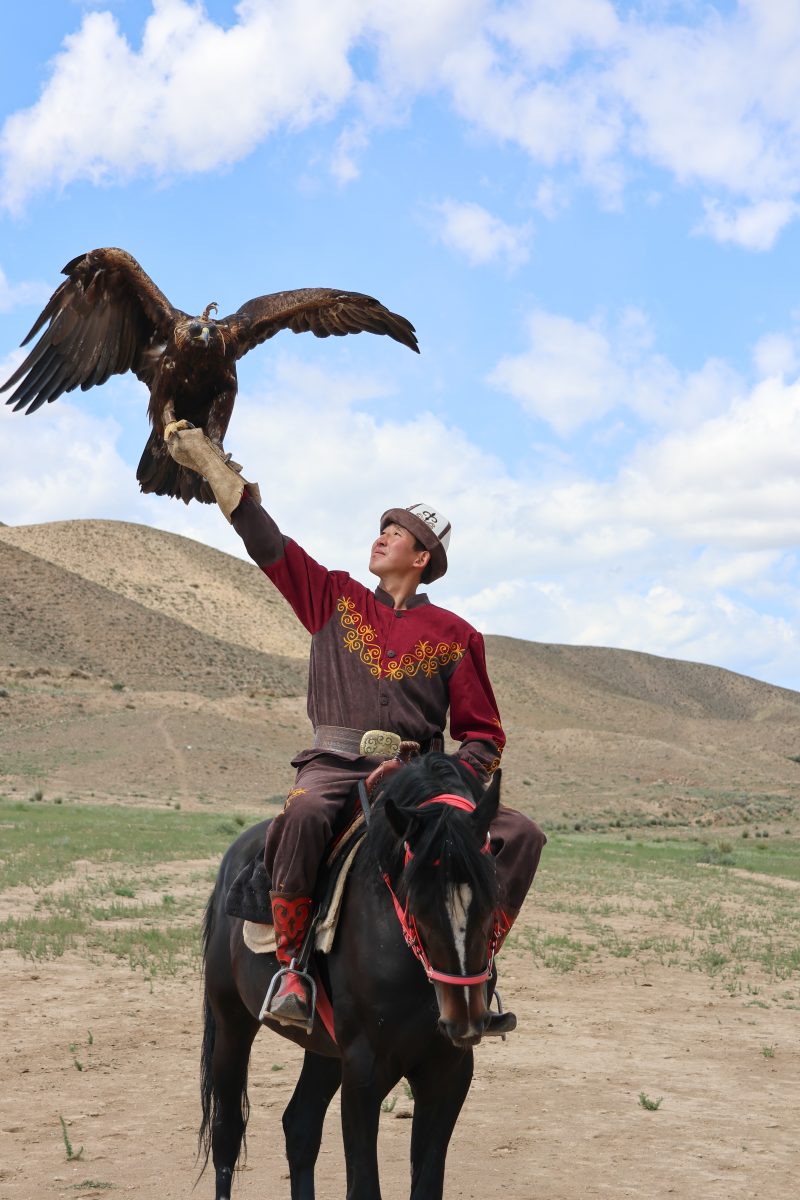 Nous reprenons la route avec des images plein les yeux et en remerciant le guide de nous y avoir conduit avant l’arrivée massive (tout est relatif) de touristes. Nous longeons le lac direction la ville de Bokonbaevo et sortons en direction d’une petite colline. Où nous retrouvons un jeune kirghize en costume traditionnel qui nous explique la chasse à l’aigle. La chasse à l’aigle, ou berkutchi, est une tradition ancestrale pratiquée par les nomades kirghizes depuis des siècles. Cette technique consiste à dresser des aigles royaux pour chasser des petits mammifères comme les renards ou les lièvres dans les montagnes. Ils prennent les aigles dans le nid à peine sorti de l’oeuf, uniquement des femelles car elles sont plus robustes, plus grandes et plus vives. Elles peuvent voir une proie à plus de 5km. Les chasseurs gardaient leur aigle durant 10 à 15 ans et ensuite, par respect, lui redonnait sa liberté avec une petite cérémonie.