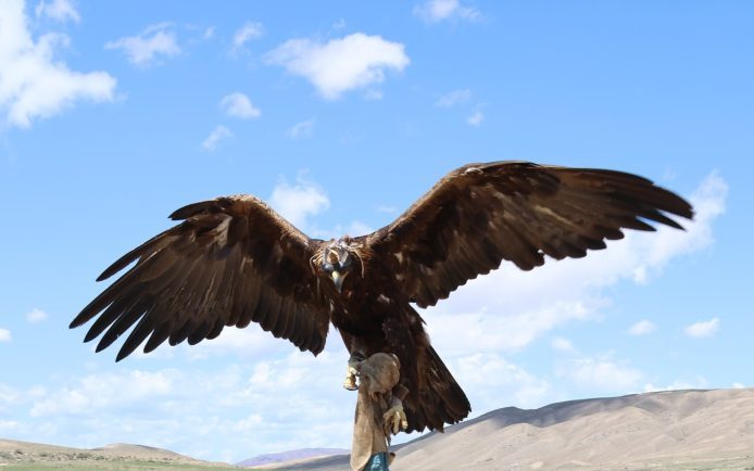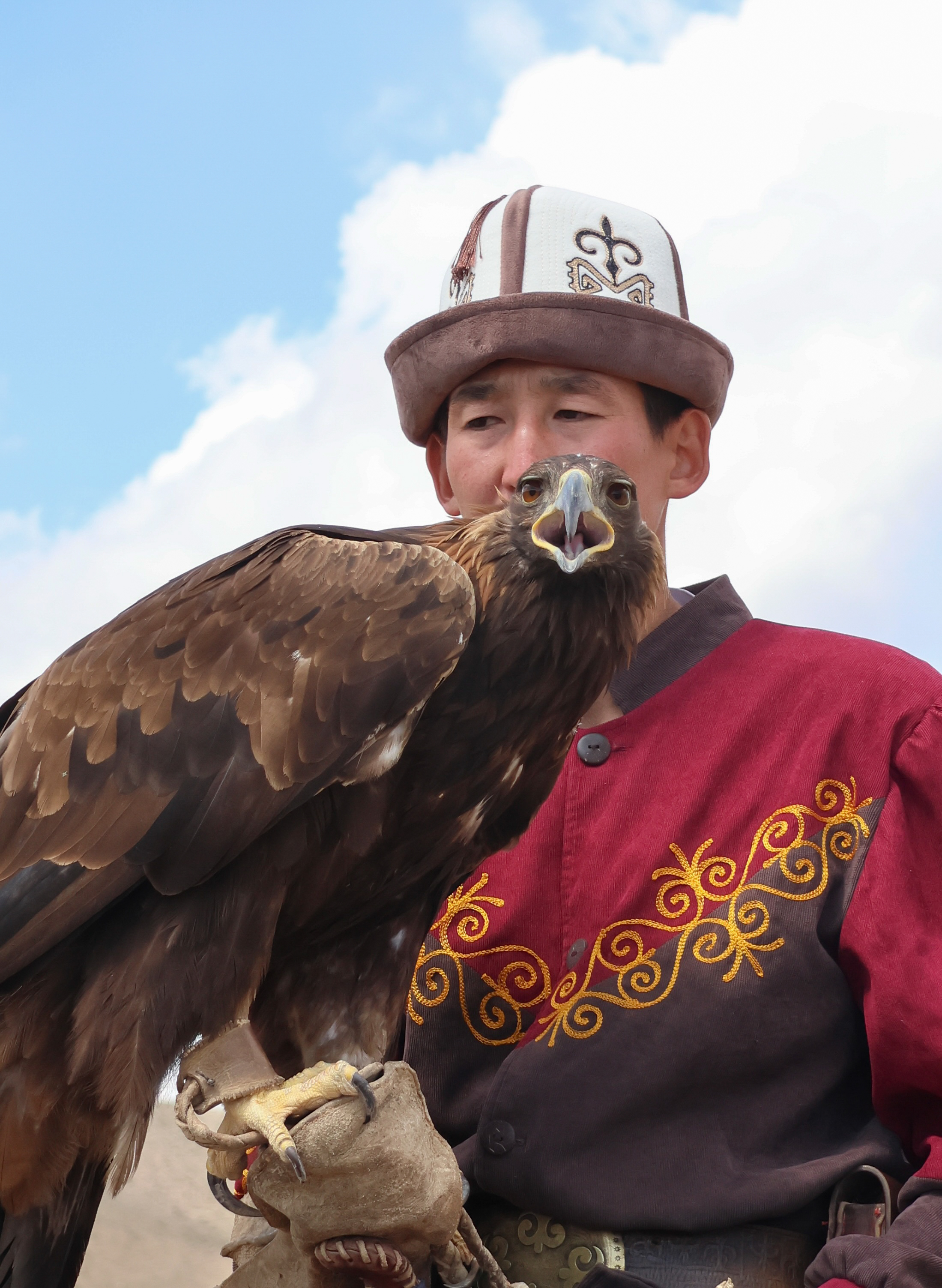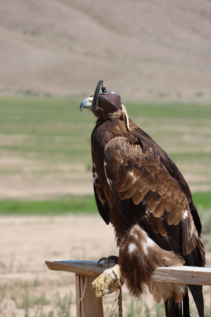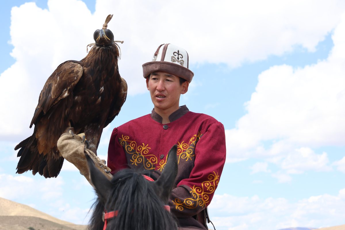Nous reprenons la route avec des images plein les yeux et en remerciant le guide de nous y avoir conduit avant l’arrivée massive (tout est relatif) de touristes. Nous longeons le lac direction la ville de Bokonbaevo et sortons en direction d’une petite colline. Où nous retrouvons un jeune kirghize en costume traditionnel qui nous explique la chasse à l’aigle. La chasse à l’aigle, ou berkutchi, est une tradition ancestrale pratiquée par les nomades kirghizes depuis des siècles. Cette technique consiste à dresser des aigles royaux pour chasser des petits mammifères comme les renards ou les lièvres dans les montagnes. Ils prennent les aigles dans le nid à peine sorti de l’oeuf, uniquement des femelles car elles sont plus robustes, plus grandes et plus vives. Elles peuvent voir une proie à plus de 5km. Les chasseurs gardaient leur aigle durant 10 à 15 ans et ensuite, par respect, lui redonnait sa liberté avec une petite cérémonie.