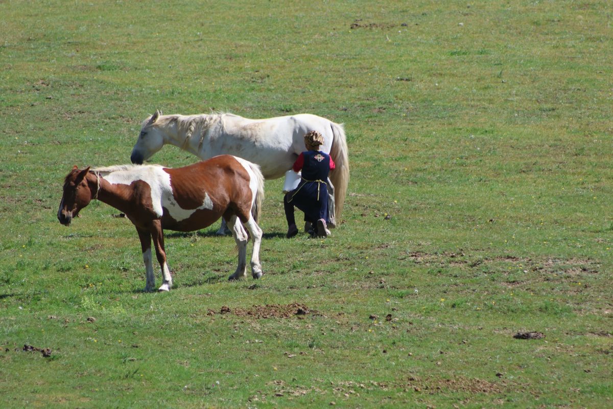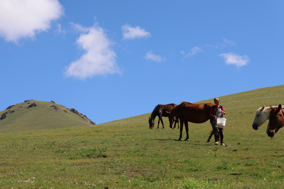 Aujourd’hui, nous avons beaucoup de route. D’abord, on doit se rendre à Naryn, (où nous mangerons ) pour ensuite prendre de l’altitude en suivant la route de la soie et découvrir le site extraordinaire de Tach Rabat. En chemin, nous faisons une halte au sommet d’un col et j’ai envie de partir prendre une photo d’une yourte avec une colline et des chevaux. Une dame est en train de traire une jument, sa tache finie elle m’invitera à déguster le lait chaud dans sa yourte, un moment fugace d’échange juste avec le regard.