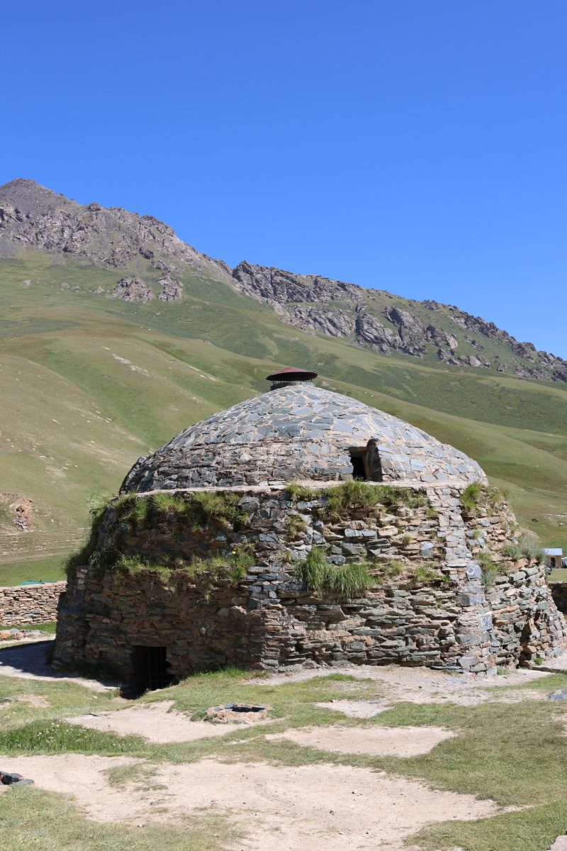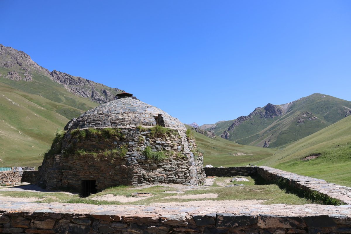 Après des km de piste, nous arrivons au caravansérail de Tach Rabat. Ce site historique est situé dans les montagnes du Tian Shan à environ 3 200 mètres d’altitude. Ce monument en pierre, souvent daté du XVe siècle, servait d’abri aux commerçants, voyageurs et caravanes sur l’ancienne Route de la Soie.