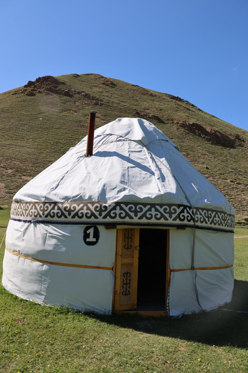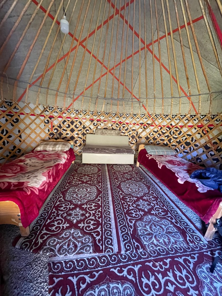Nous redescendons au village de Bokonbaevo où nous sommes accueillis dans une magnifique yourte au fond du jardin d’une très sympathique famille. Nous mangerons à la mode kirghizes parterre sur des coussins. Un vrai régal …