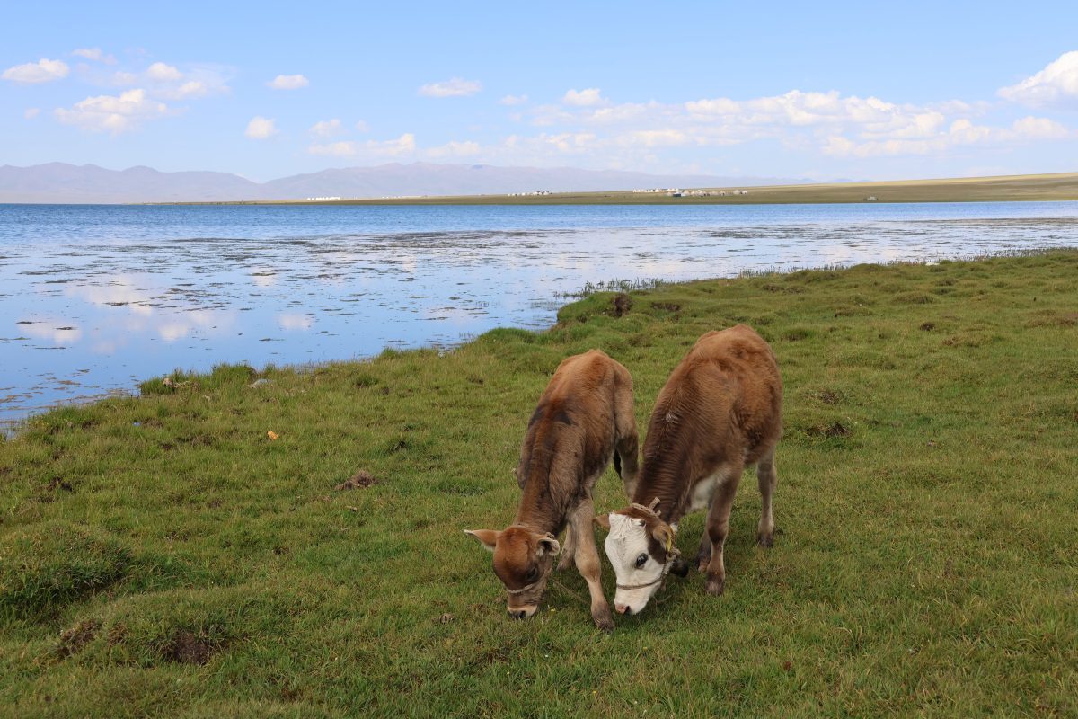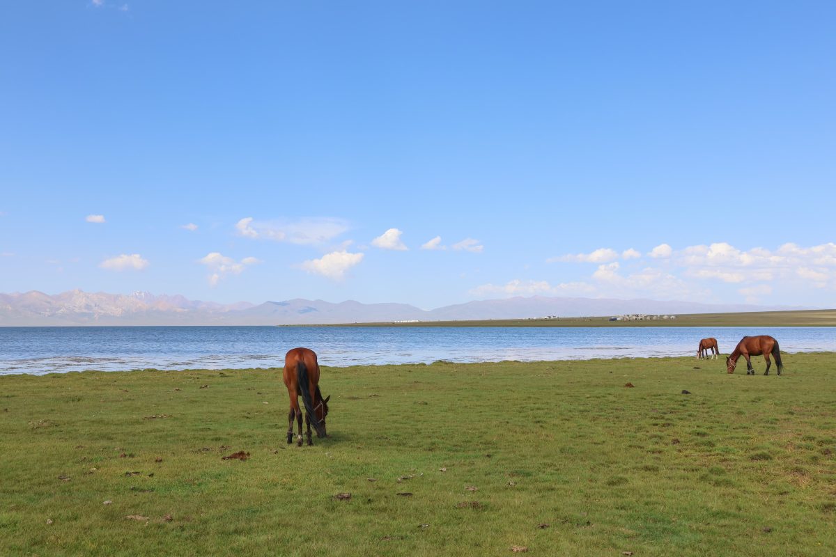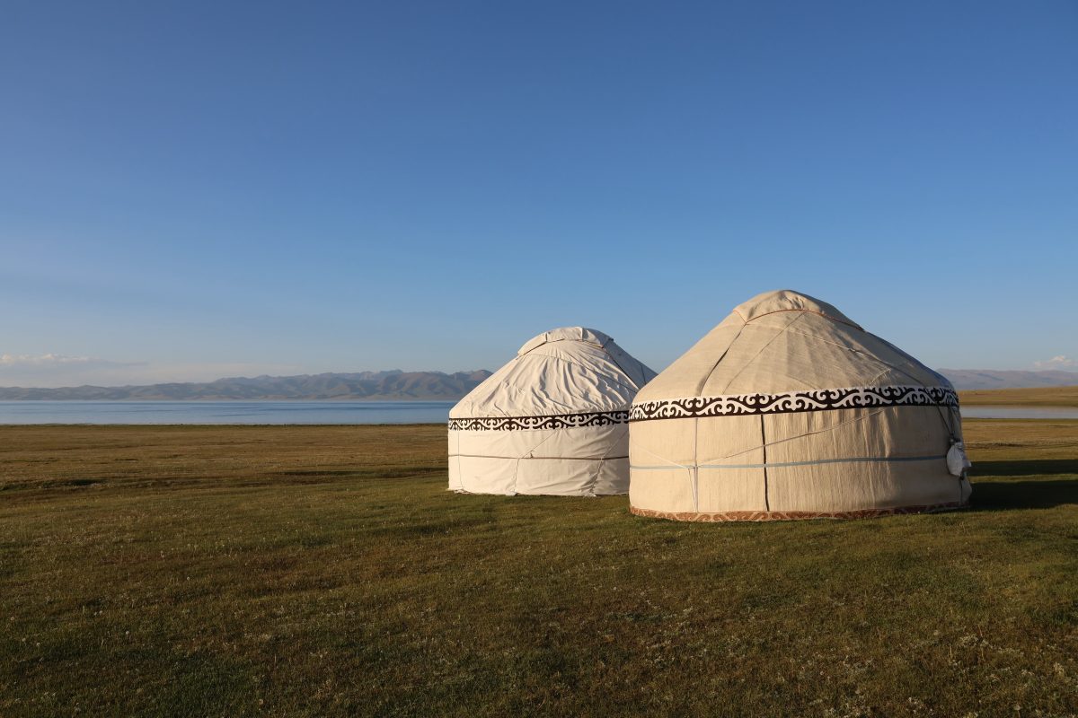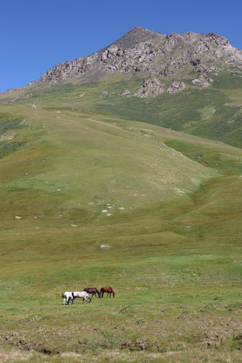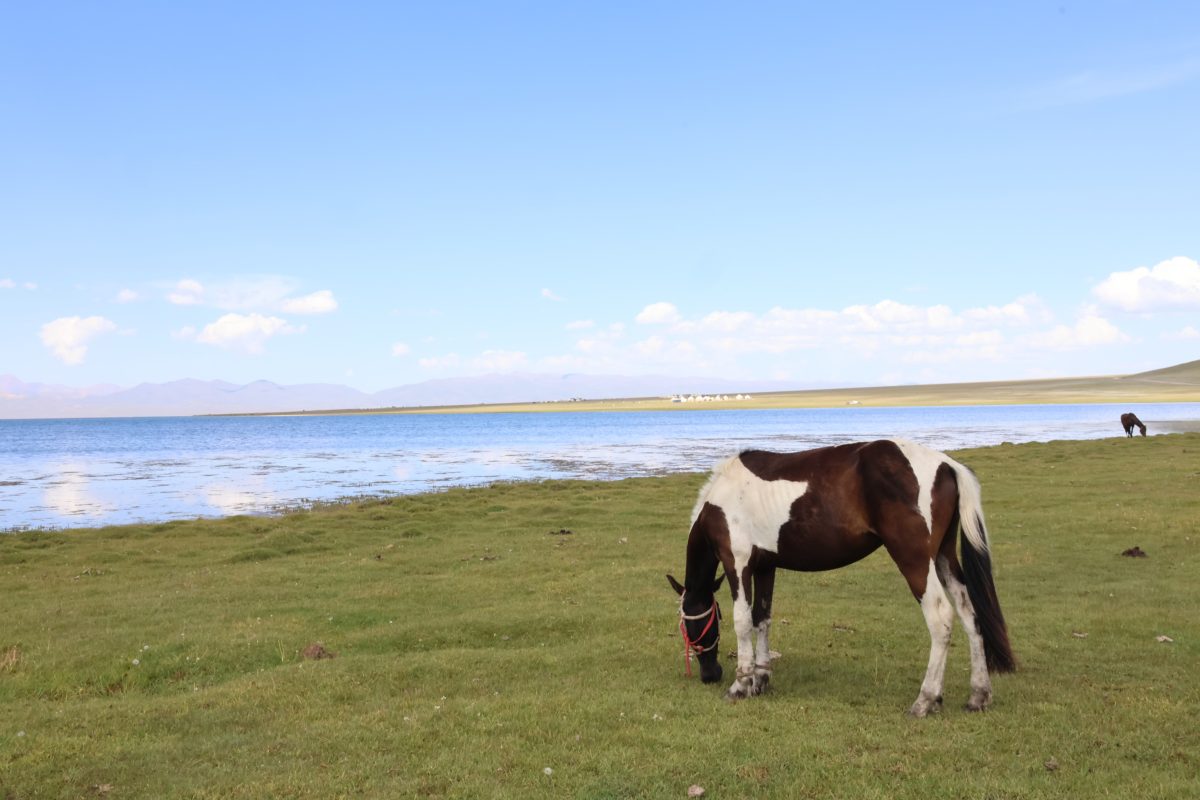 Le lac Son Kol est situé à 3000m d’altitude dans le massif du Tian Shan, c’est un lac d’altitude où la nature tutoie les camps de yourtes. Le lac est considéré comme la plus grande réserve d’eau douce naturelle du pays. En toile de fond, les sommets de 4000m qui sont le refuge de nombreuses espèces d’oiseaux mais aussi des loups, des renards, des marmottes et des léopards des neiges. Les pâturages environnant sont remplis de moutons, chèvres, vaches et chevaux qui sont en estivage. Notre camp de yourtes se trouve directement au bord du lac avec en son centre une plus grande yourte en guise de restaurant. Là, encore difficile de choisir qques photos…