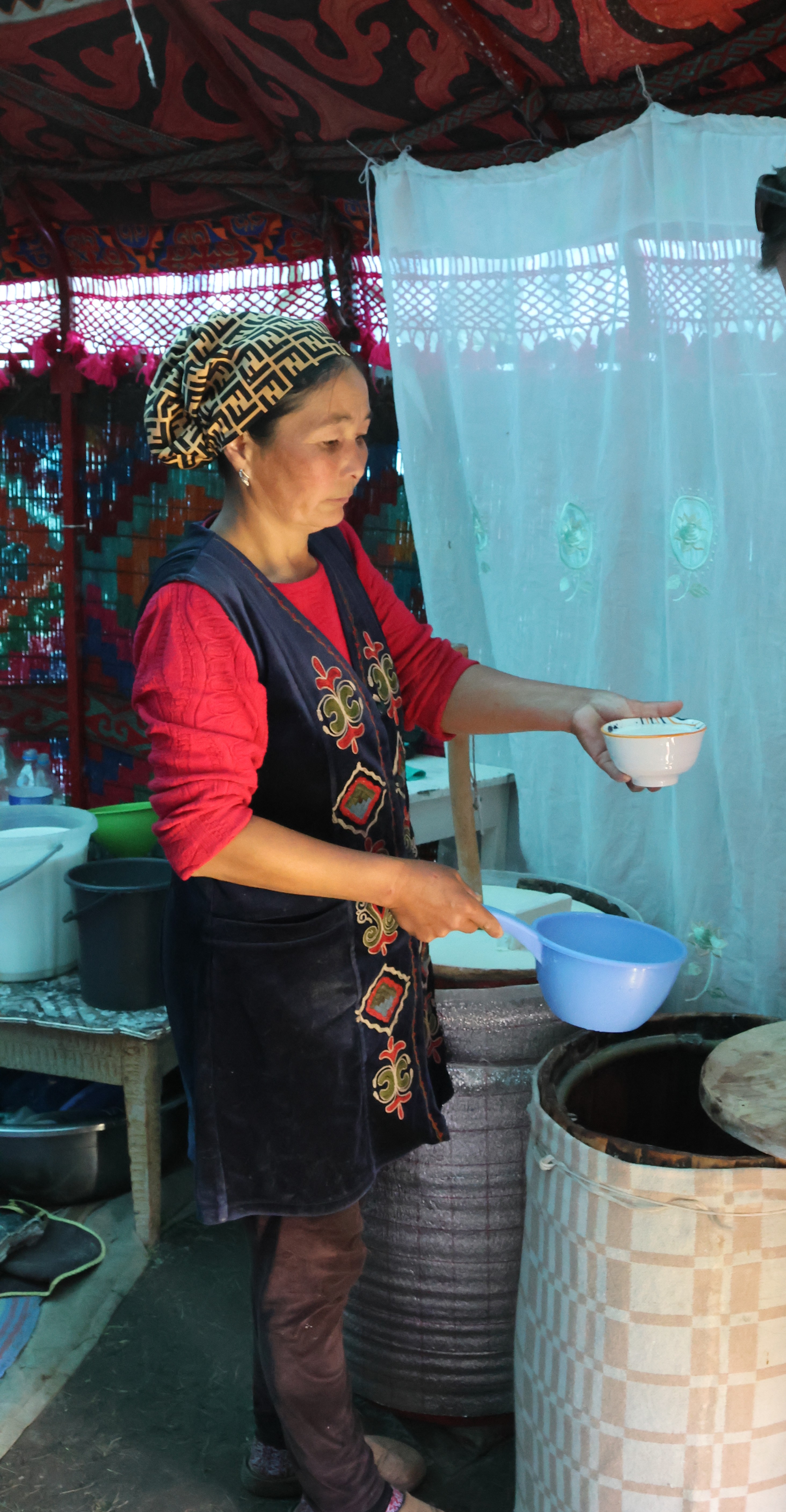Nous laissons la grande dame contempler d’autres voyageurs et nous faisons un stop pour le repas de midi dans une famille dougane. Les Dounganes sont une ethnie chinoise de confession musulmane, isus du peuple Hui, qui a fui la Chine en passant la chaîne de montagne de Tian shan pour se retrouver dans les anciennes républiques soviétiques, à la suite de la Guerre des minorités Hui au XIXe siècle.