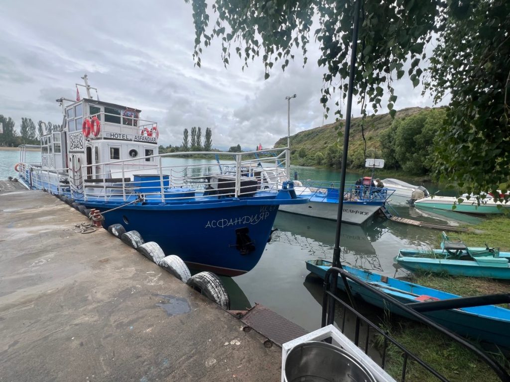 Après le repas, visite de la ferme : jardin, écuries avec élevage de chevaux, de vaches, de moutons et de chèvres. Et un magnifique cheval aux yeux bleus. Ensuite retour à Karakol où ils sont montés à bord d’un bateau pour une balade sur le lac Issyk Kol avec en fond la fameuse chaine de montagnes Tien Chan, mais malheureusement sous la pluie.