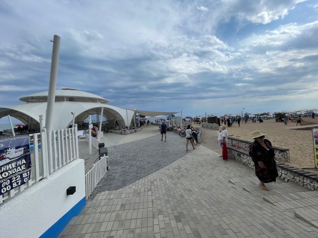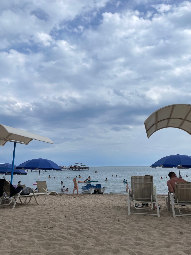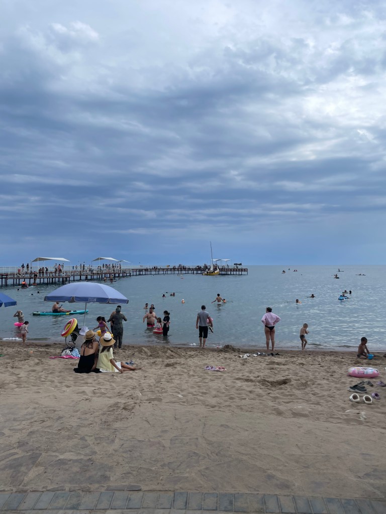 Quelques minutes après nous atteignons notre immense hôtel et prenons nos affaires de plage. En descendant en direction de la mer, nous constatons qu’il y a des dizaines d’allées bordées de maisons de vacances. Et quelle ne fût pas notre surprise de tomber sur une plage qui n’a rien à envier aux plages italiennes de la région de Rimini. Parasols et chaises longues à perte de vue, restaurants, bar à la musique moderne, tous les ingrédients étaient là. Sauf peut-être la chaleur de l’eau du lac qui se situe à 1’607m.