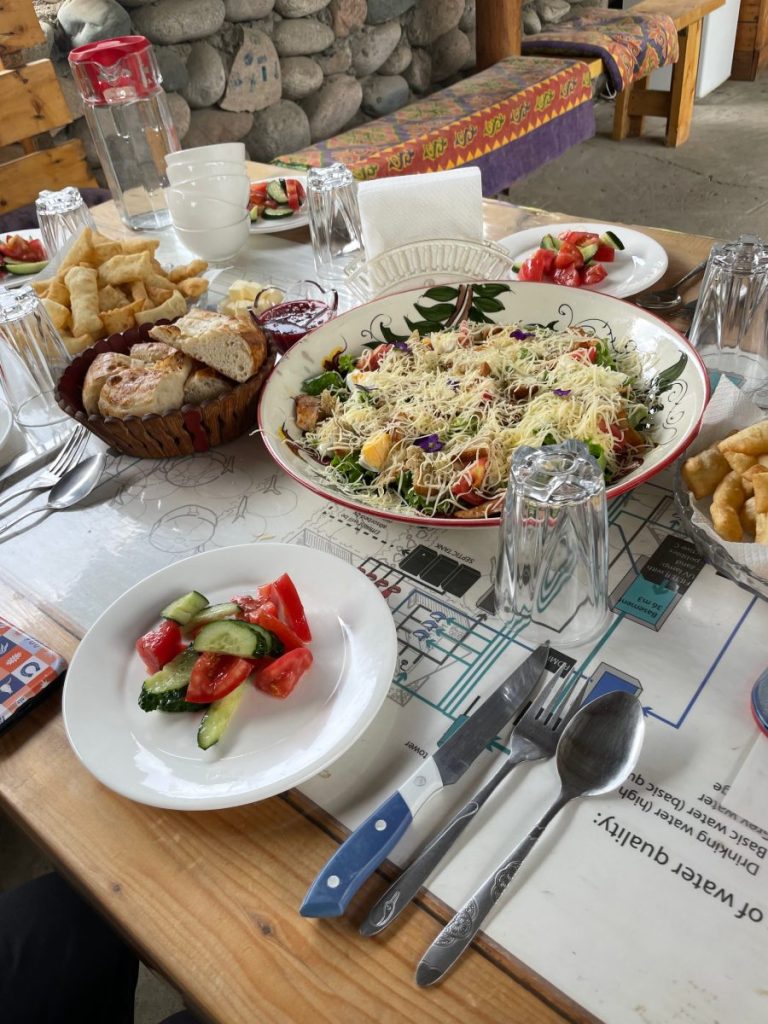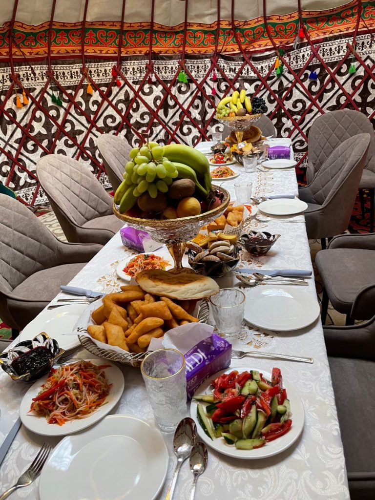 Traditionnellement les convives s’assoient parterre et mangent sur des tables basses, là manifestement ont mange plus à l’européennes. Les tables kirghizes sont alléchantes… plus il y a de nourriture plus l’hôte est respecté. Donc vous retrouverez sur toutes les tables kirghizes le « kaimak », crème fraiche maison, et les « boorsok », des petits pains fris, ainsi que du pain, de la confiture maison et du miel. Souvent aussi de grands présentoirs avec des fruits des bonbons et des biscuits.