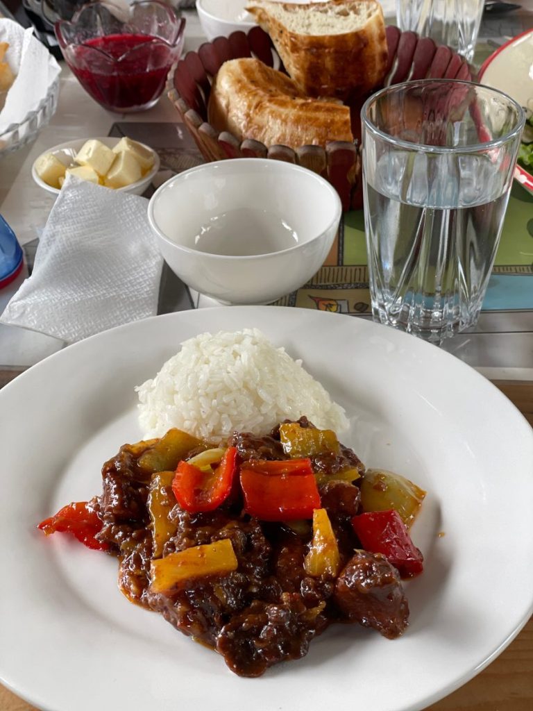 Puis nous passons à table, avec le fameux bortsch russe, soupe de betterave rouge avec du chou et des carottes, puis un poulet grillé avec du riz et comme légume … des pommes de terres nous sera servit avec des fruits du jardin en dessert.