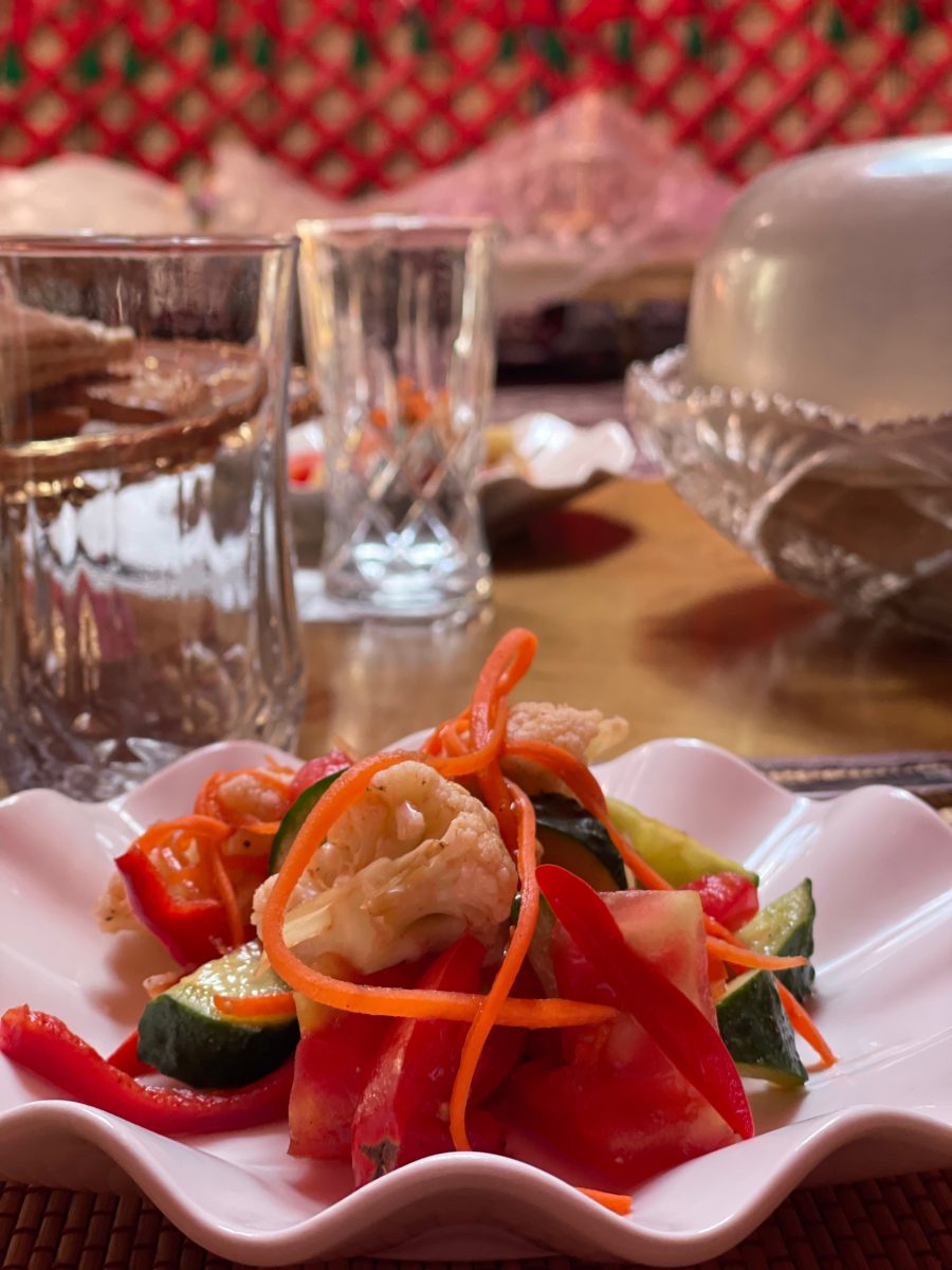 Ensuite vous sera servit des salades, souvent des concombres et tomates et des légumes grillés, puis le plat chaud est placé dans une grande assiette au milieu de la table. Il est de coutume de manger directement dans ce plat commun avec de grosses cuillères, généralement vous n’aurez pas de couteau à table. Mais les familles habituées à accueillir des touristes servent le repas dans des assiettes individuelles.